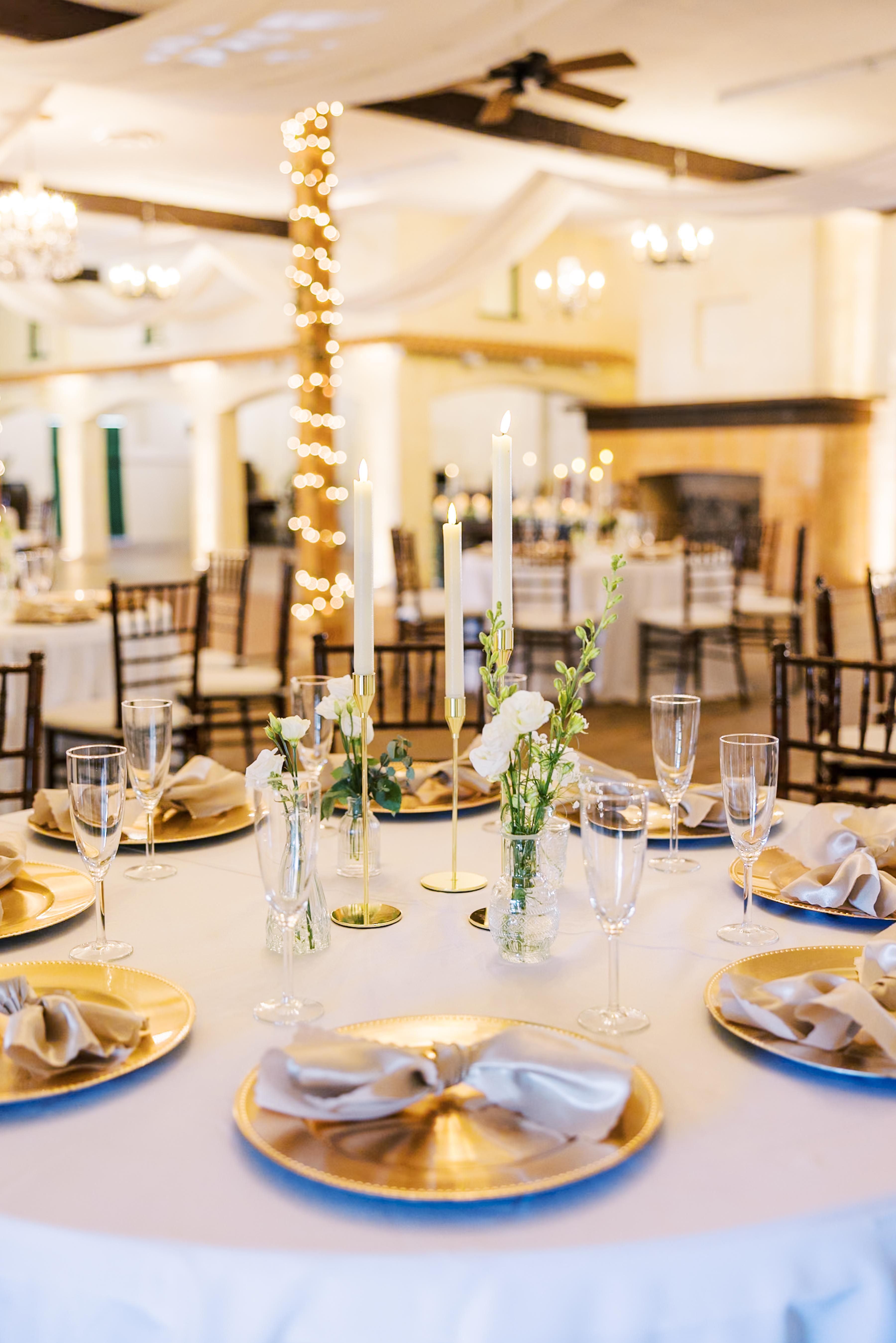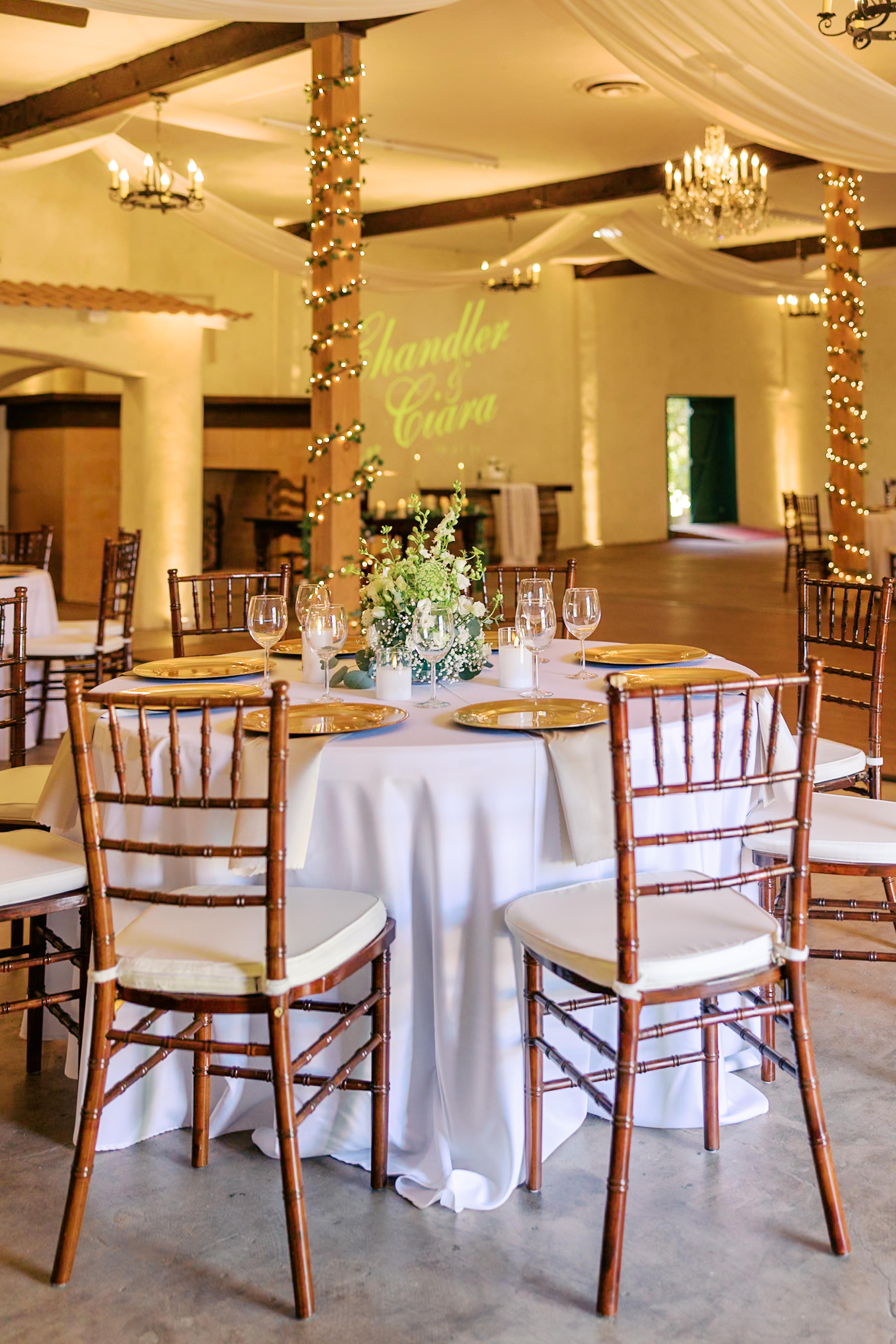 Bridal suite Dark maple dance floor Mahogany Chiavari chairs 60" round tables White linens and gold charger plates Professional sound system Custom uplighting Dance floor lighting Optional digital monogram Optional photo booth