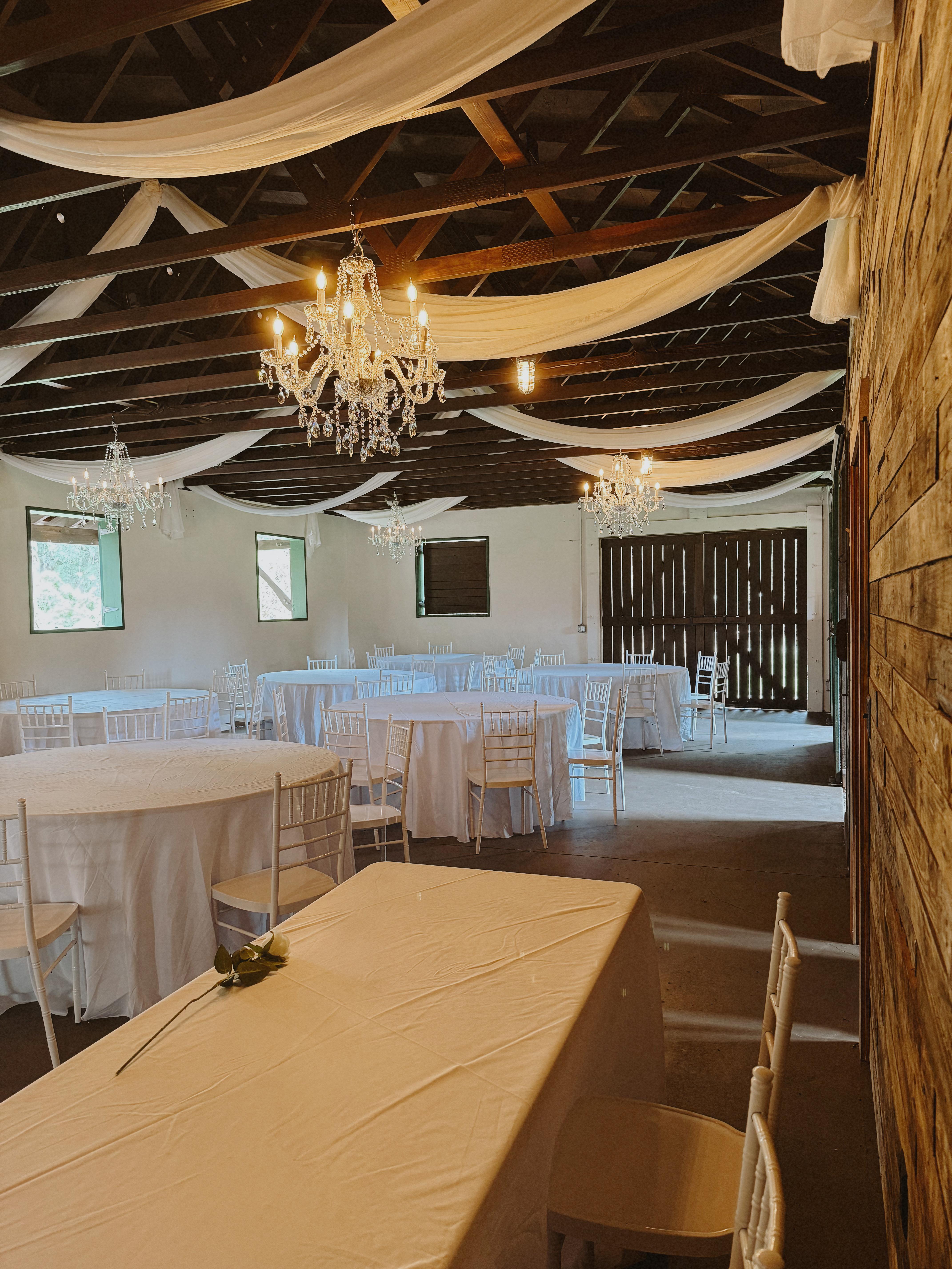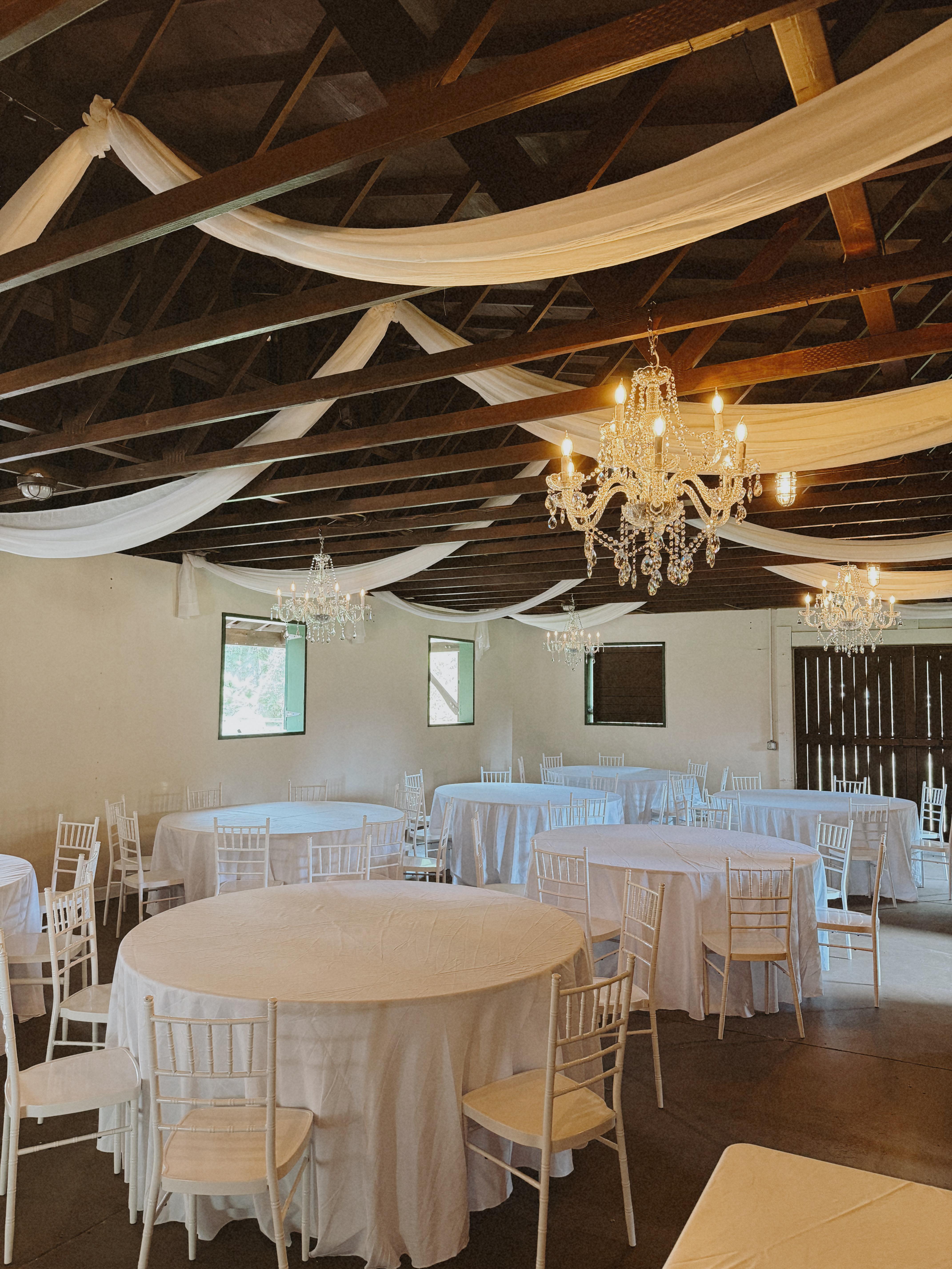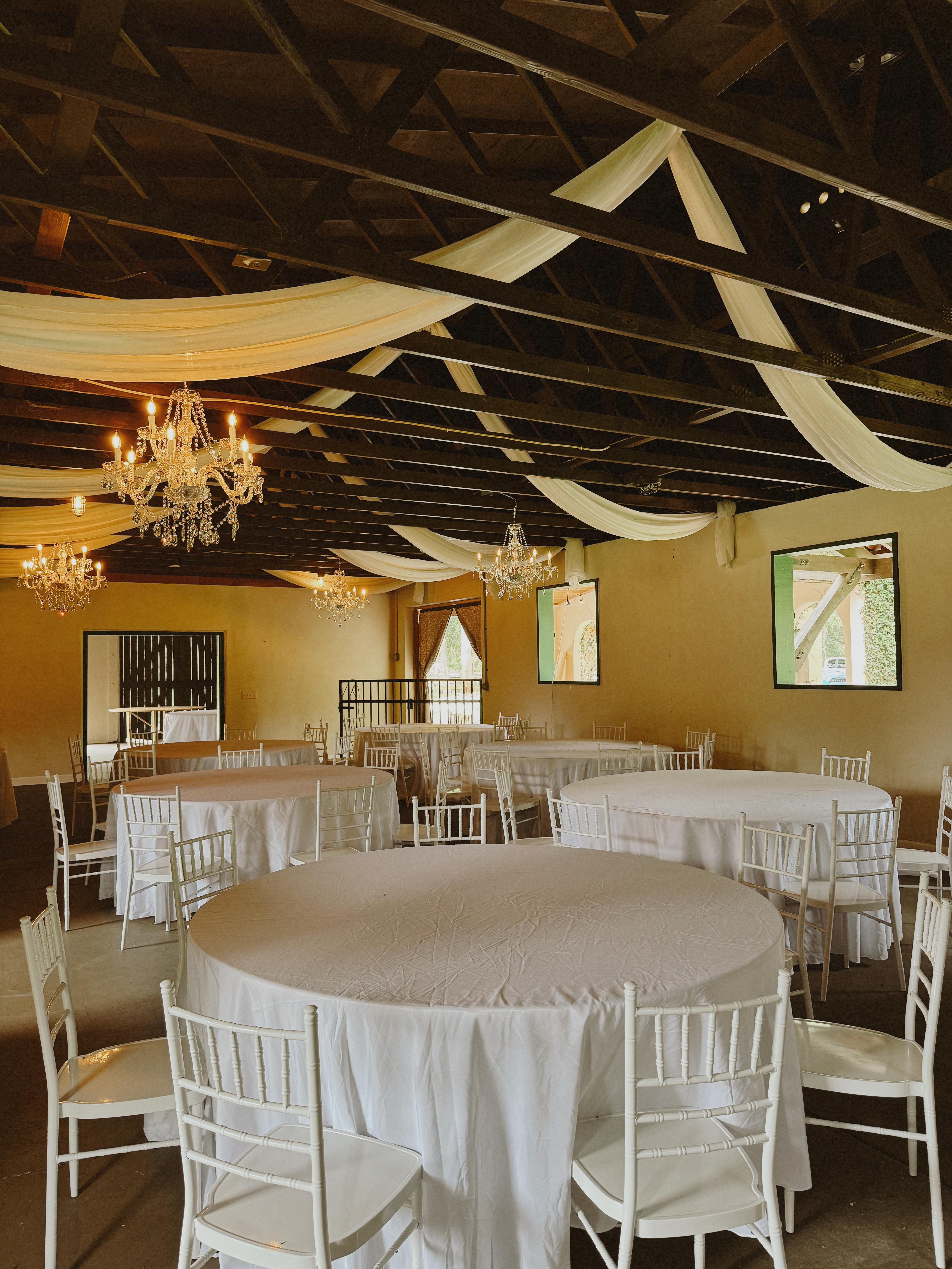 Once a working stable, now a beautifully reimagined space with warm hardwood floors, flowing drapery, round tables, and elegant white Chiavari chairs. The original stable doors remain for a touch of rustic charm, creating a timeless setting that perfectly blends history and elegance.