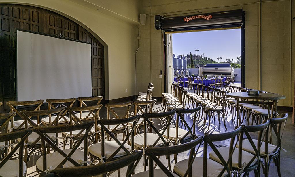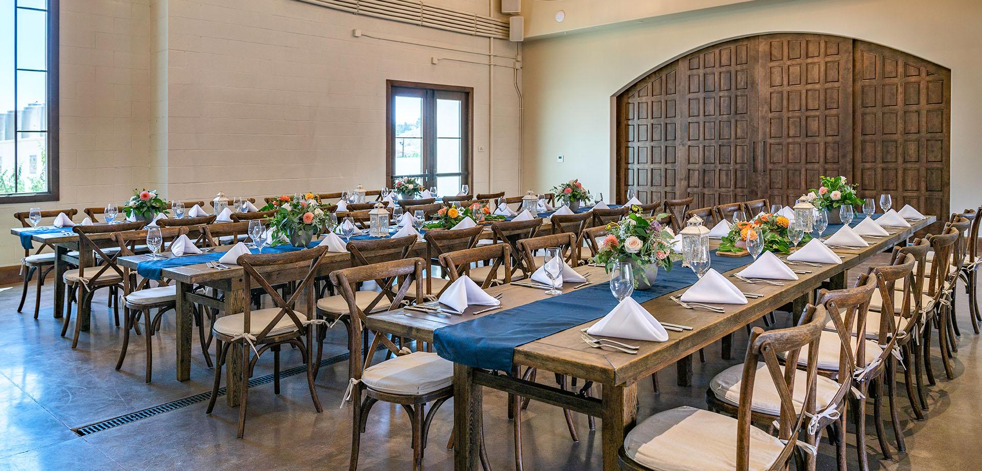 The Barcelona barrel room is an authentic Spanish-style building complete with vaulted ceilings, plenty of natural light and the pleasing perfume of beautifully aged wine. This well-designed space can be easily adjusted to best fit the size and function of your party, and is a setting your guests won’t soon forget. It consists of 2 contiguous rooms the Barrel Room (957sq’) and the Fermentation Room (580sq’) totaling 1537 square feet. Bolero is a working winery and guests will enjoy the rustic, industrial but intriguing, feeling of the barrels and tanks.
