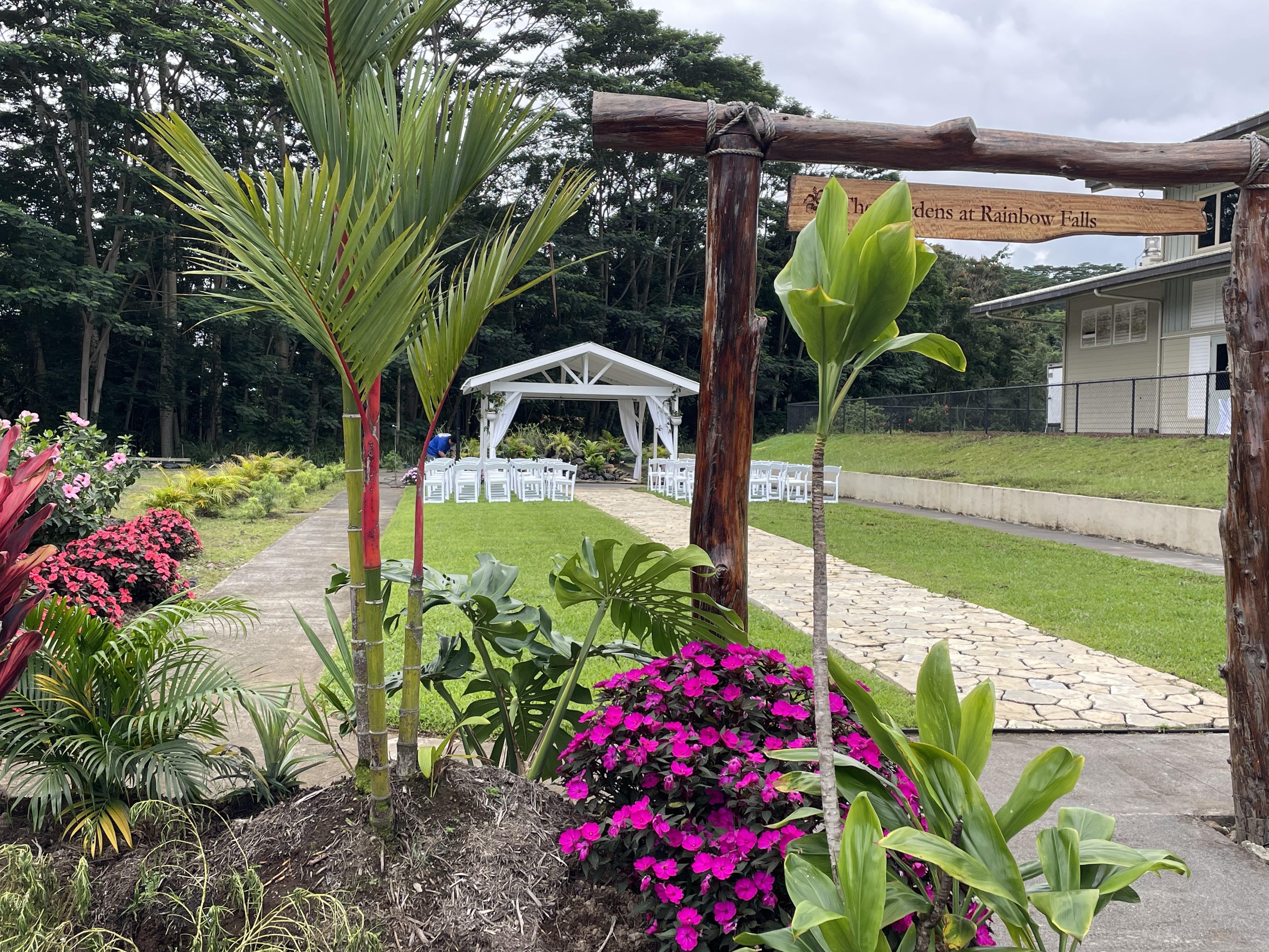 Located across from Rainbow Falls, the Event Center at Arc of Hilo is a premier wedding g venue offering onsite outdoor and indoor wedding facilities. We can host up to 225 guests for reception in air-conditioned comfort with white linens, lighting and premier sound; our outdoor wedding venue offers seating for a ceremony of up to 200 guests, with white wedding chairs, manicured lawn, gardens, gazebo and water feature. Ample parking, free ice, and access to our commercial kitchen is included, as well as all set up, clean up and complimentary white linens in every package. A sound tech, premier sound system, and custom lighting for your event is available, and our preferred catering partner is available to provide a menu and quote, although you’re able to use any caterer you wish. Our Events Director will handle all your event needs, including layout and help with referral to a variety of vendors we use, including decorators and bands. Call today!
