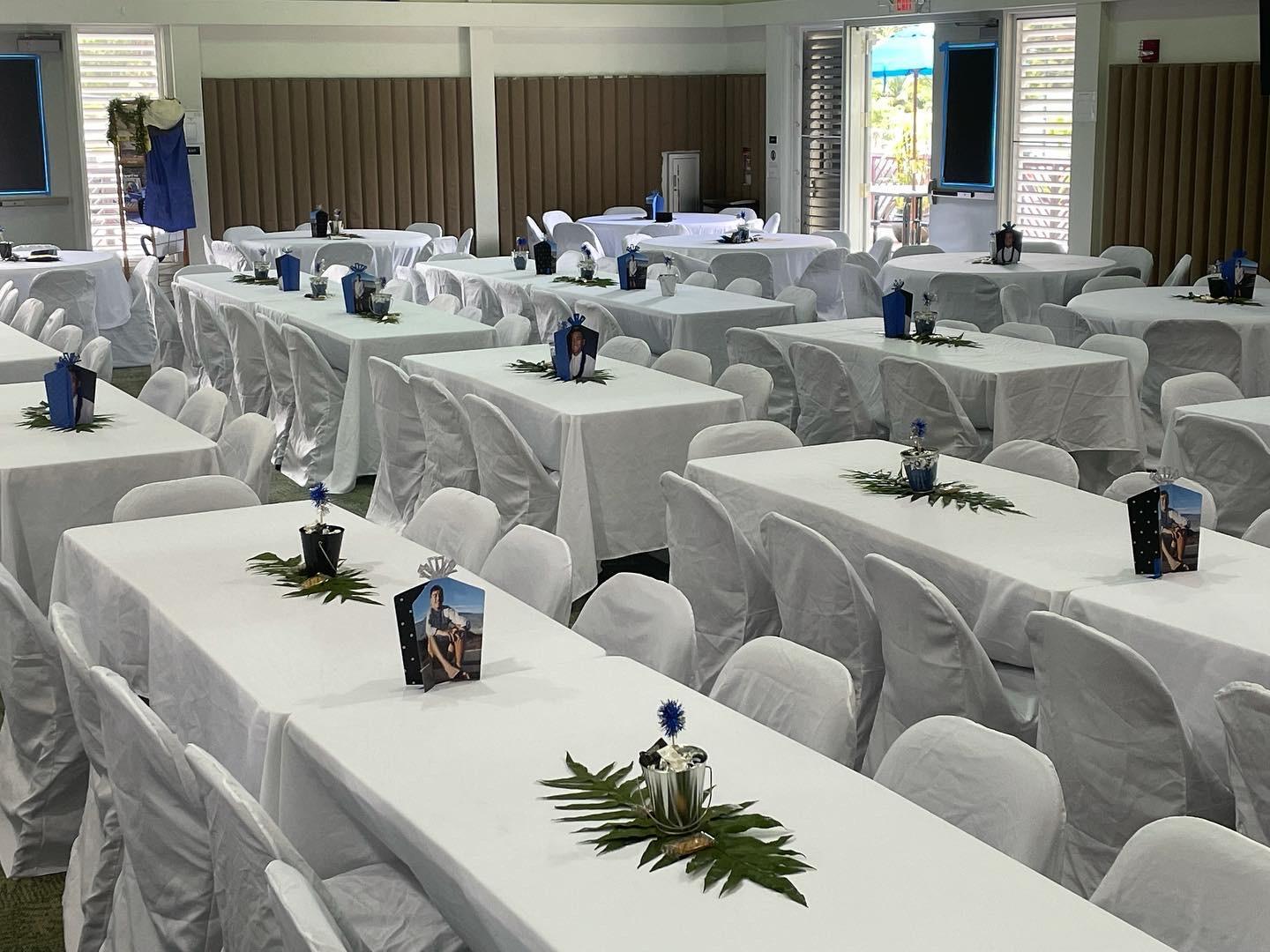 Custom lighting Premium sound with sound tech Large wall-mounted screens Air-conditioning White linens Round or rectangular tables, chairs Free ice Spacious lanai Access to commercial kitchen