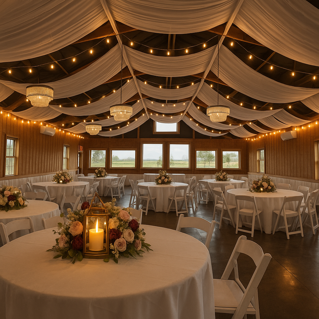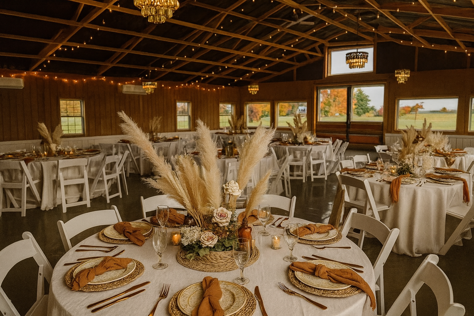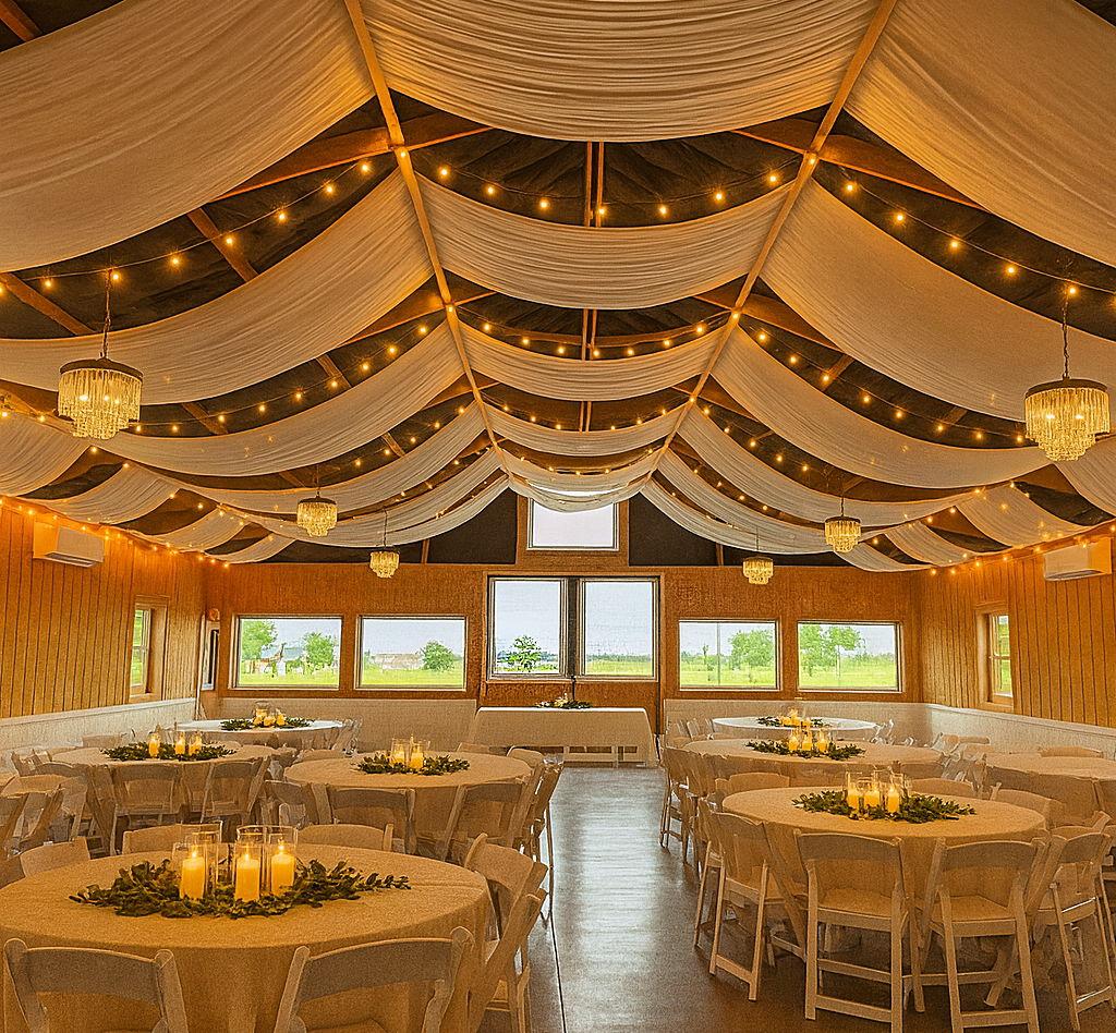The event center at Maple Lane Farm is a sophisticated countryside hall, blending scenic elegance with the timeless charm of a country estate. With chandeliers, wood accents, and polished floors, it offers a refined backdrop for receptions and celebrations. Designed as a versatile blank canvas, the space adapts to timeless, modern, boho, or unique décor, bringing your wedding vision to life in an atmosphere that feels elegant, welcoming, and unforgettable. Beautiful updates coming for 2026!