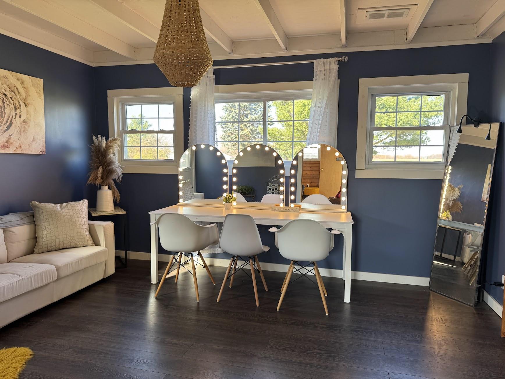 Included with the event center are polished tables, comfortable chairs, and setup and breakdown provided by our team. Guests enjoy indoor restrooms, a catering prep-kitchen, and moveable barfronts, plus climate control and ample parking. The space also features a covered porch and sliding barn doors, creating effortless indoor–outdoor flow and a versatile setting designed for comfort, convenience, and celebration.