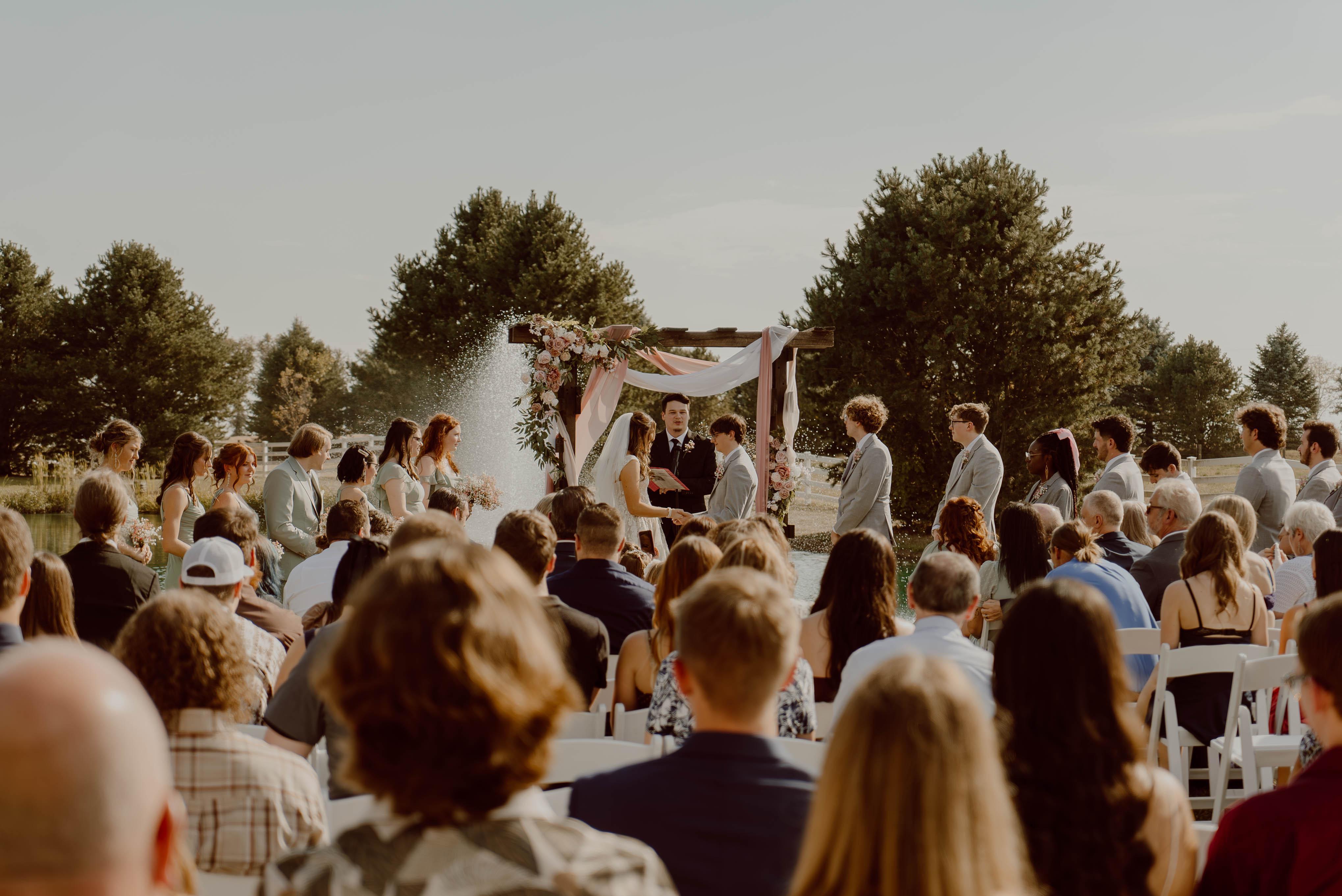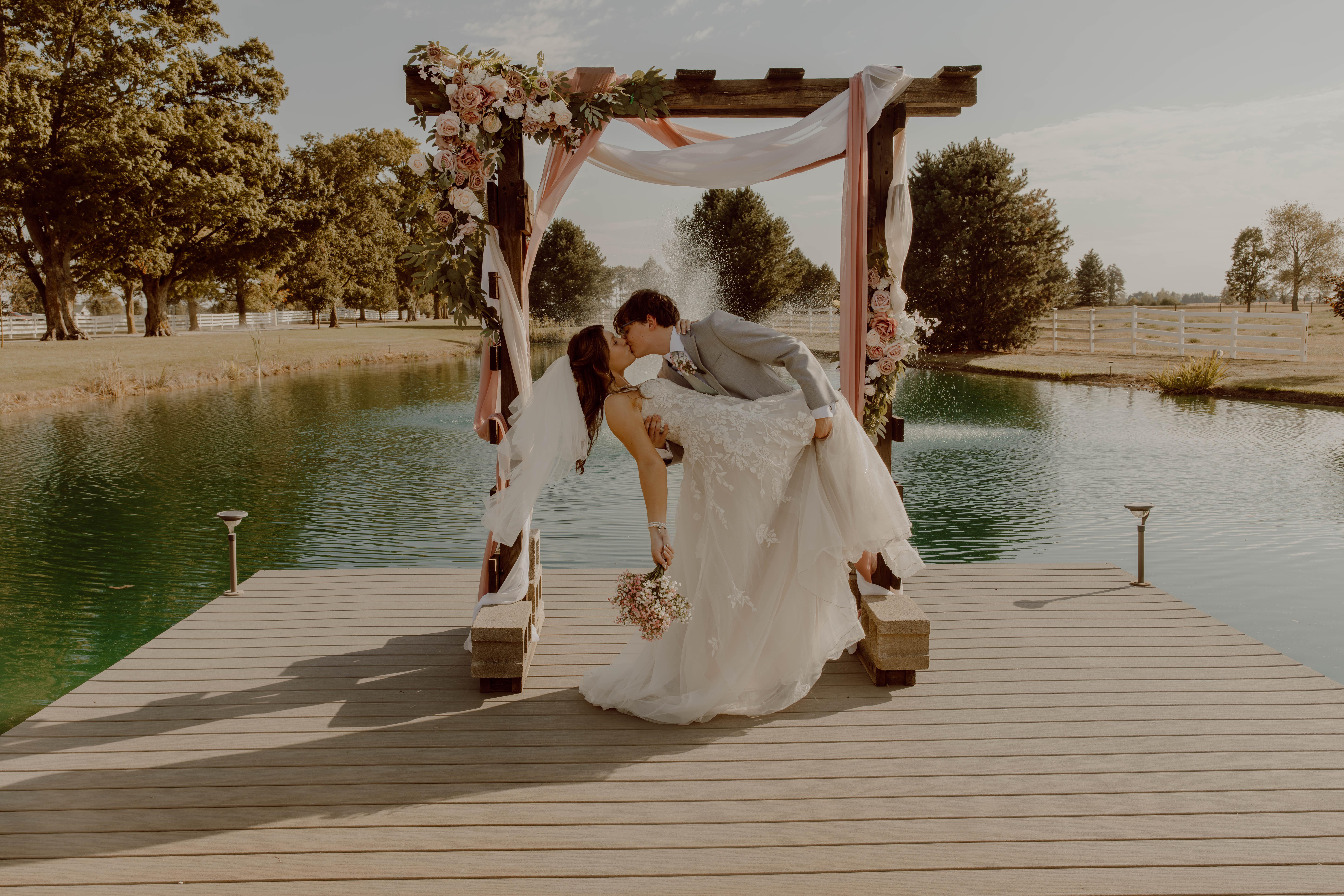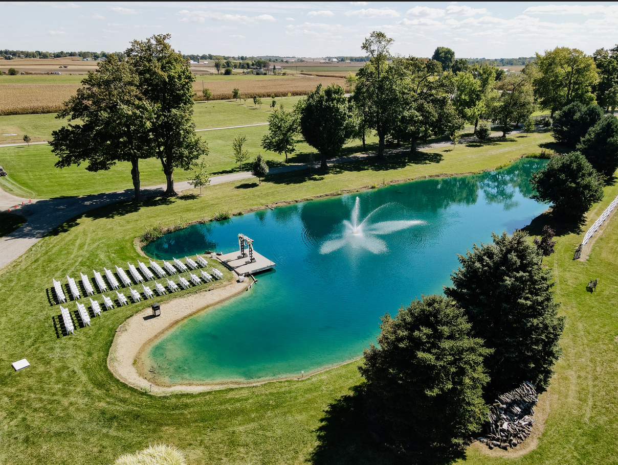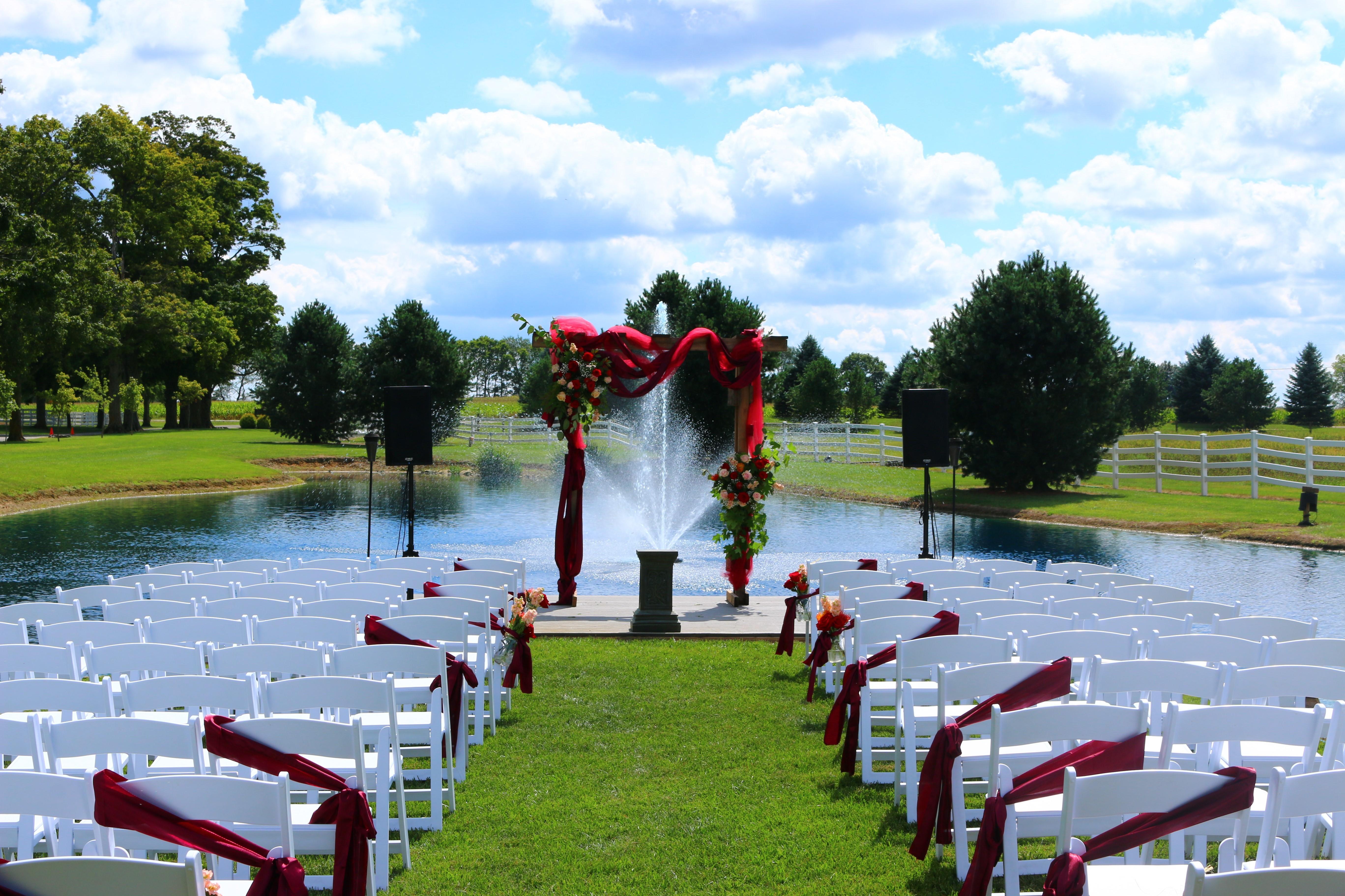 he dock at Maple Lane Farm offers a romantic waterside setting for your ceremony. Overlooking a sparkling pond with a graceful fountain, it provides a serene backdrop for exchanging vows. Included with this space are guest chairs, access to power, and a complimentary ceremony arch. A nearby cabana serves as a private holding space for you and your party before the walk down the aisle, ensuring comfort and ease.