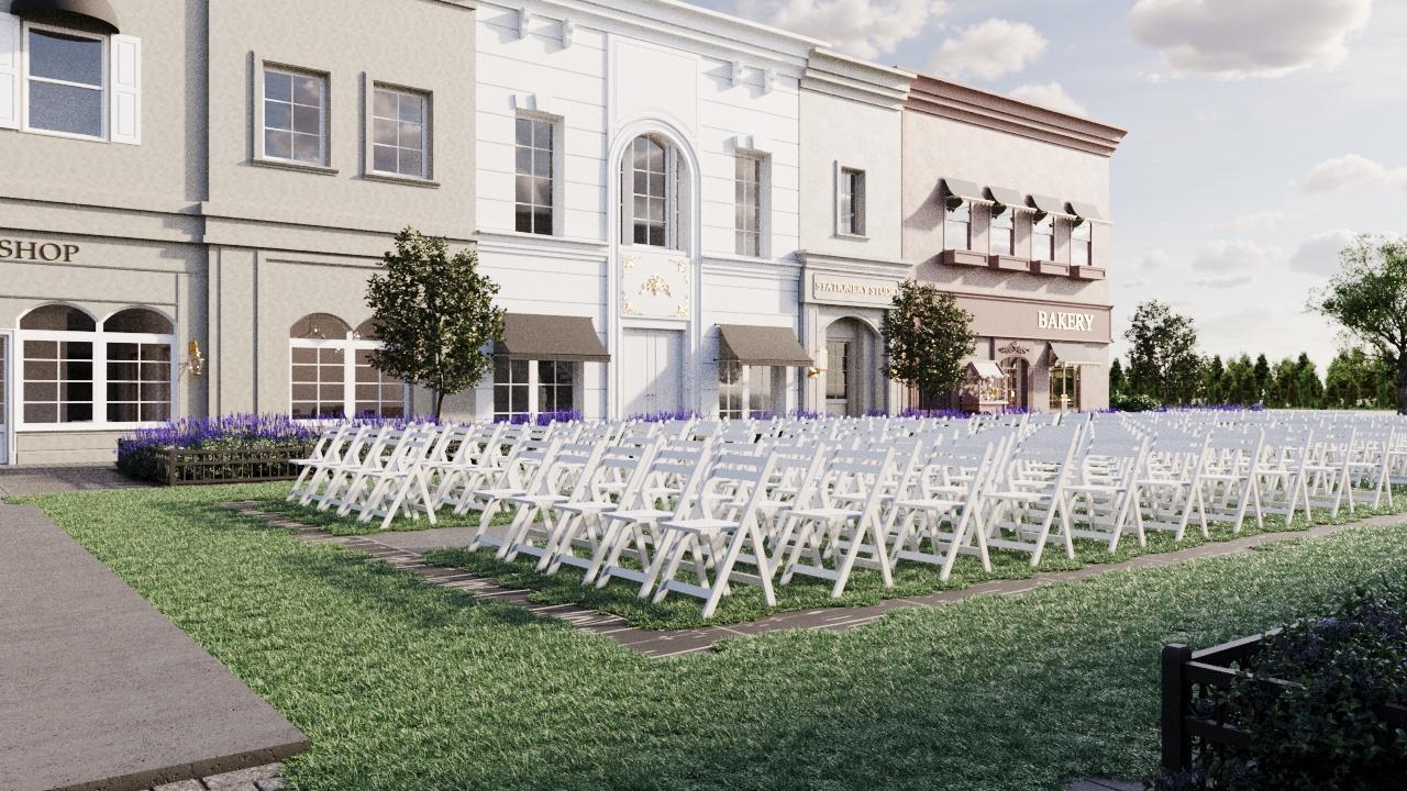 Strung with a canopy of twinkling string lights. The synthetic grass aisle and the water feature backdrop will be the perfect setting to say "I Do" in front of your friends and family. *Please note that our renderings are conceptual and could be updated during construction. The designs are an example to give you the overall feel/aesthetic of the place.