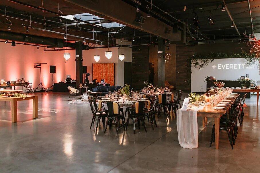 Located in the heart of Portland's trendy Pearl District, Everett West is a modern-industrial event space that can be transformed into anything imaginable. The space features poured concrete floors, reclaimed wood accents, gorgeous chandeliers and 18' ceilings with skylights. We also have secluded private patio perfect for ceremonies and cocktail hour.