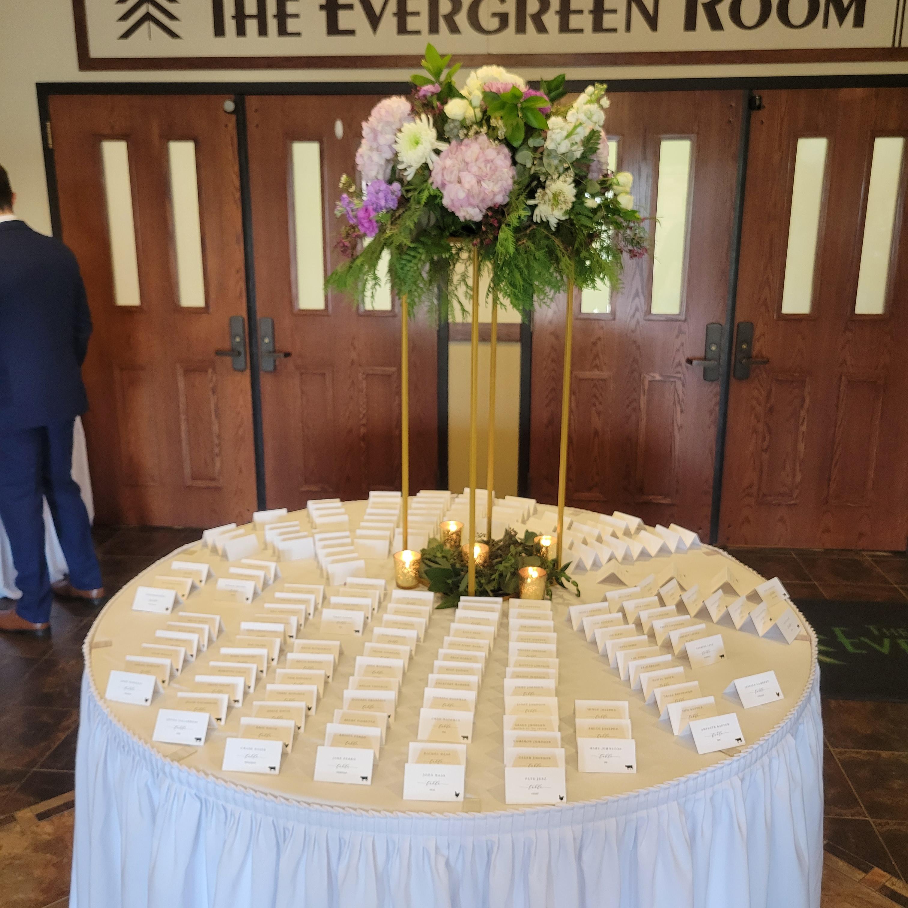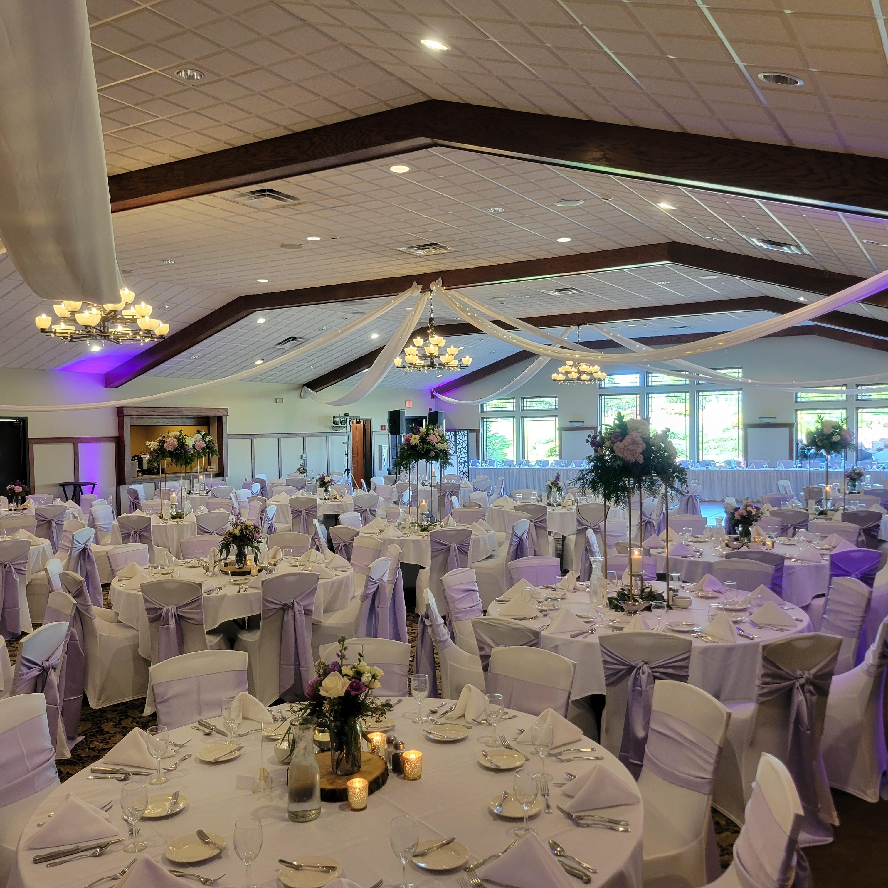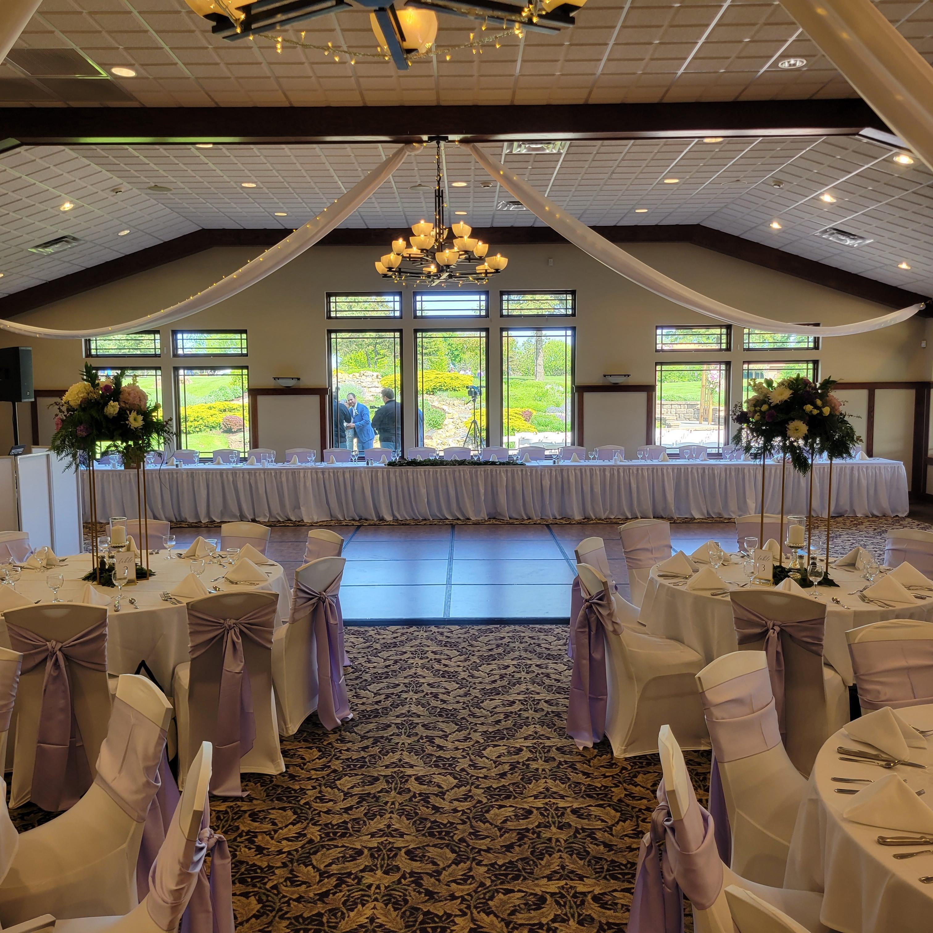 The Evergreen Room, our banquet facility, is nestled in a beautifully landscaped hillside. The room features 15 ft. vaulted ceilings, cherry stained wood accents, and large windows that overlook our 27-hole golf course. The room can hold up to 250 guest for a plated reception or 220 for a buffet reception. Attached to the room is The Pub Bar. This large bar is penninsula shaped and served from 3 sides. There are several tables in the surrounding area for guests to easily gather around. You and your guests will have access to our spacious patio where the views of the golf course continue. This space can also serve as the perfect back drop for an on-site ceremony. The Evergreen Room offeres an adjoining Bridal Suite. This serves as a great place to get ready, have a secure place for your personal belongings, or just a private area to retreat when desired.