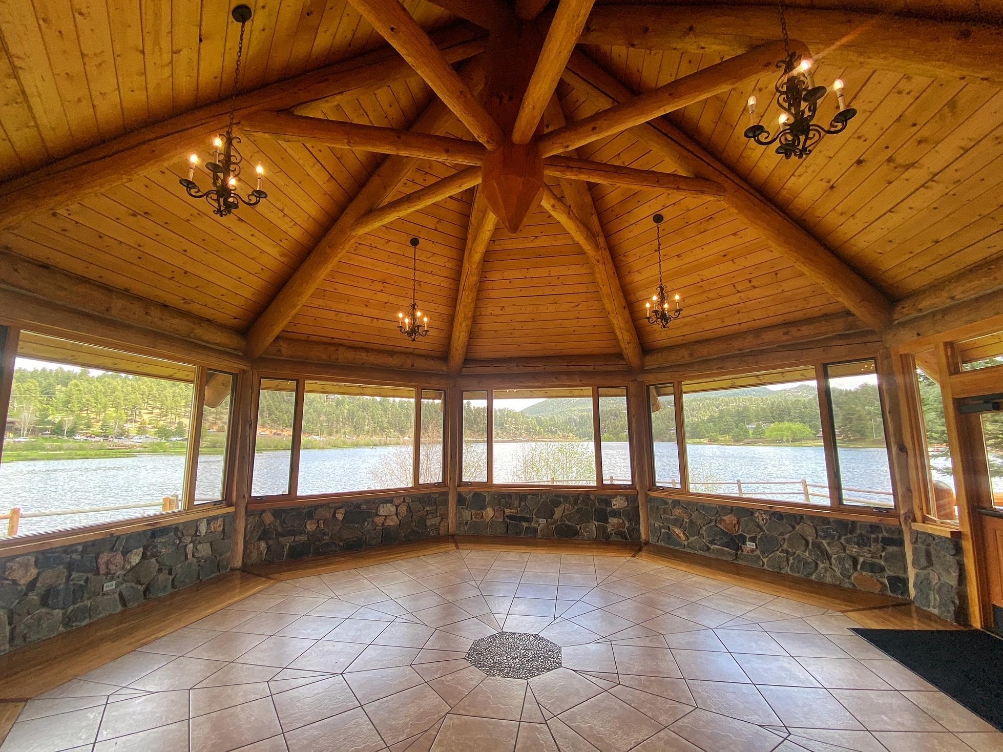 Evergreen Lake House is a beautiful rustic log cabin perfect for wedding ceremonies, receptions, and rehearsals. Nestled in the foothills of the Rocky Mountains and overlooking the beautiful Evergreen Lake, this 5,000-square-foot lodge integrates the charm of an intimate celebration into a warm ballroom-like spaciousness. The Great Room, which seats up to 200 people, is fitted with a large stone fireplace and several floor-to-ceiling glass doors that provide easy access to the spectacular view beyond. The smaller Octagon Room has seven windowed sides– so no matter where you are inside, the scenic outdoors are never hidden from view! For outdoor ceremonies, the deck seats up to 100 people (with additional standing room). The deck features log railings and a flagstone step down to the grassy lawn. We host weddings year-round: enjoy the warmth of late-July sunsets, the abundance of golden aspens in September, or the fairytale snowfalls in January at Evergreen Lake.
