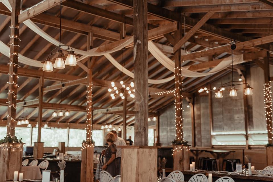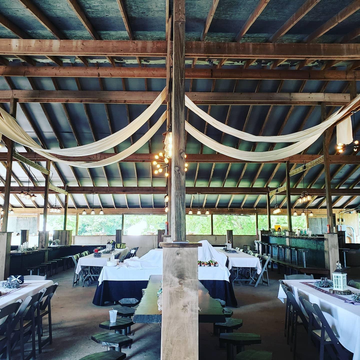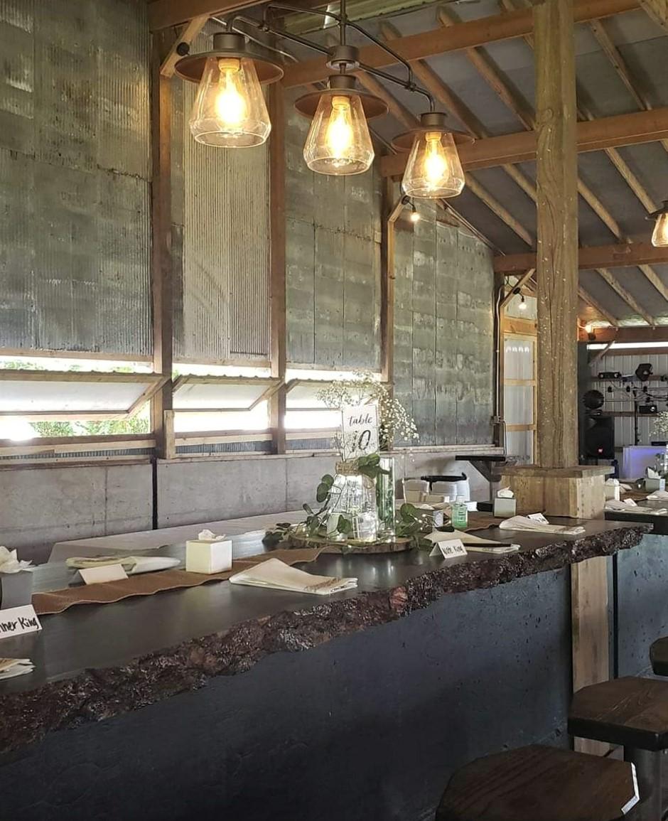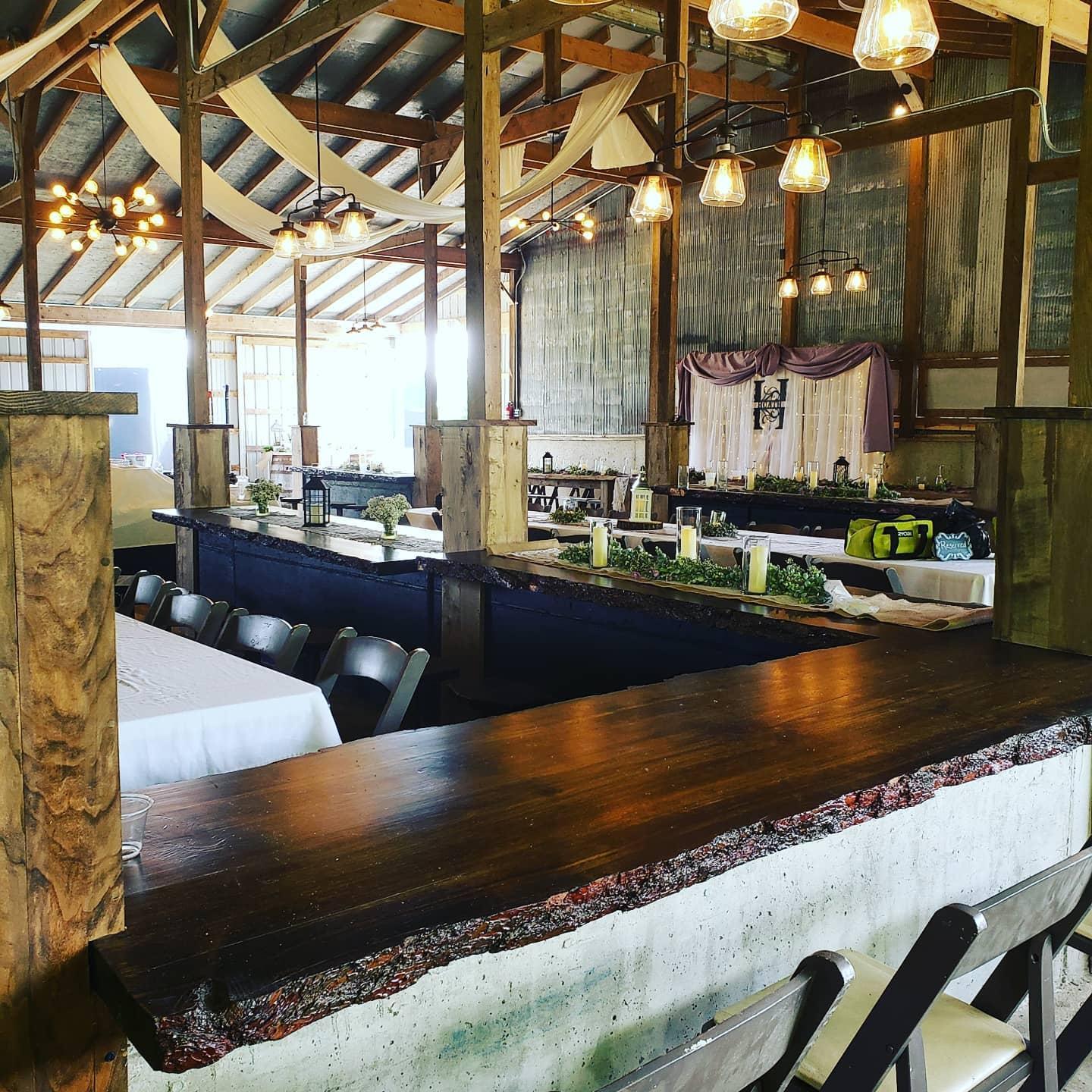 Men and Women Restrooms with A/C, Bridal Suite and Groom Room, tables and chairs for up to 250 people for ceremony and reception, 9 live edge stationary wood tables, 83 stationary wood barstools, 4 bar height tables with 16 metal barstools, ceremony arch, ceremony doors, whiskey barrels, Wire spool table, 10 ft head tables, 5ft sweetheart table, metal troughs for beverage storage, lawn games, Caterer of your choice, Liquor and beer can be served either by licensed/certified bartender