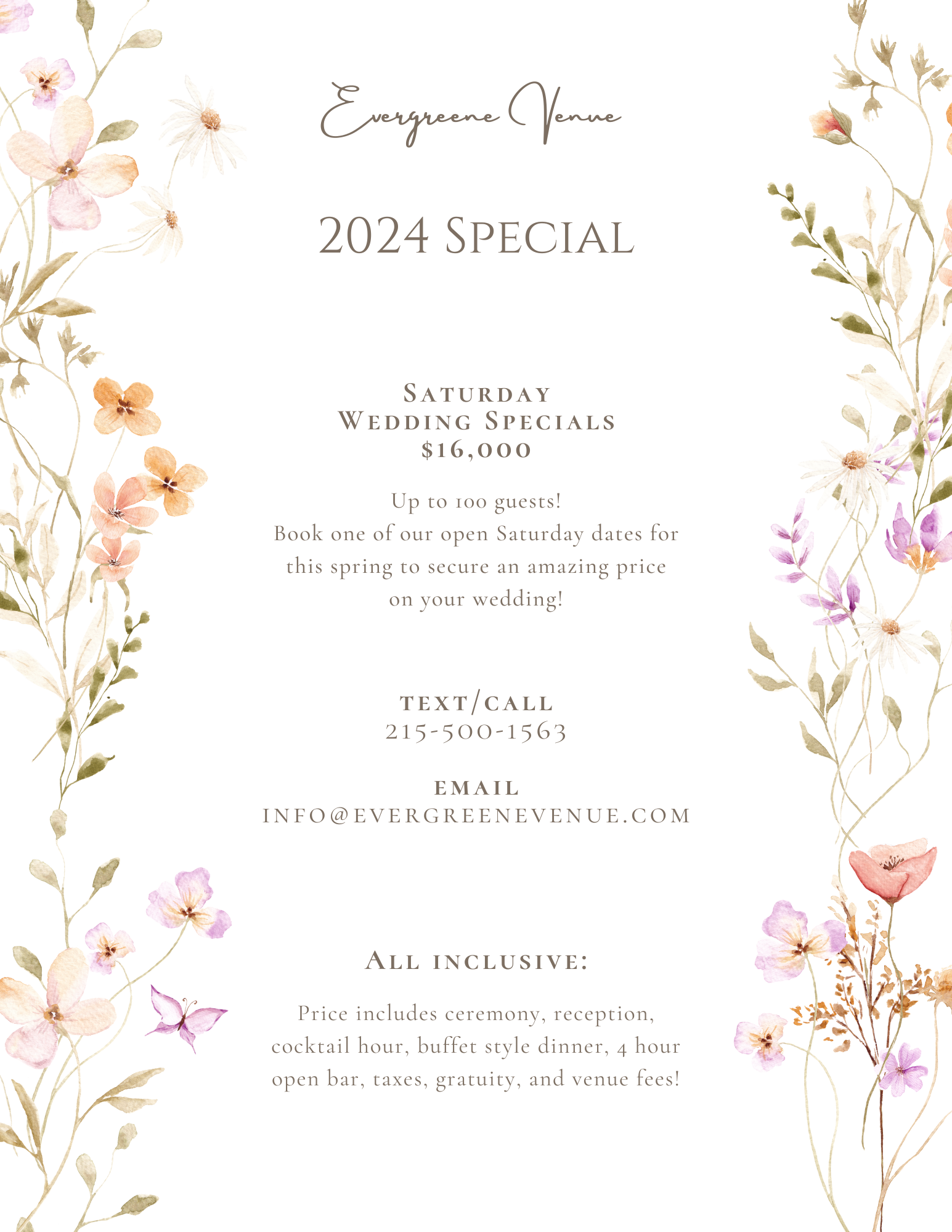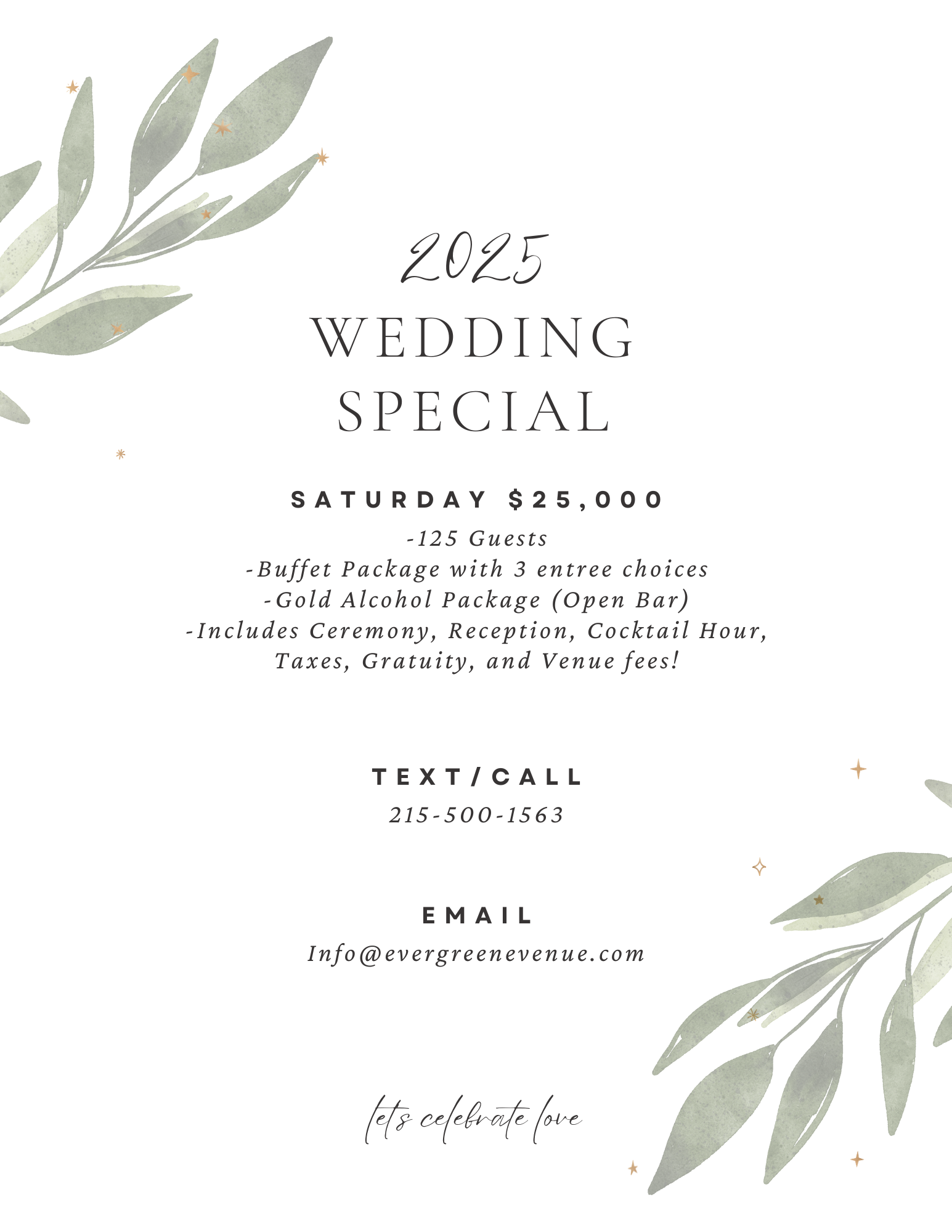 Our 2025 Saturday Special includes: -Buffet Package with 3 entree choices -Open Bar with our Gold Package inclusions -Ceremony, Venue, Taxes, and Service Fees