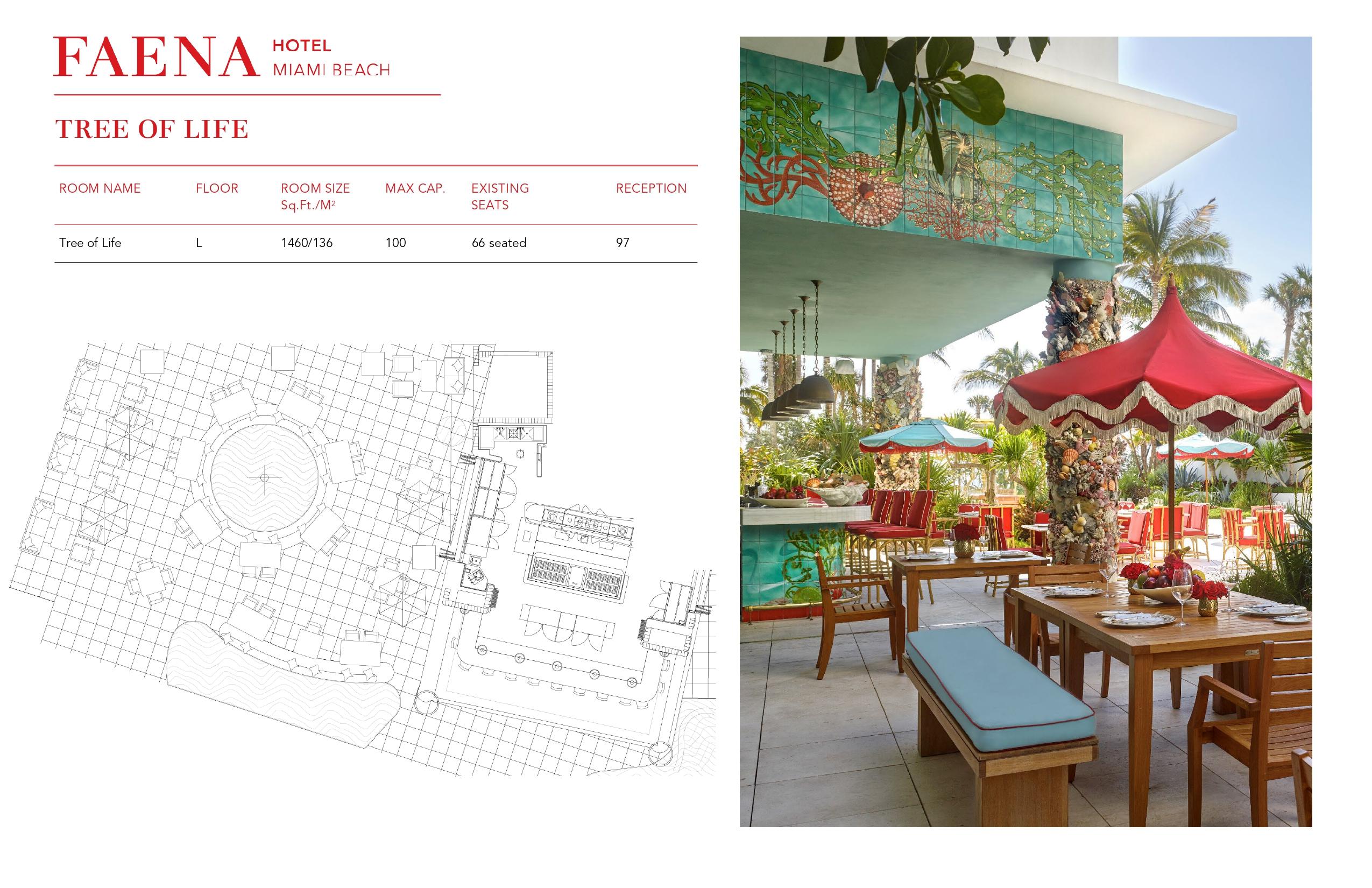 Revolving around Faena’s three-story Tree of Life, the courtyard offers a relaxed outdoor setting, hand-painted mosaic seating at the Sun Bar and light fare set in the hotel’s lush tropical gardens.