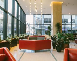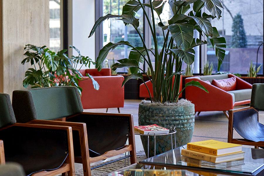 The Fairlane Hotel was inspired by the preeminent international style of the building’s original interior and exterior architecture as the Nashville headquarters of the now-defunct Fidelity Federal Savings & Loan. Terrazzo flooring, original wood paneling and travertine columns, brass elements, interior plants, open floor plans, and a green, brown, and crème color palette are timelessly presented with a modern take on the prominent style of the 1960’s and ’70s