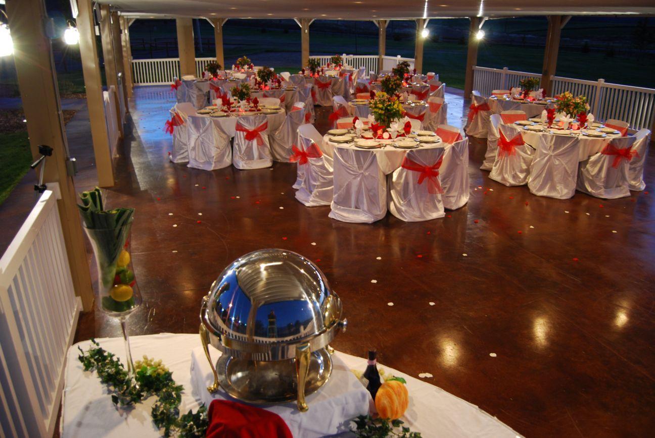 This space features 5,696 square footage for a reception and dinner. Pavilion is 2,450 square footage for a outdoor ceremony.