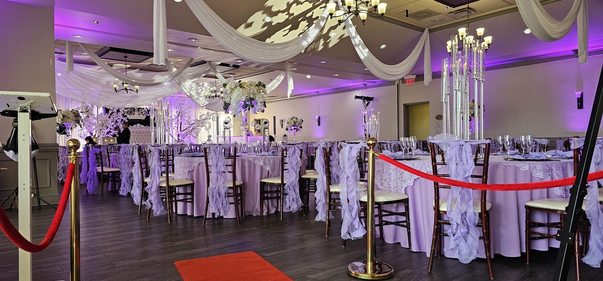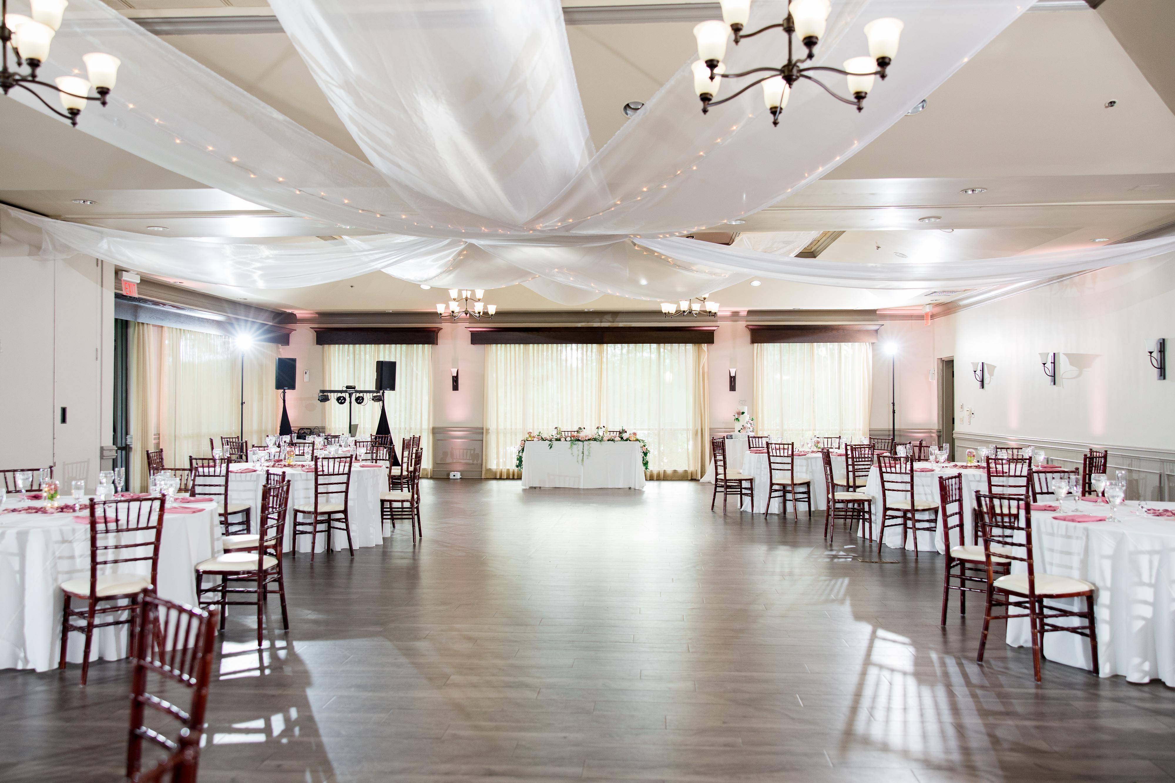 Our ballroom is neutrally colored, and has floor to ceiling windows on two walls, overlooking the covered patio, and golf course beyond. Any color scheme will work with the ballroom colors, and the open floorplan is perfect for any event. Smaller events can be accommodated by closing off some space with our airwall. Tables, dance floor, chiavari chairs, and linens come included.