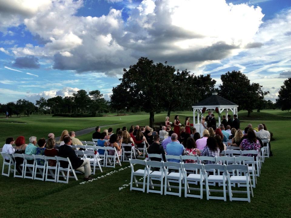 This area is great for wedding ceremonies, and smaller affairs that would like an outdoor feel, with open air, yet sheltered from the elements. Overlooking the golf course, it is located at the entryway to our clubhouse.