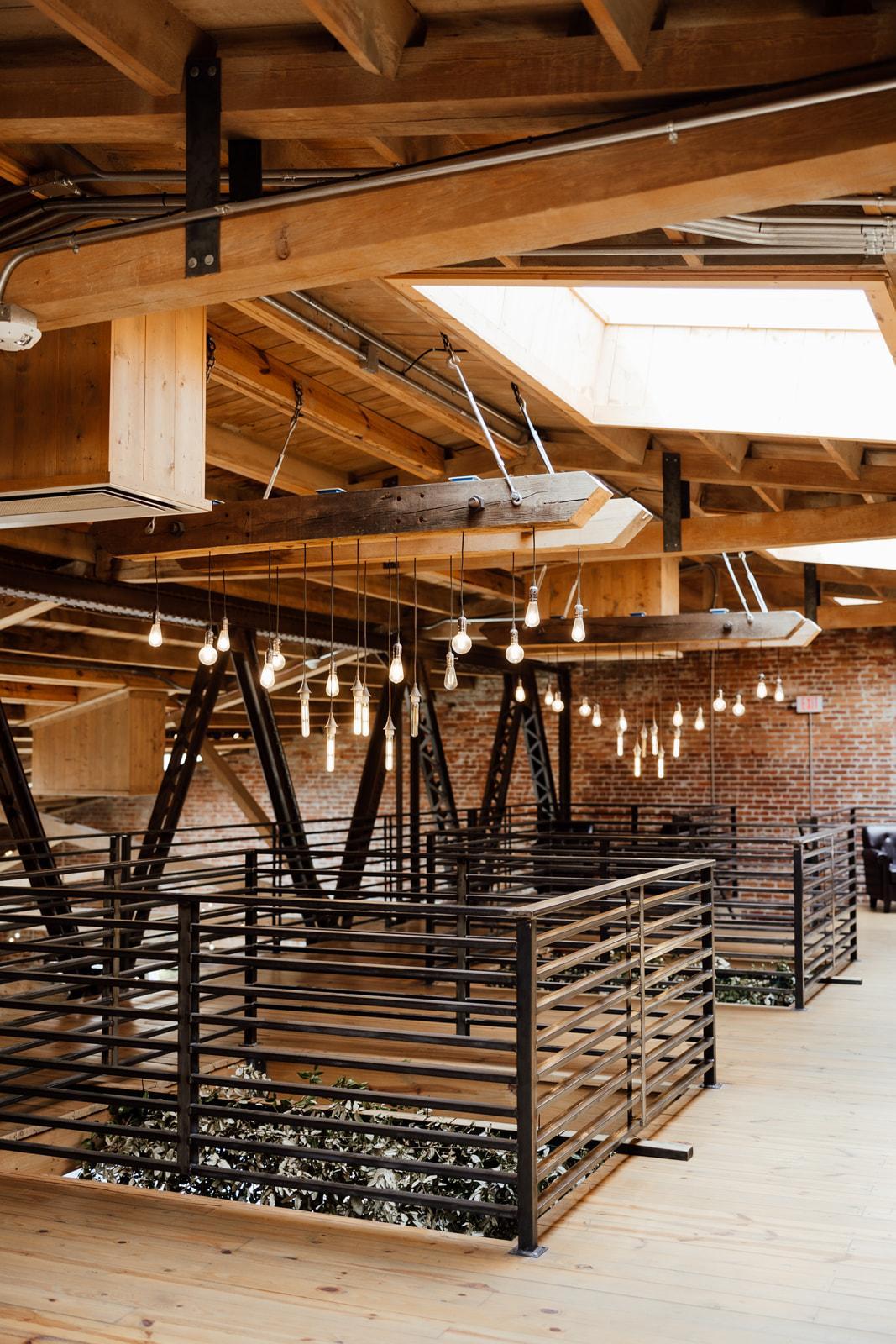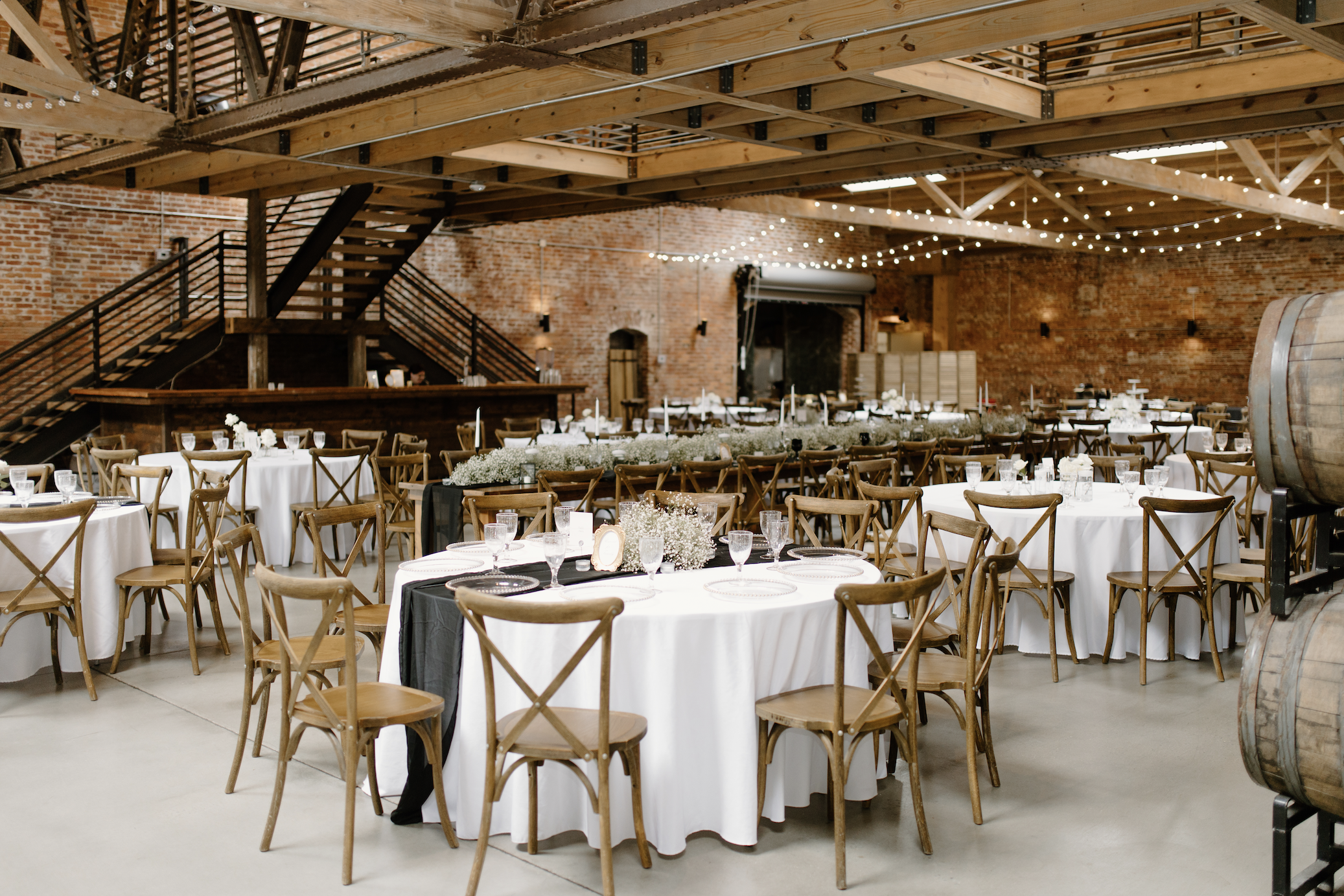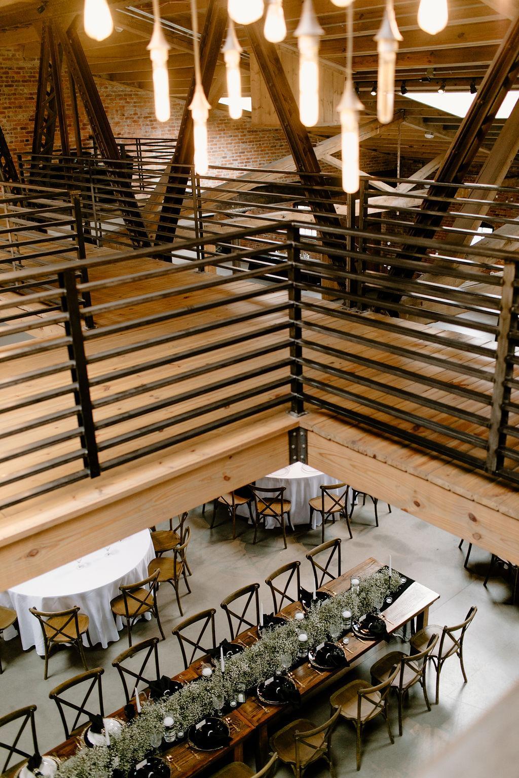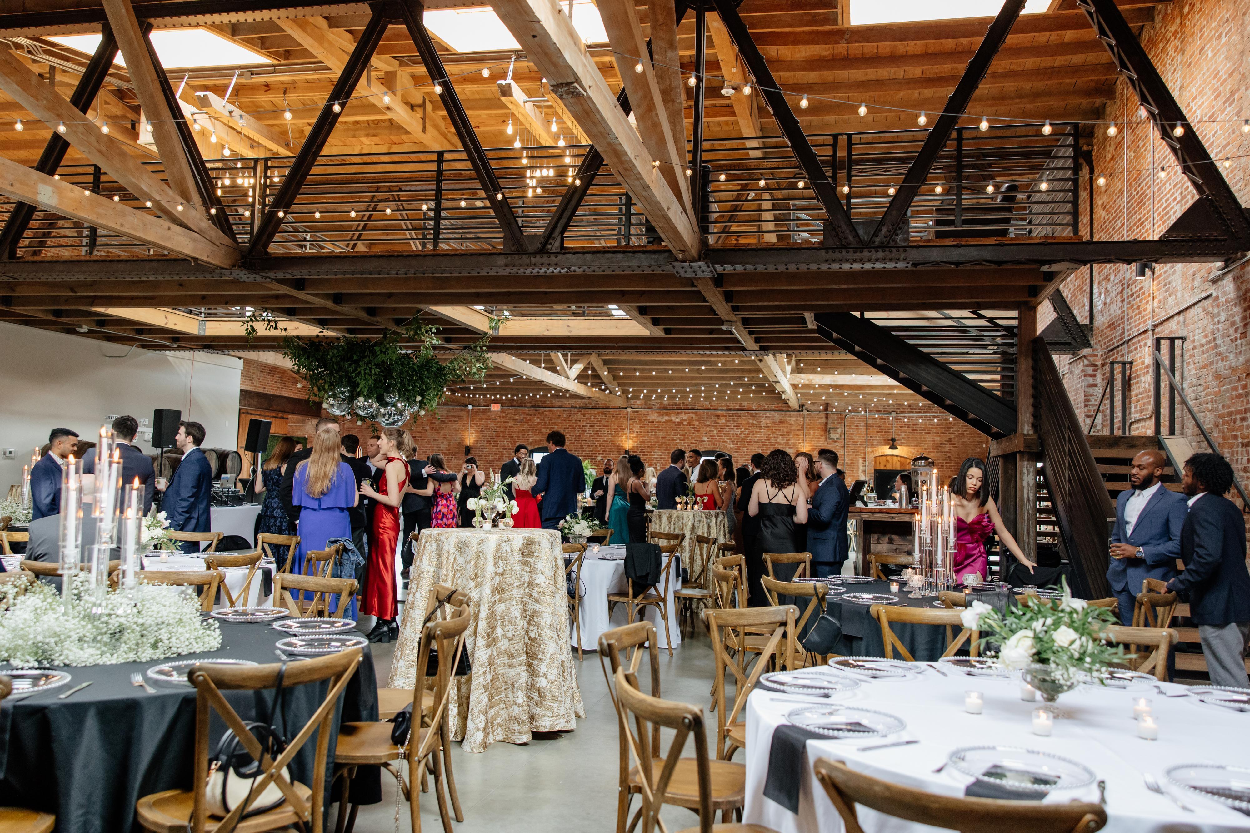 .Open second-floor mezzanine space overlooking the reception area. Large wooden stationary bar framed by double staircases. Custom Edison bulb chandeliers, string lights, track lights, and sconces on dimmers. 20 10 to 12-top round guest tables. 3 custom wooden farmhouse tables. 200 wooden reception chairs. Assorted catering, buffet, and standing-height cocktail tables. Linens for all provided tables.