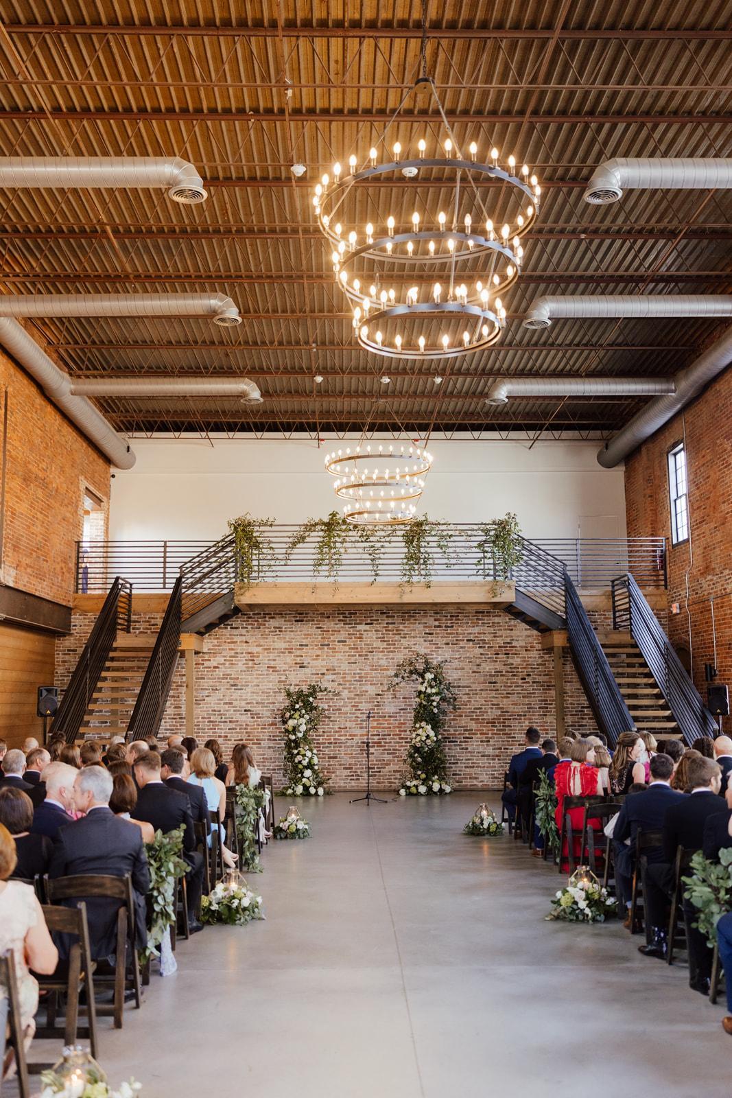 Coutless skylights for beautiful natural lighting . Custom Edison bulb chandeliers on dimmers. Leather armchairs throughout. Lofted catwalk over reception space. Juliette balcony overlooking ceremony space. Access to the bridal suite and groom's suite