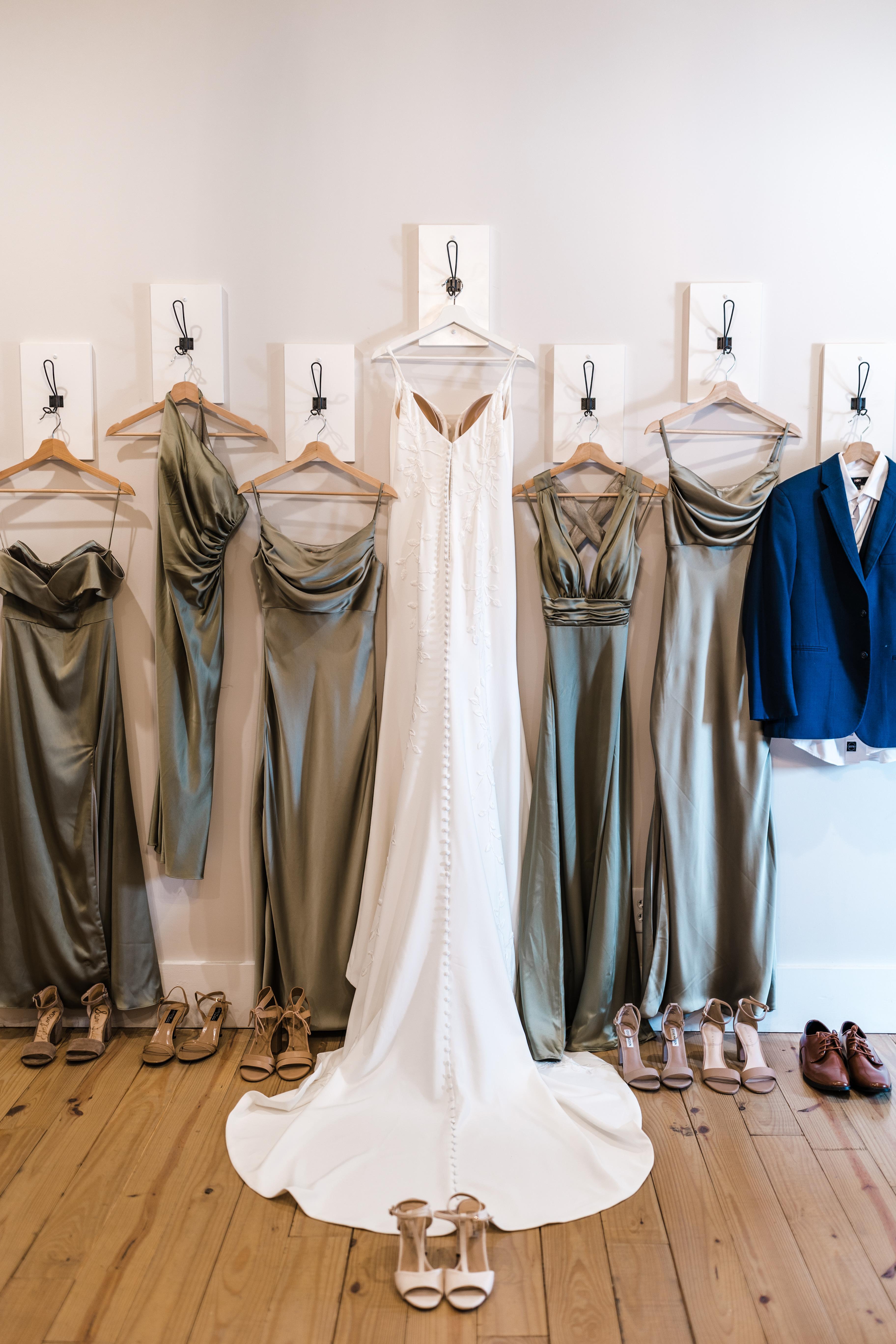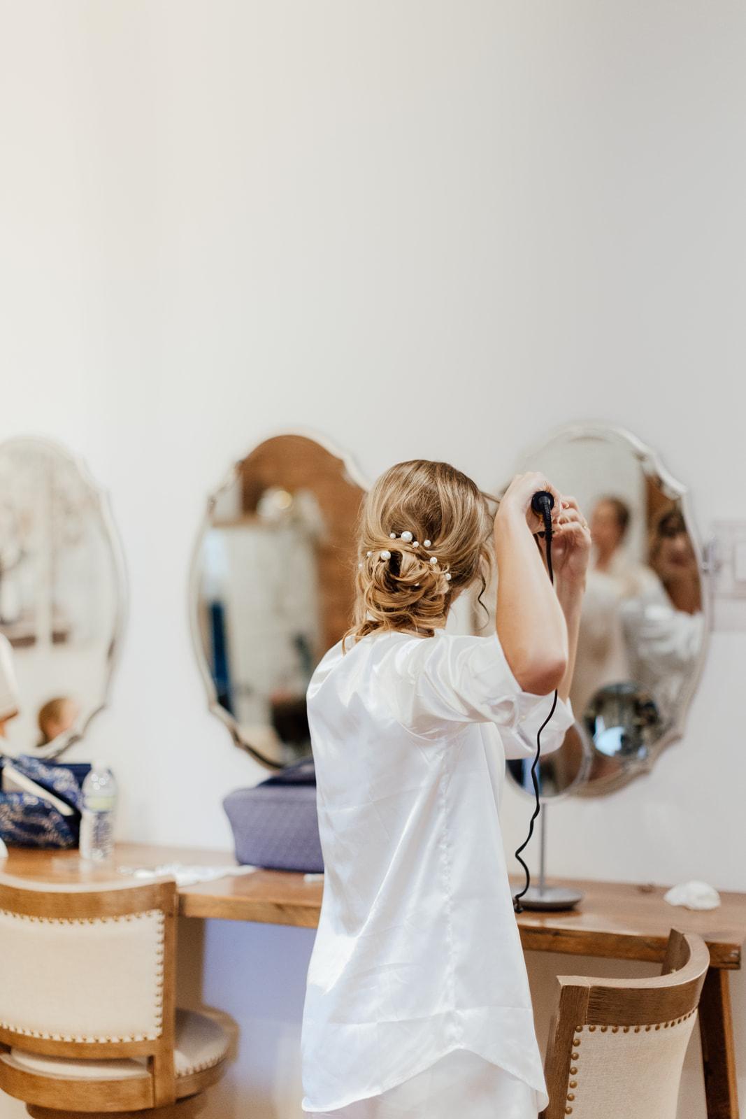 This space off of the upstairs mezzanine features bridal-white furniture, swivel chairs with matching height mirrors, plenty of outlets, wall-mounted hooks to hang your attire, an en-suite bathroom, a Keurig coffee maker, and a complimentary drink fridge stocked with beer, mimosas, and soft drinks. This space is perfect for you and your bridal party to get ready!
