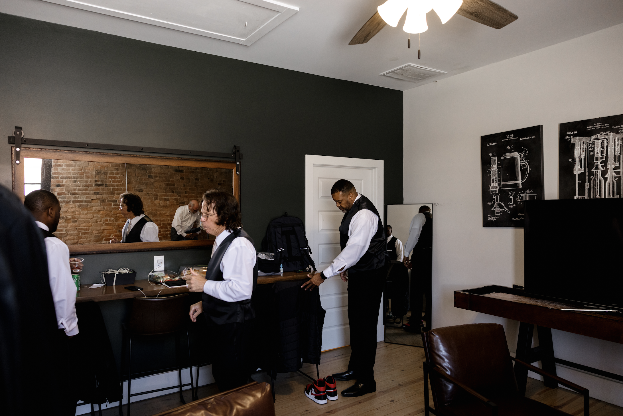 The groom's suite is the perfect spot for all the groom's party to relax and get ready! This space features mirrors, outlets, garment hooks, and an attached bathroom. Ample seating in front of the flatscreen TV with a Nintendo Switch, and a shuffleboard for endless fun.