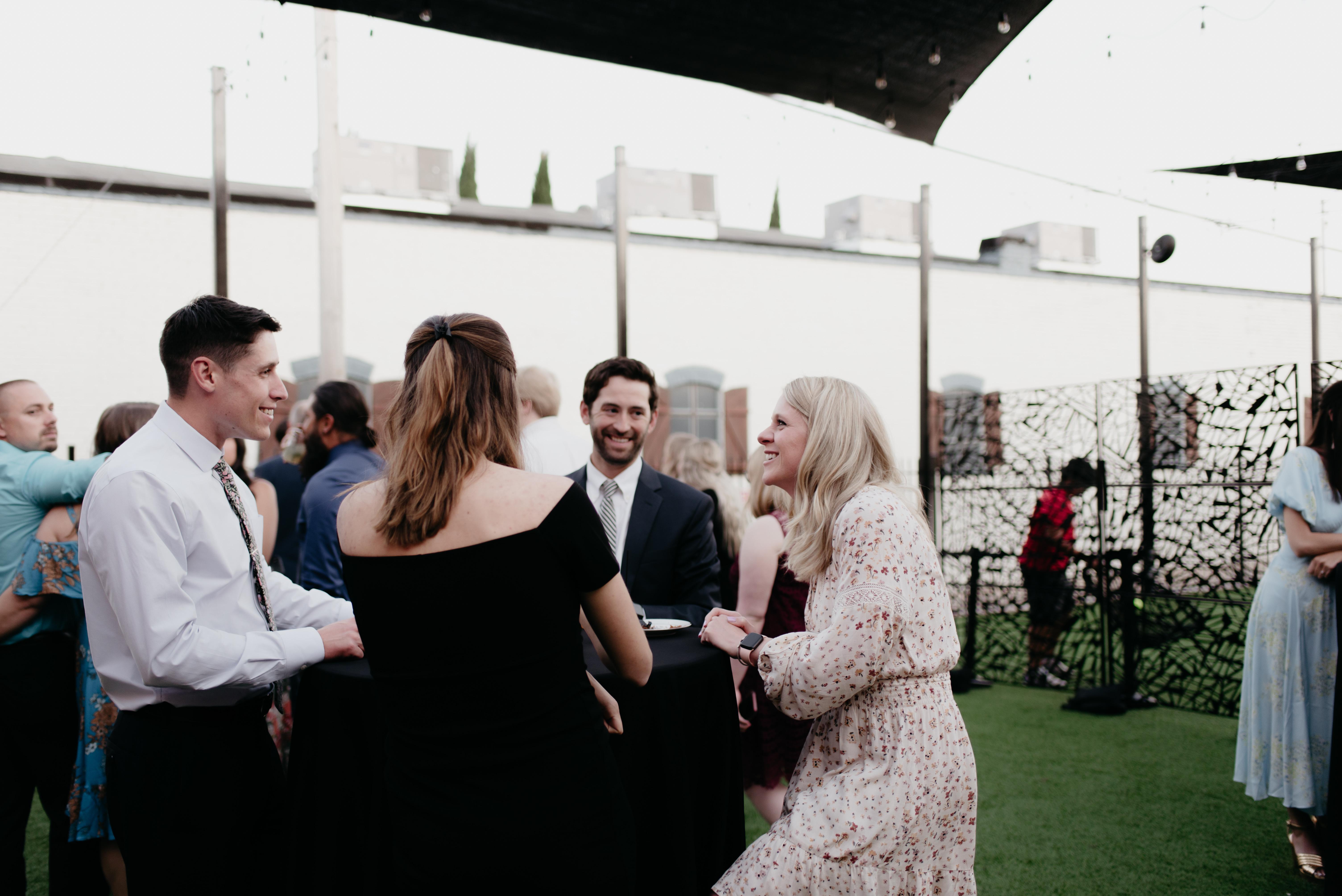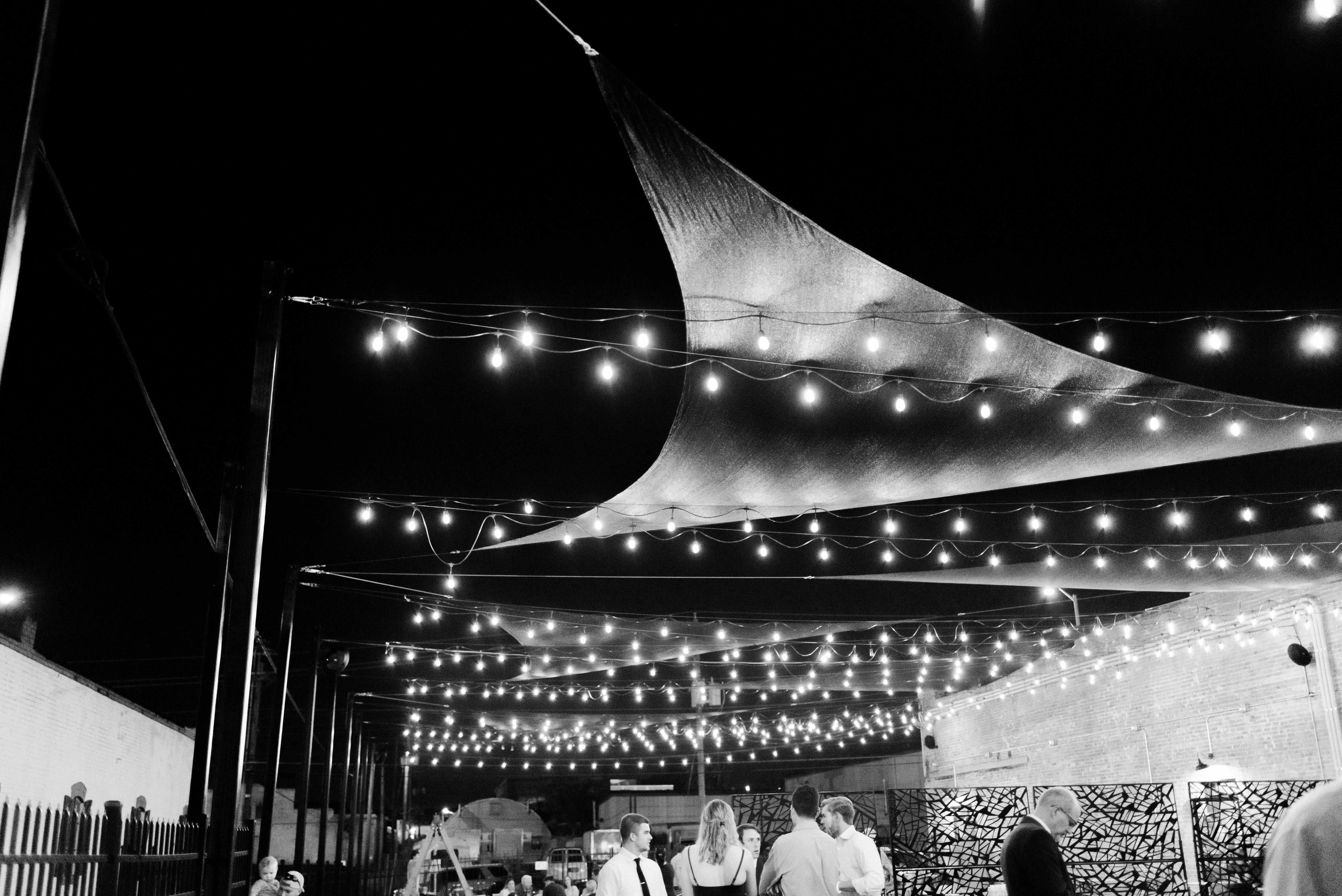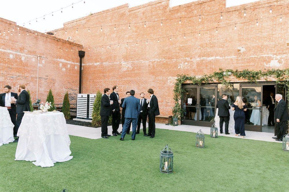 String Lights. Cocktail tables with black linens. Fall Line Station branded cornhole boards with bean bags. The alleyway adjacent to the garden is perfect for grand exits and send-offs.