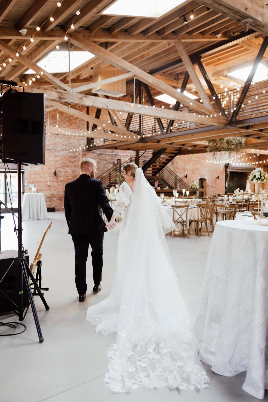 This space features vaulted ceilings, original brickwork, steelwork, a Juliette balcony, and banquet chandeliers with ample space for a beautiful and unique ceremony.