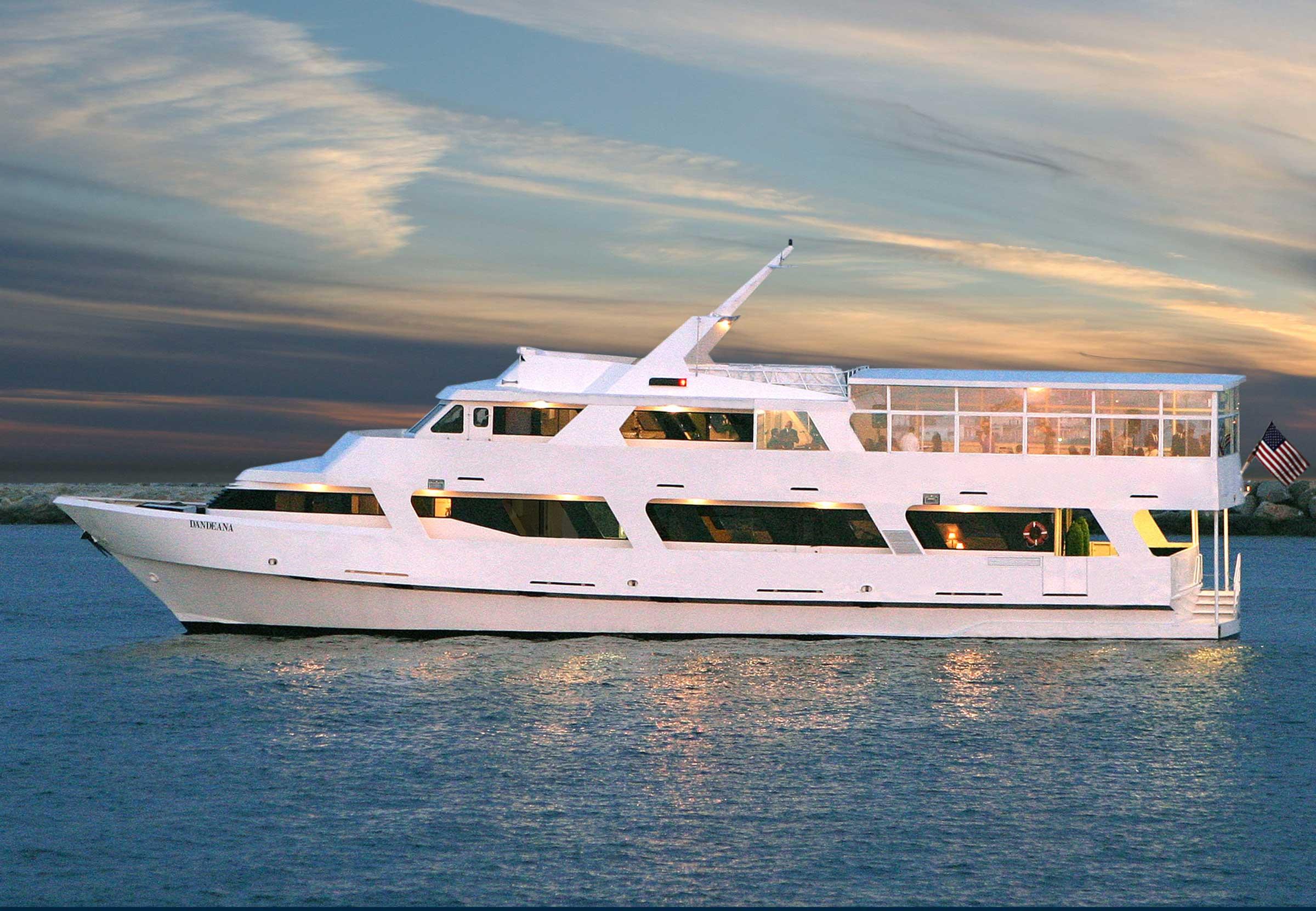 Dandeana has European-design accents, and is 110 feet long with a width of 24 feet. The luxurious Main Salon has modern design accents, complete with sofas, lounge furniture and lighting effects as well as a wall-mounted plasma screen welcoming your guests in style. The second floor Bar and Party Deck are equipped with an additional wall-mounted plasma screen for your DVD presentation, and large sliding glass windows for spectacular views and intimate dining and dancing under a sparkling crystal chandelier. Level three, the open Sky Deck, offers the best views of the marina and is perfect for catching every minute of your event on the tranquil waters of Marina del Rey. In addition, she has a full walk-around deck to enjoy the sights as you cruise.