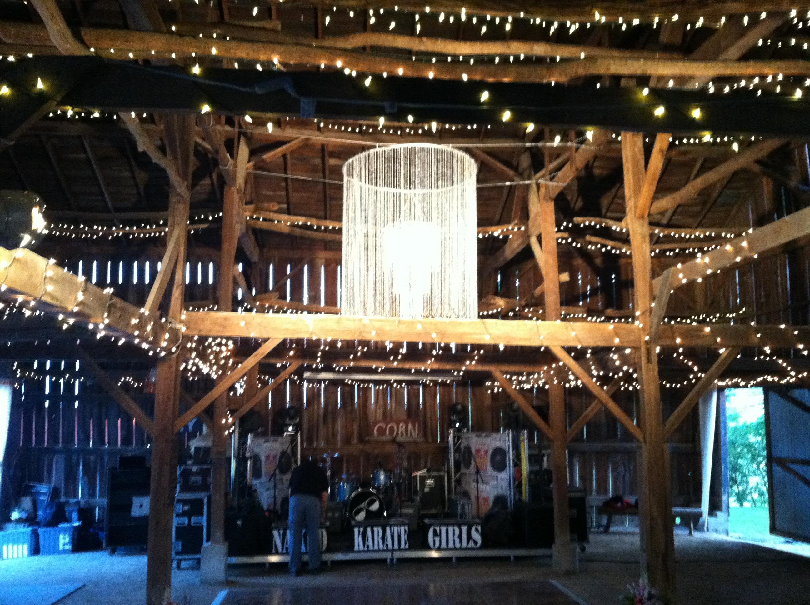 Rustic barn with wood dance floor, and wedding lights on tier poles.
