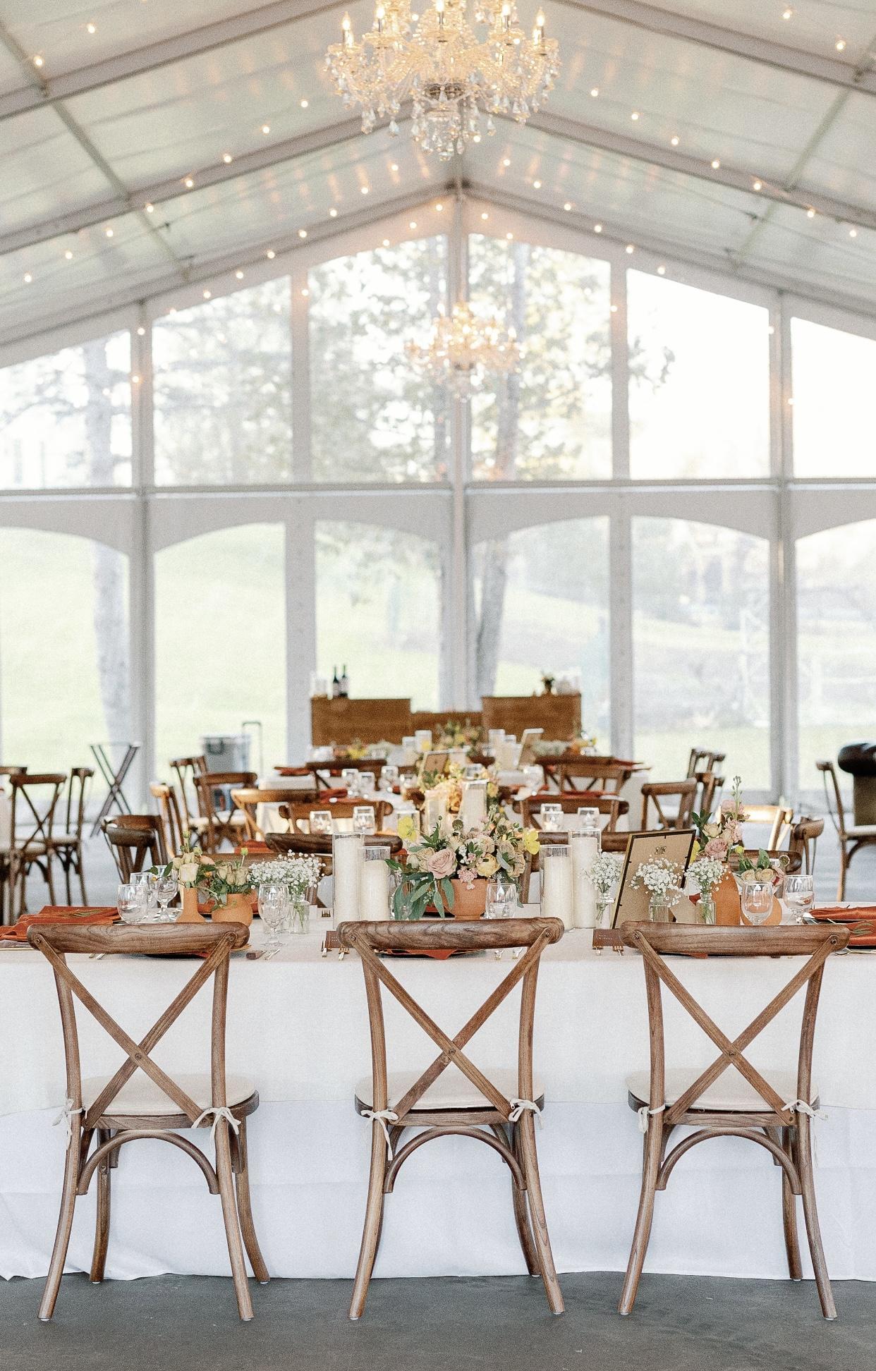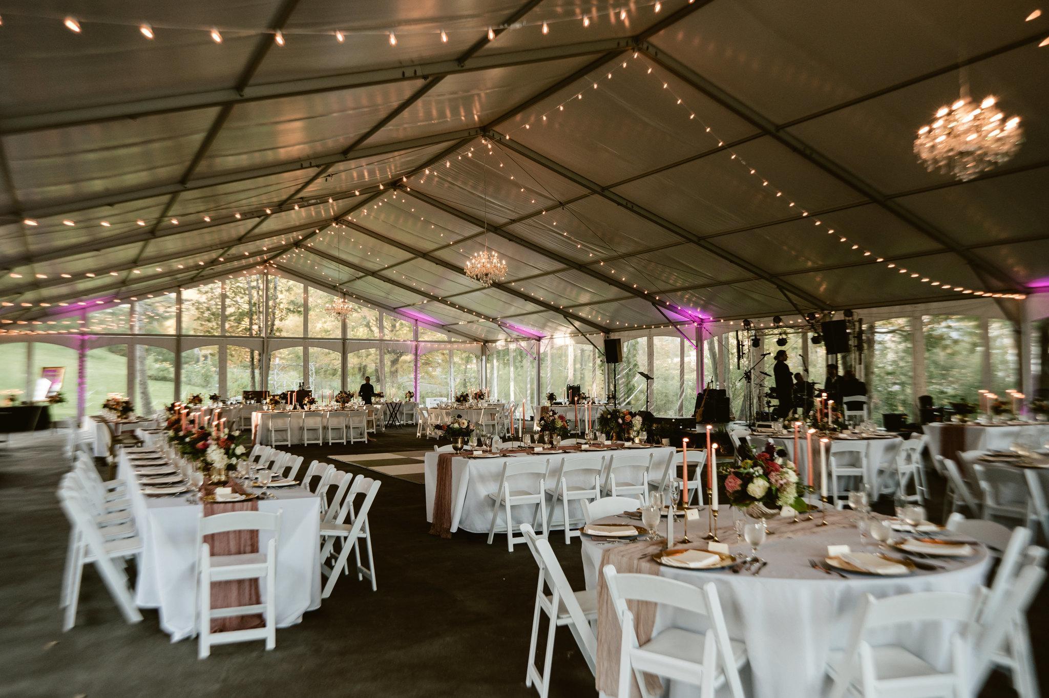 A stunning 60x120 outdoor event tent with an open floor plan, sitting on top of a painted concrete floor. Includes white tent top, clear sidewalls, dimmable twinkle lights and 3 crystal chandeliers, rustic bar set up, and power for your band/DJ.