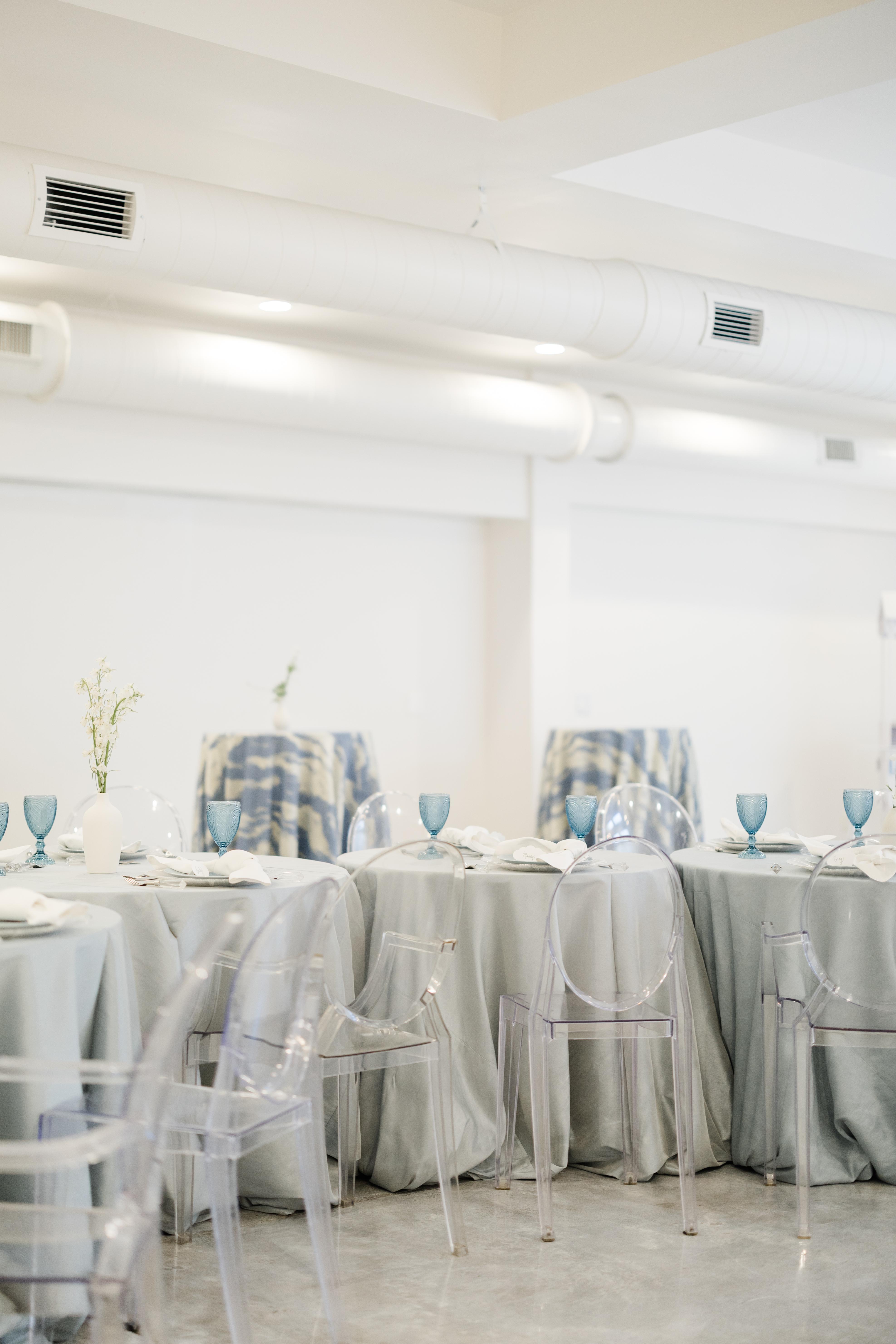 30-fathom ghost chairs, 5 high-boy fathom tables, 3 four ft. tables, small round glass table, fathom lounge furnishings, access to courtyard, full kitchen.