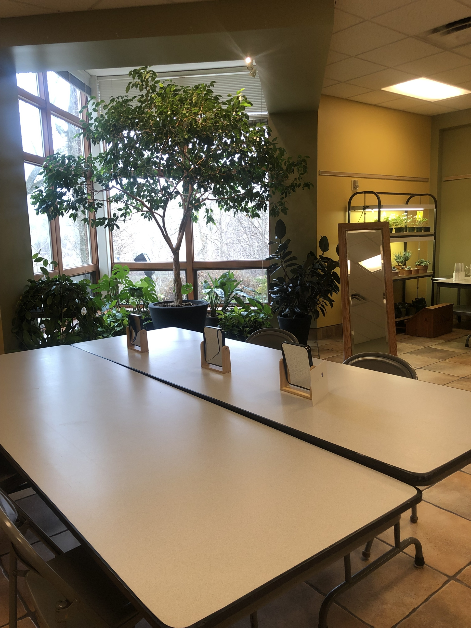This option helps make the day stress-free without the extra running around on your big day. The natural sunlight from the windows provides the perfect setup for makeup and hair to be done all in one setting. An optional brunch spread is available from Kravitz Garden Café as you prepare for the day. It is also a working horticulture classroom that provides an attractive backdrop for meetings.