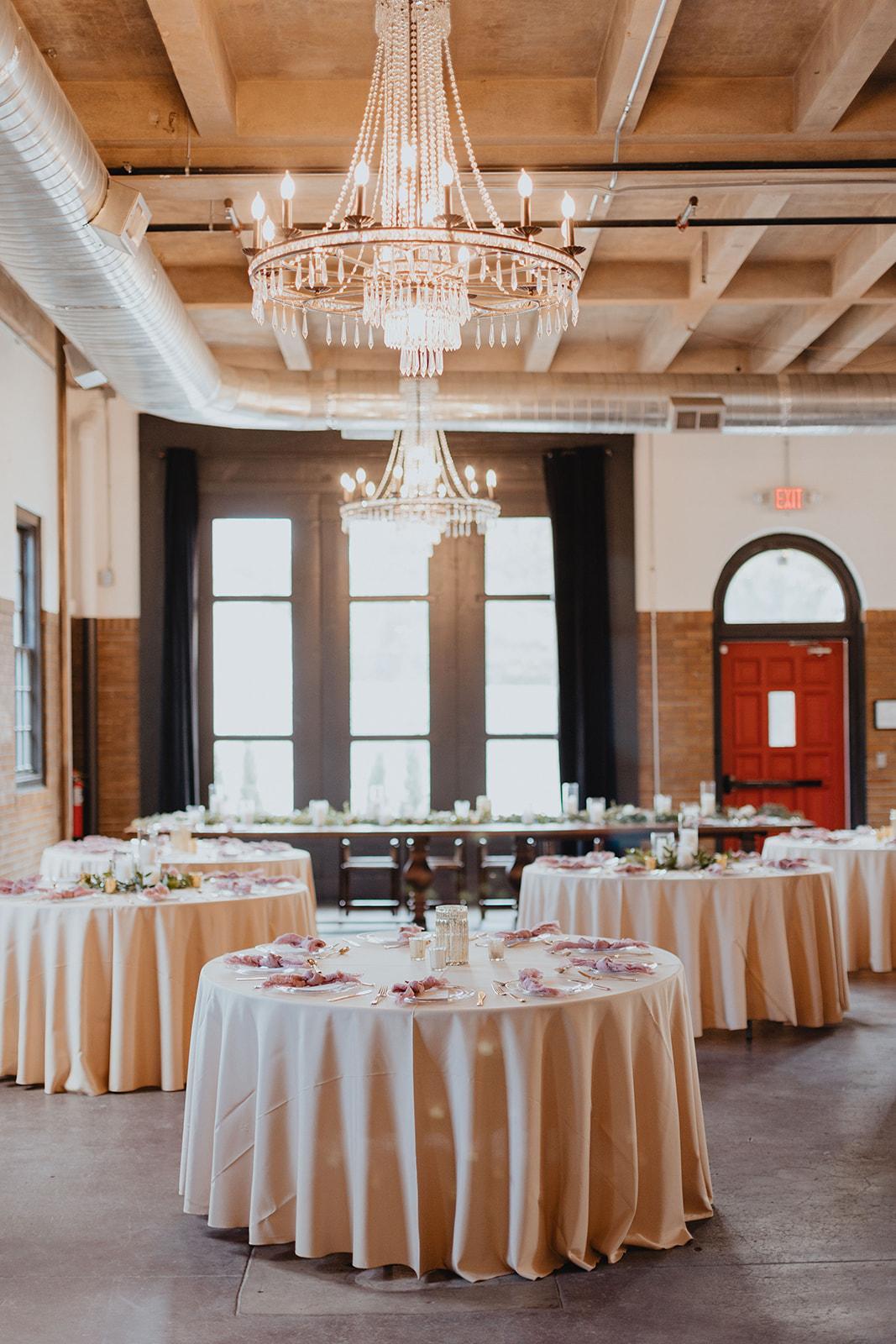 Our Main Hall is the perfect place for receptions and dinner events. It features space to seat up to 150 guests, beautiful chandeliers, brick details, and high ceilings.