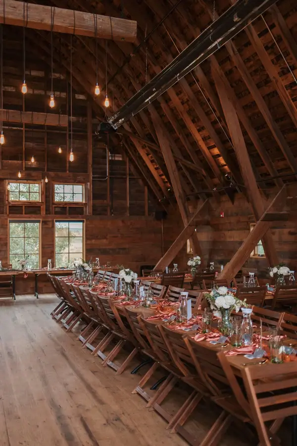 The two-story barn can comfortably seat up to 130 guests for a full sit down dinner on one level. The venue can accommodate 150 guests on one level with overflow to the patios, weather dependent. Celebrations over 150 guests are welcome if the event doesn't require a full sit down dinner on one floor. A tent rental is required for full sit down dinners above 150 guests. The main level of our barn is ADA accessible. A kitchen, two bar areas and men’s and women’s restrooms are located inside the barn. Rental also includes the use of our wood farm style tables and chairs with set-up and take-down.