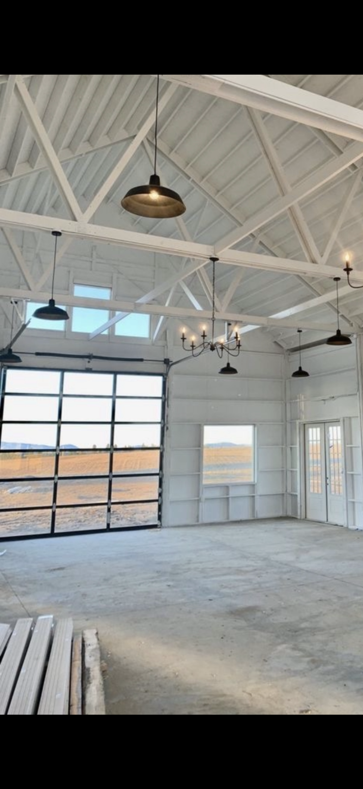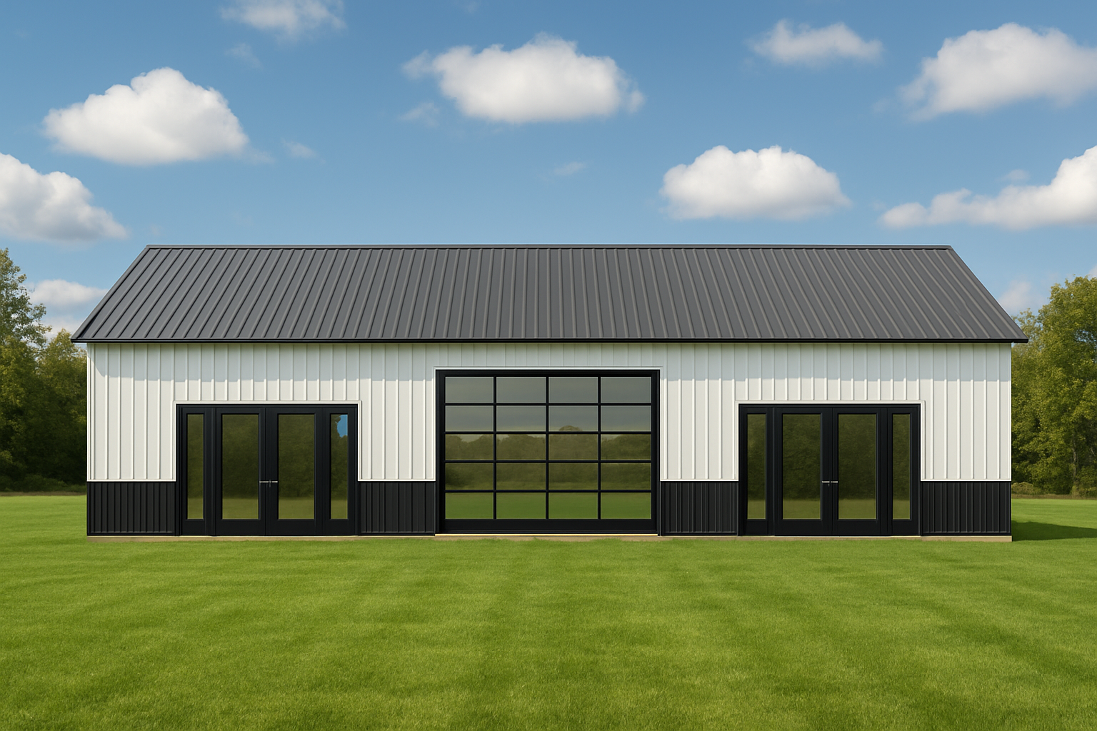 A modern 2,400 sq. ft. reception space bathed in natural light — featuring oversized windows, elegant French doors, and a dramatic 10x10 glass garage door that brings the outdoors i
