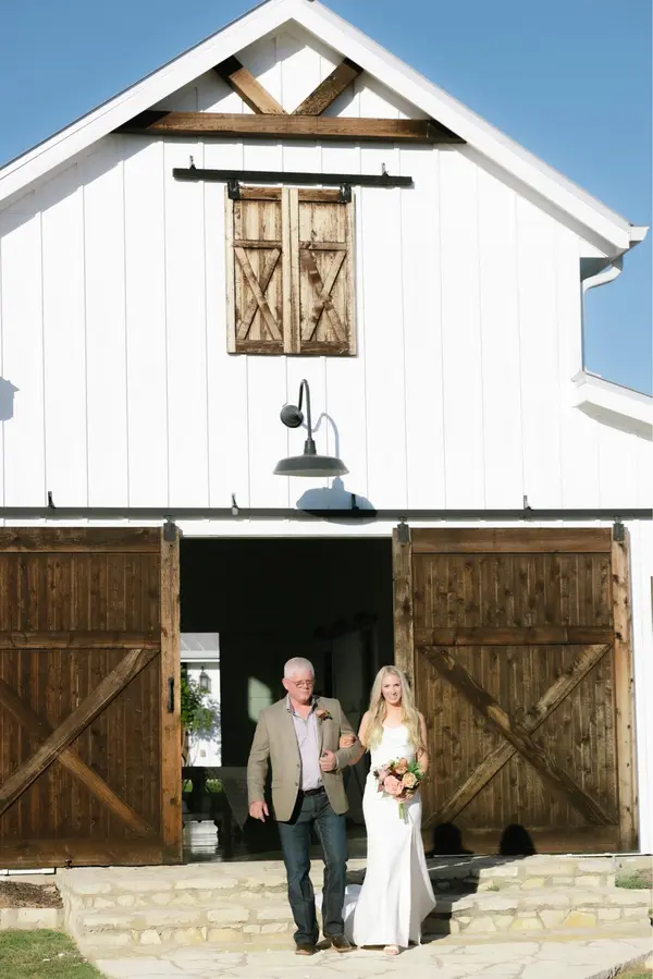 Welcome to Five Oaks Farm, a beautiful farmhouse-inspired wedding venue from Cleburne, Texas. The farmhouse-style barn is a climate-controlled wedding barn featuring tall, repurposed ceilings, cedar beams, white shiplap walls, and vintage furnishings. The white barn is surrounded by trees and a meadow.