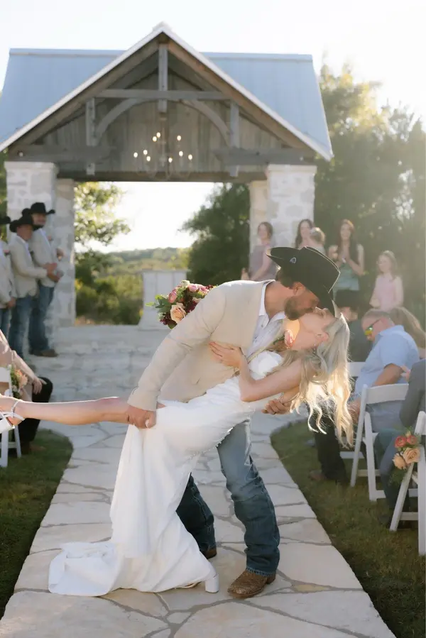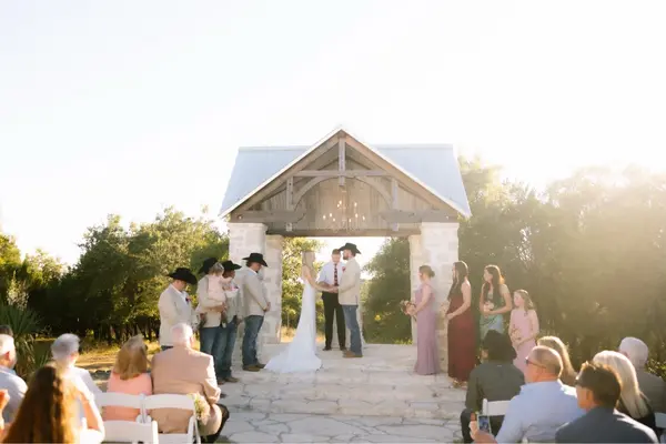 Whether the backdrop is our live oak trees or hilltop vista, Five Oaks Farm is the ideal setting to host your special event, a place where family and friends come together to celebrate things that matter most. Century-old oak trees are situated in the meadow with an antique windmill to accentuate the unique hill country landscape and can be styled with arches, fabric swags, vintage accessories, and an assortment of accents that are available for complimentary use at the venue. Our rock pavilion is becoming a favorite ceremony site and sits on a bluff, overlooking the beautiful Brazos River Valley! Gorgeous sunsets are a common view.