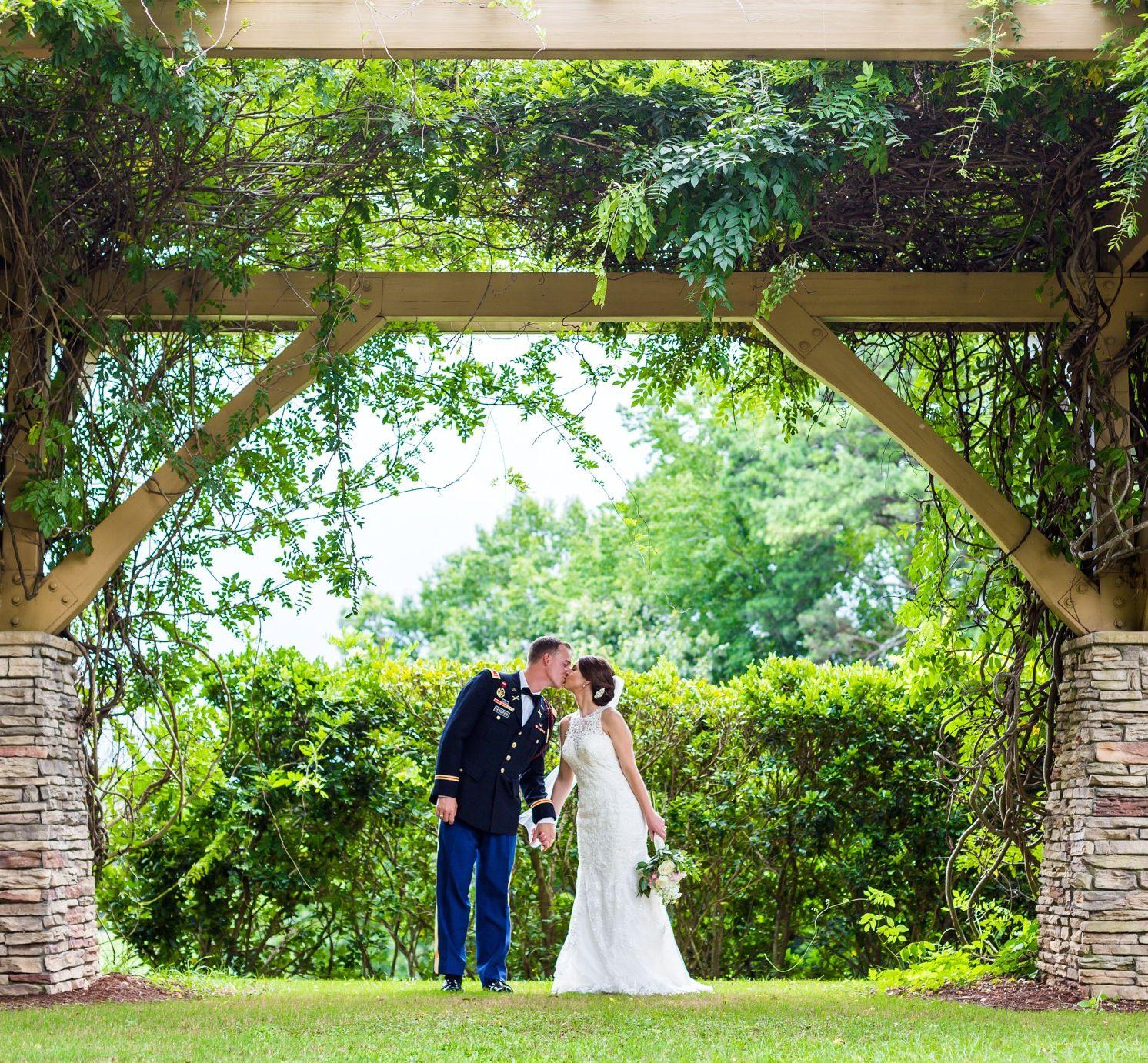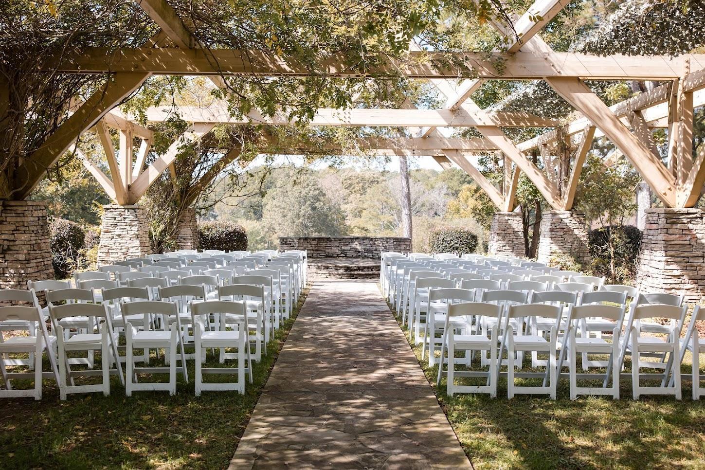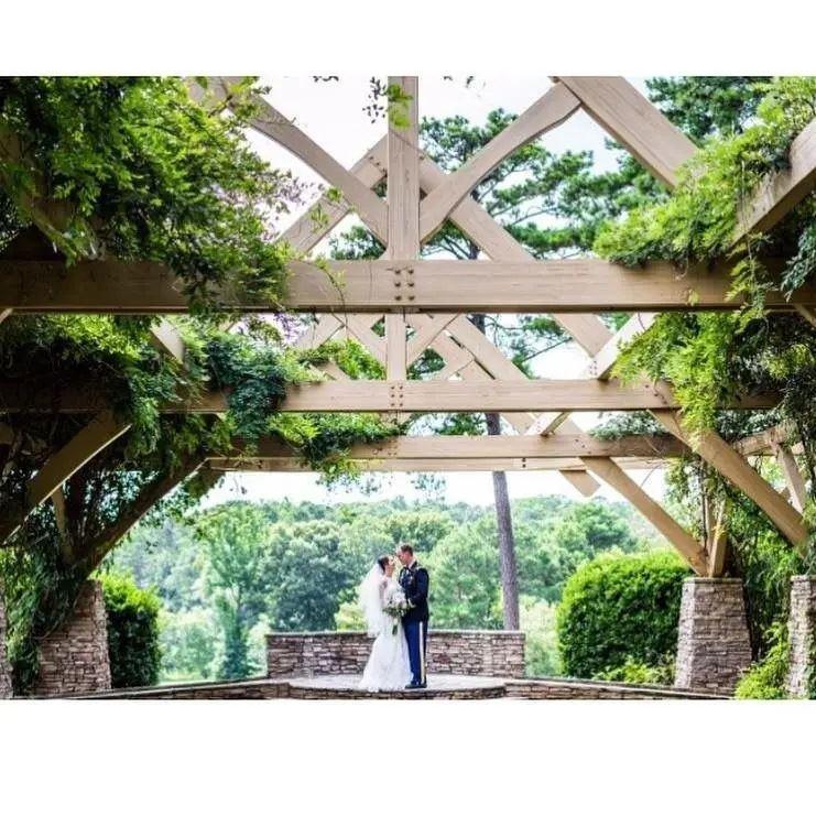 "Enter our charming pavilion, embraced by wisteria, for a romantic celebration amidst scenic beauty."