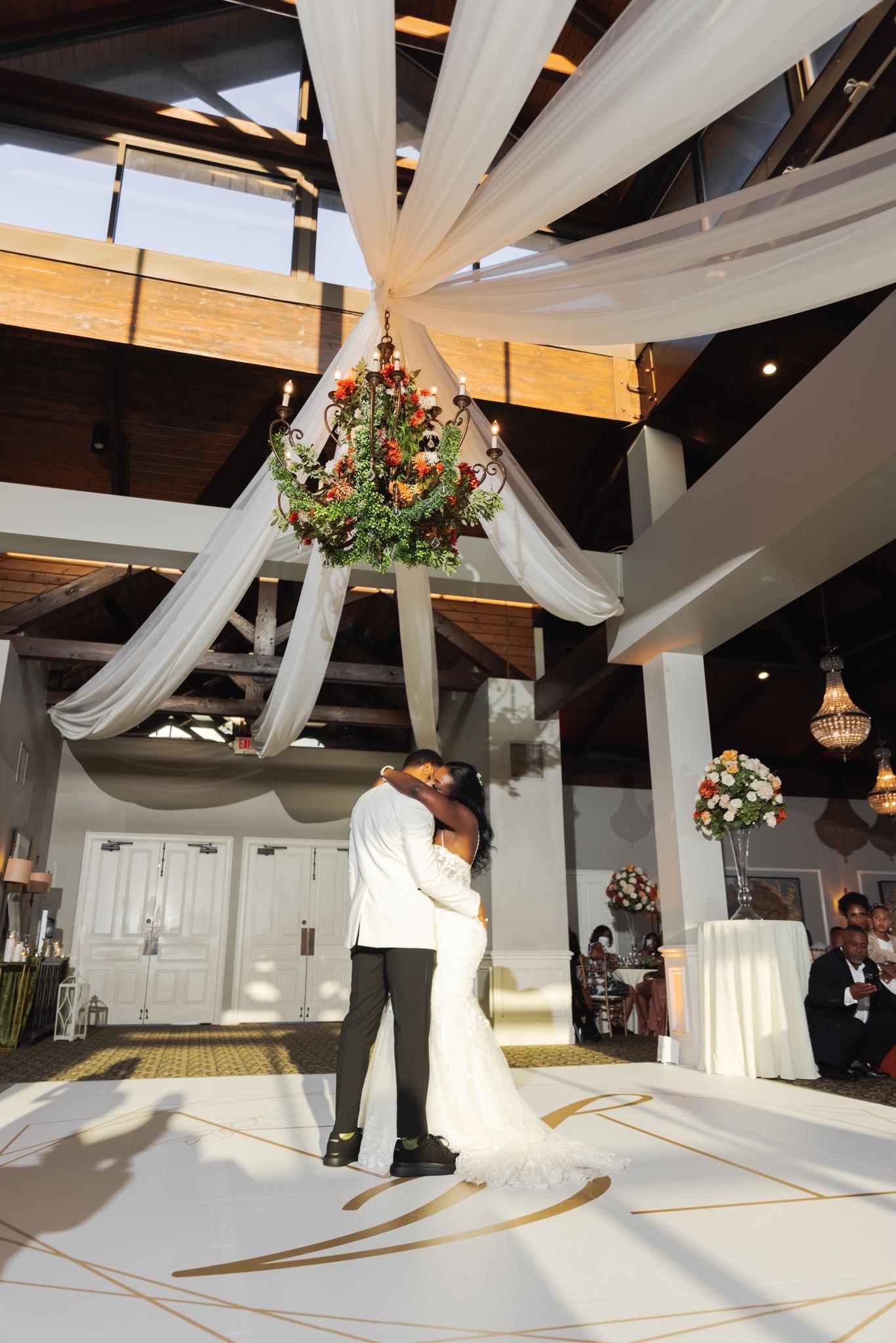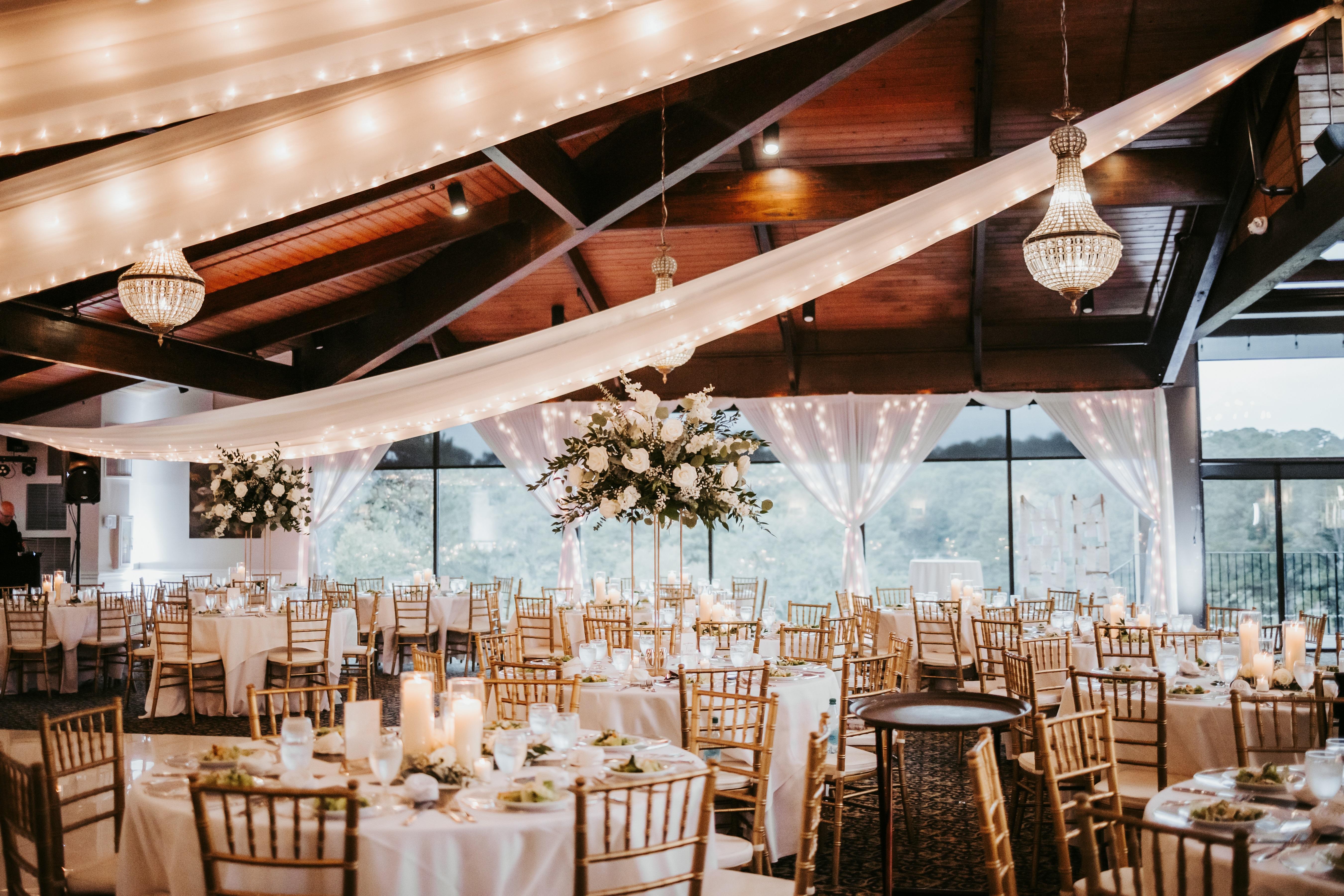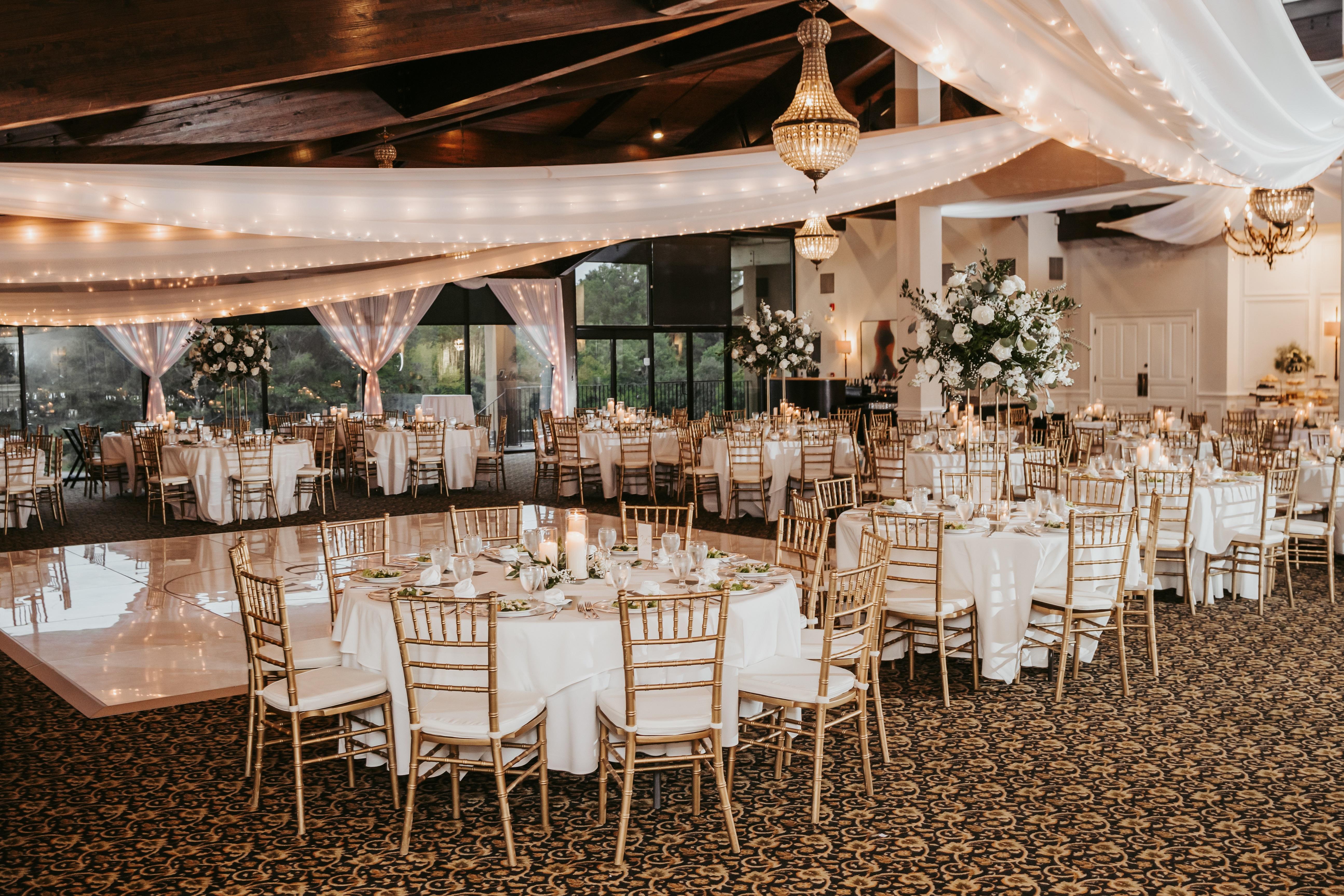 Nestled amidst the picturesque landscape of Flat Creek, our elegant ballroom offers an enchanting setting for your dream wedding. Adorned with sparkling chandeliers, a soft glow is cast over the rich, neutral tones that complement any wedding color palette. Floor-to-ceiling windows open up to a breathtaking view of the golf course, providing a serene backdrop. As the sun sets over Flat Creek, the ballroom transforms into a romantic haven, offering an idyllic atmosphere for your special day.