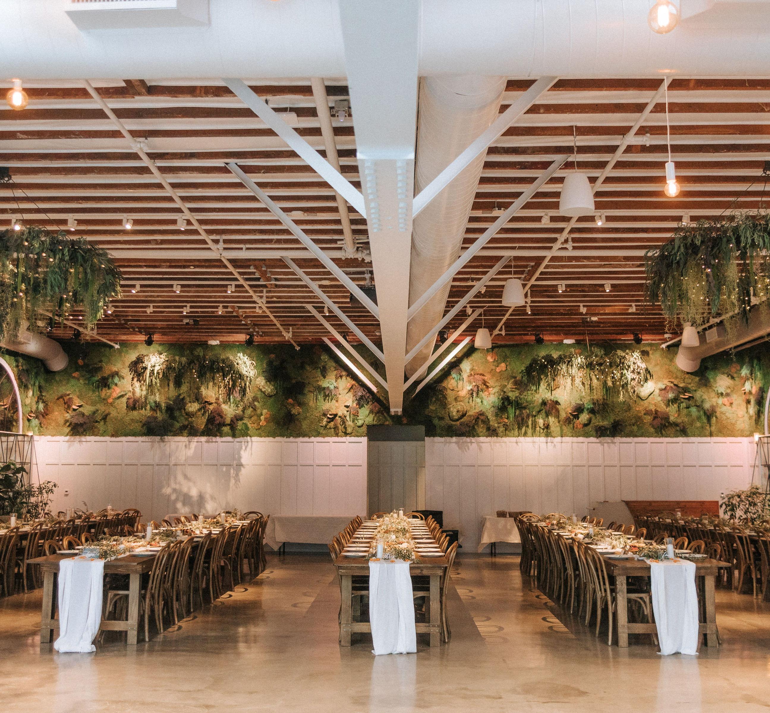 An event at Flora presents itself polished and turnkey with features like wainscot walls, custom doors, and bespoke furnishings. Visualize lofted ceilings, a 70-foot long living wall, two 12-foot custom skylights, hanging garden chandeliers, and over 130 plants. The amenities give the venue a life of its own with a state of the art sound system, wooden house tables, chairs, movable partitions, and built-in color LED lighting. To top it off, Flora blends an entirely renovated interior with original, exposed wood beams from its initial construction in 1922 as a tribute to our past. We invite you to walk the botanically-lined path of Flora’s entrance and into a space unlike that of any San Diego event venue before it - we have made a statement; make yours at Flora.