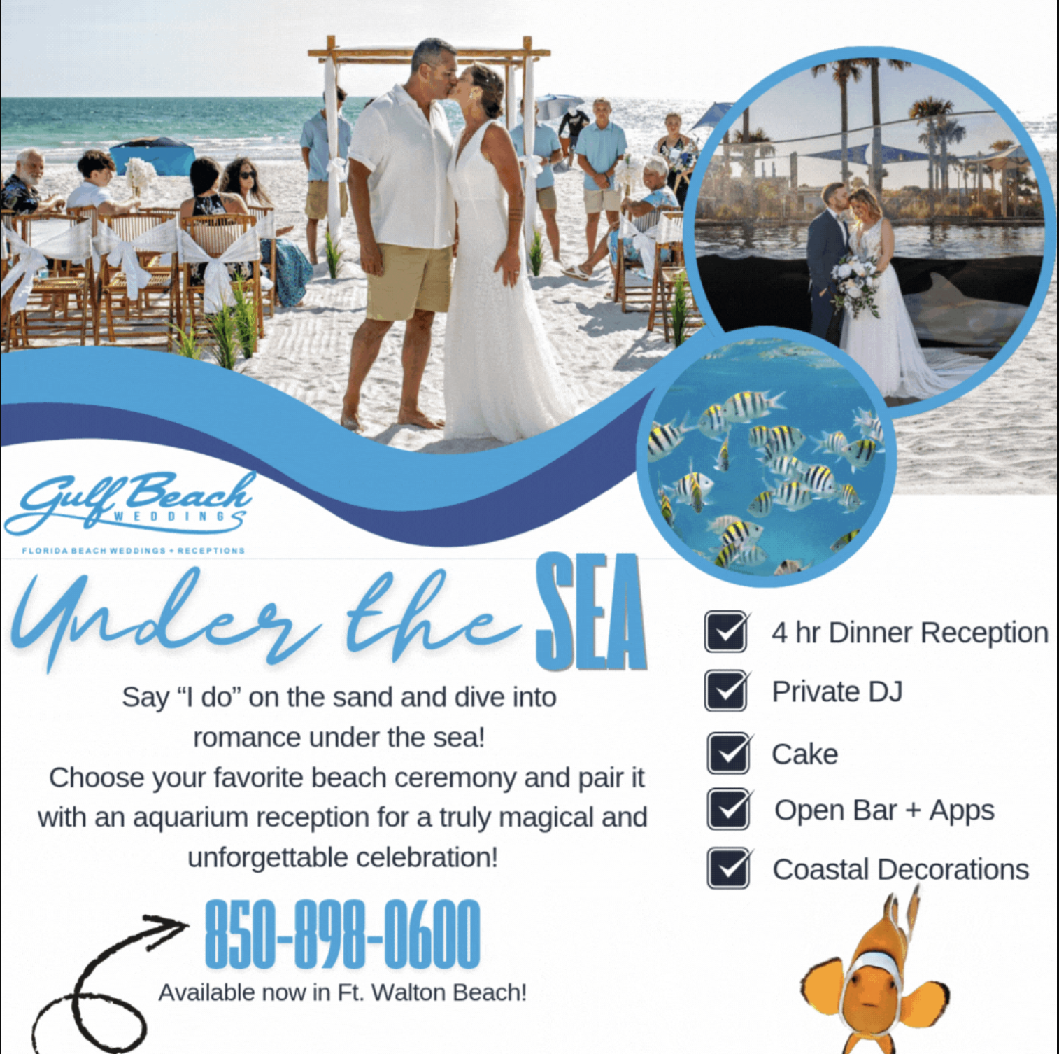 🌊 Dive Into Your Dream Wedding! 💍 Celebrate your love with an under-the-sea wedding reception in beautiful Ft. Walton Beach with Gulf Beach Weddings. 🐠 Choose your perfect package and enjoy this ‘fintastic’ reception experience—where the sand meets the surf and every detail makes your day unforgettable. Book now and create a beach wedding & under-the-sea celebration like never before!