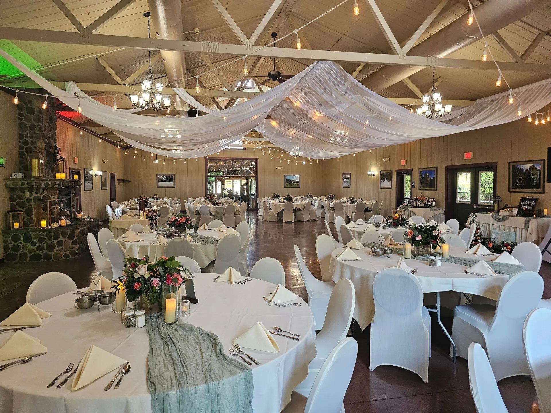 This spacious reception hall is the heart of your celebration, offering serene water views. A highlight is the scenic walkway leading directly from the hall, across a charming bridge, to the romantic gazebo—perfect for a seamless transition from your vows to your reception. Inside, your event is supported by a dedicated banquet kitchen with fully customizable menus tailored to your taste. All necessary tables and chairs are provided, ensuring a smooth and effortless planning experience.