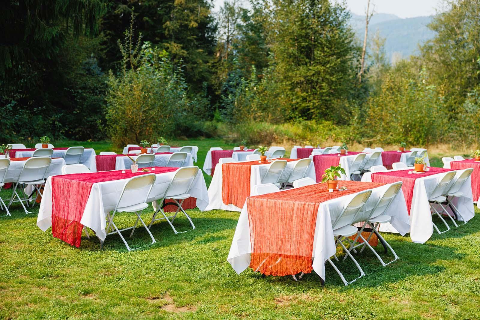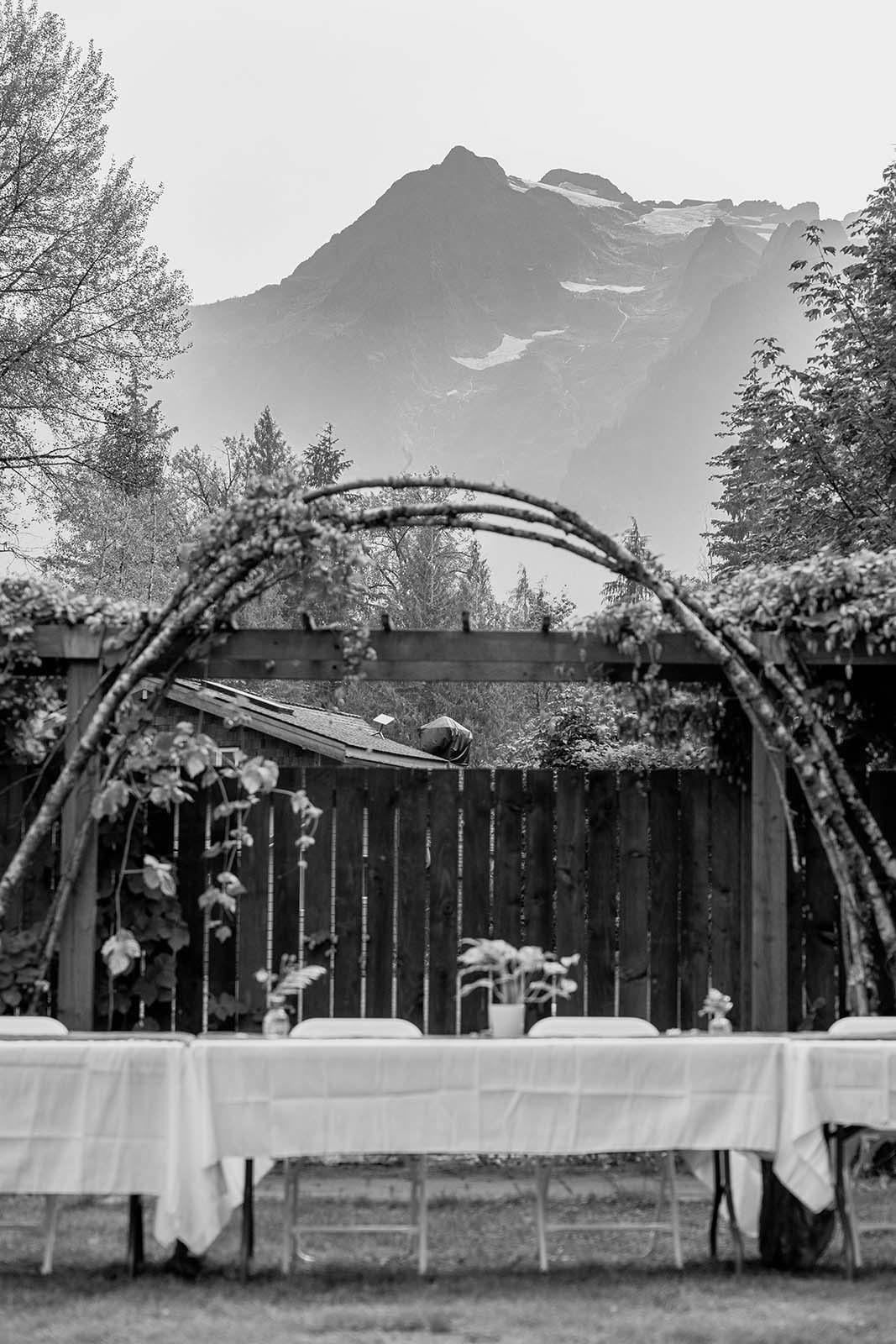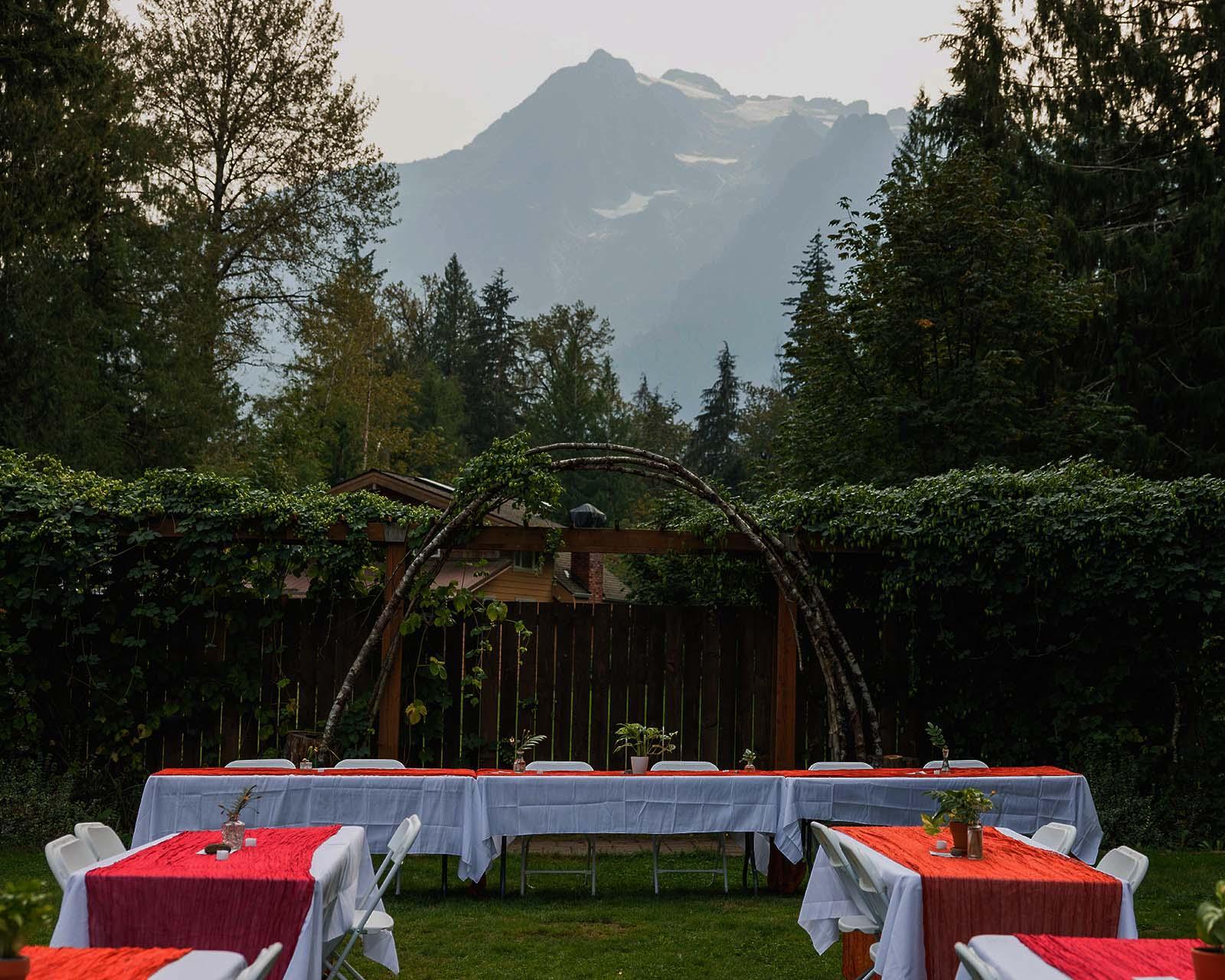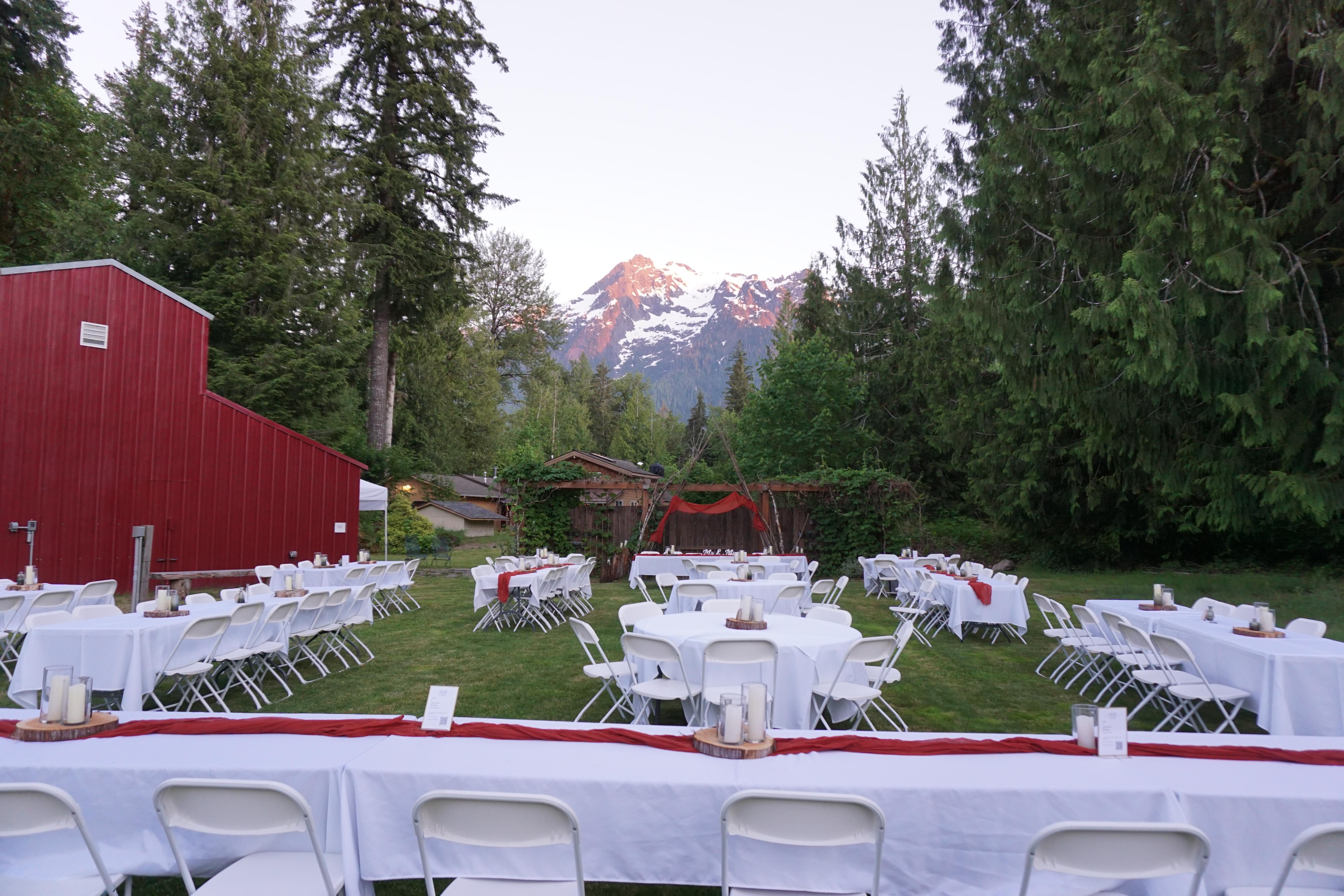 This is space is set in the large grassy lawn next to the barn. Perfect for arranging the included 17 folding tables and 100 folding chairs for your reception dinner. Whitehorse Glacier Mountain is the backdrop for this beautiful space surrounded by nature.