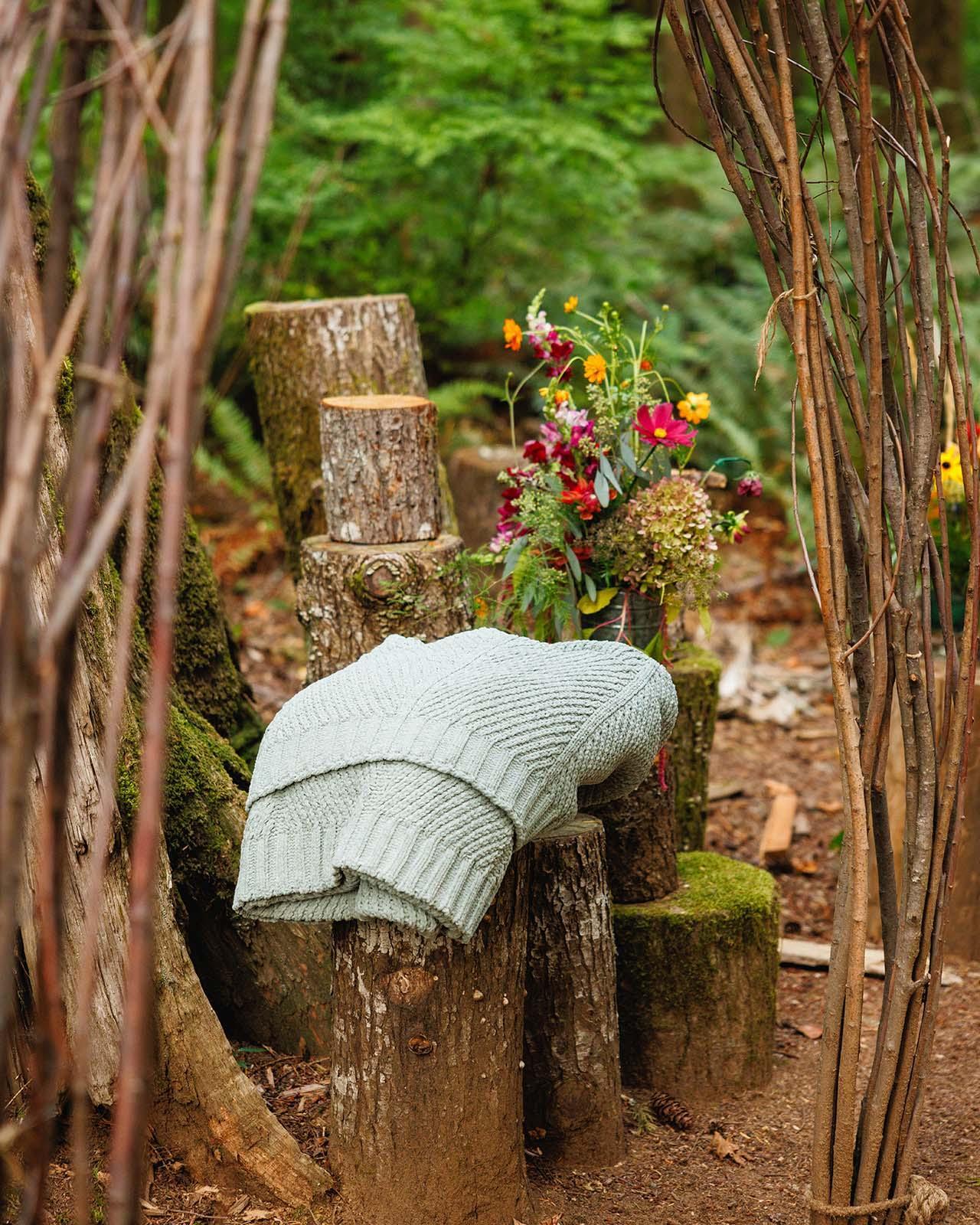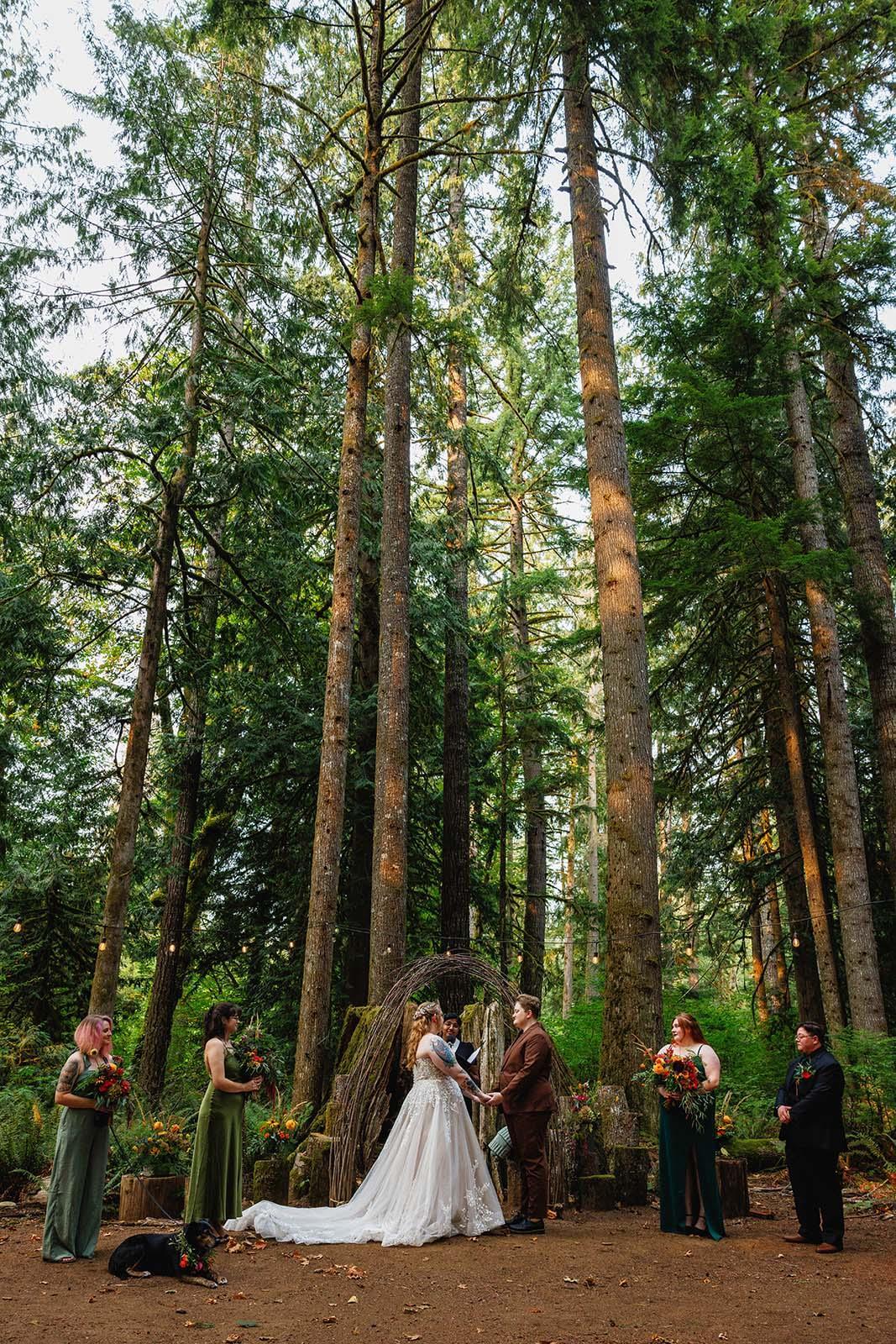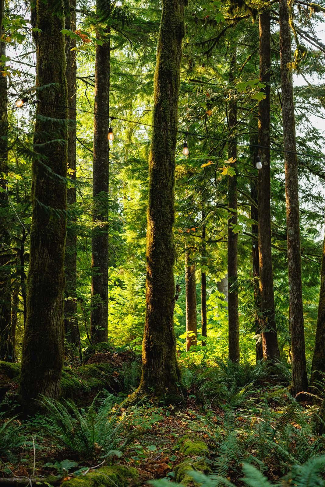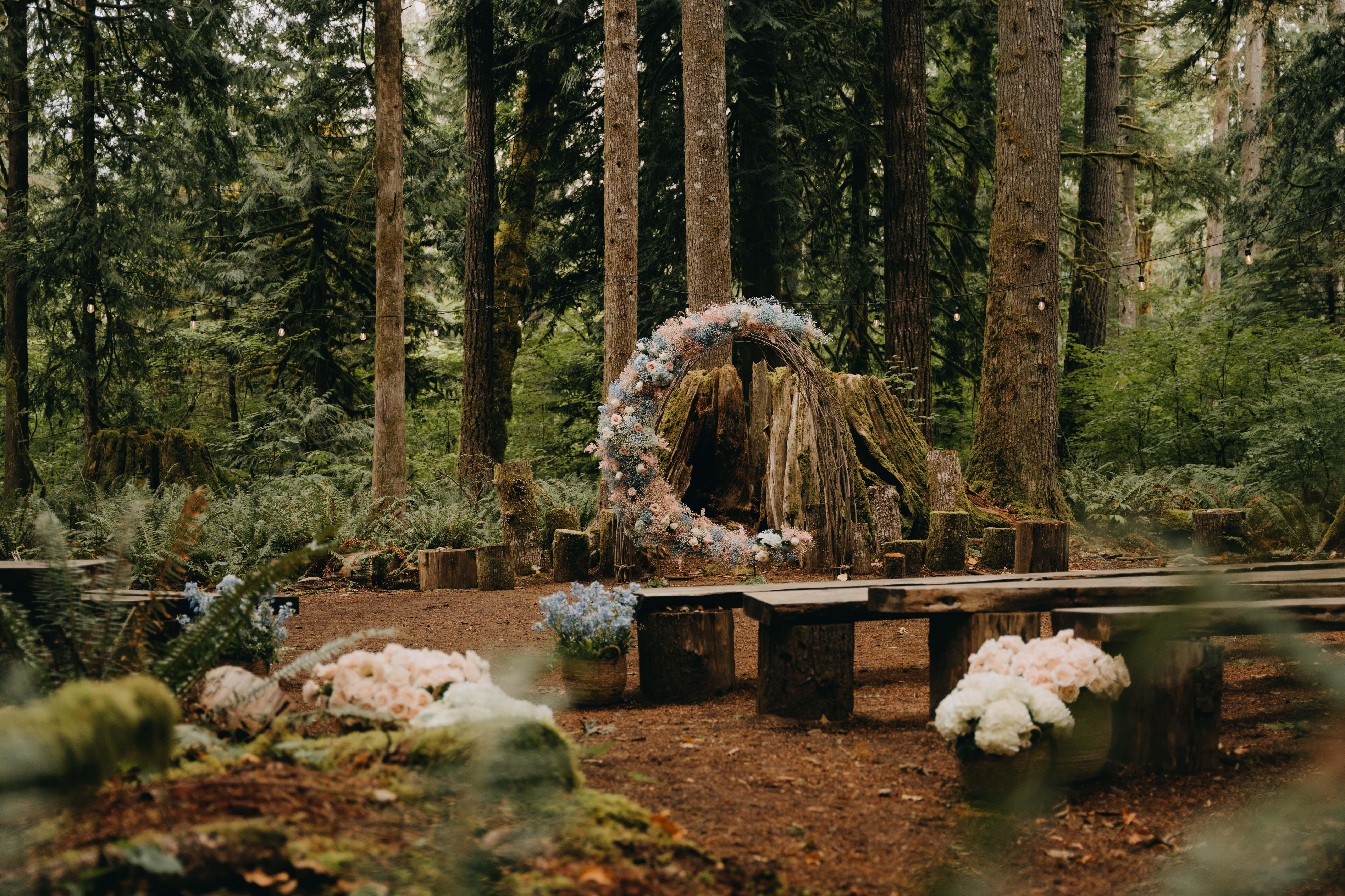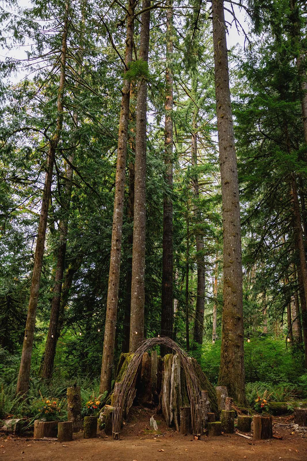 Ceremony Grove is set in a magical forest featuring an alter with hand made willow arch and old growth redwood stump. Surrounded by sword ferns and giant fir and maple trees sits bult in bench seating that can sit 130 guests. Additional chairs can be added for larger guest lists.