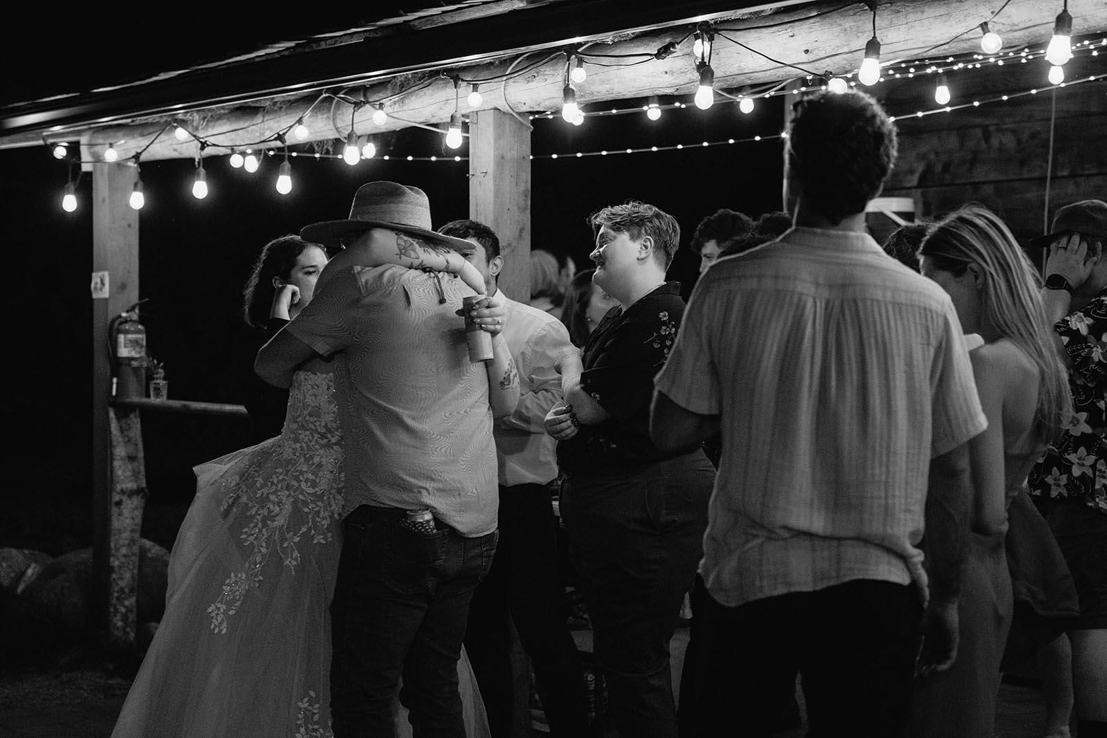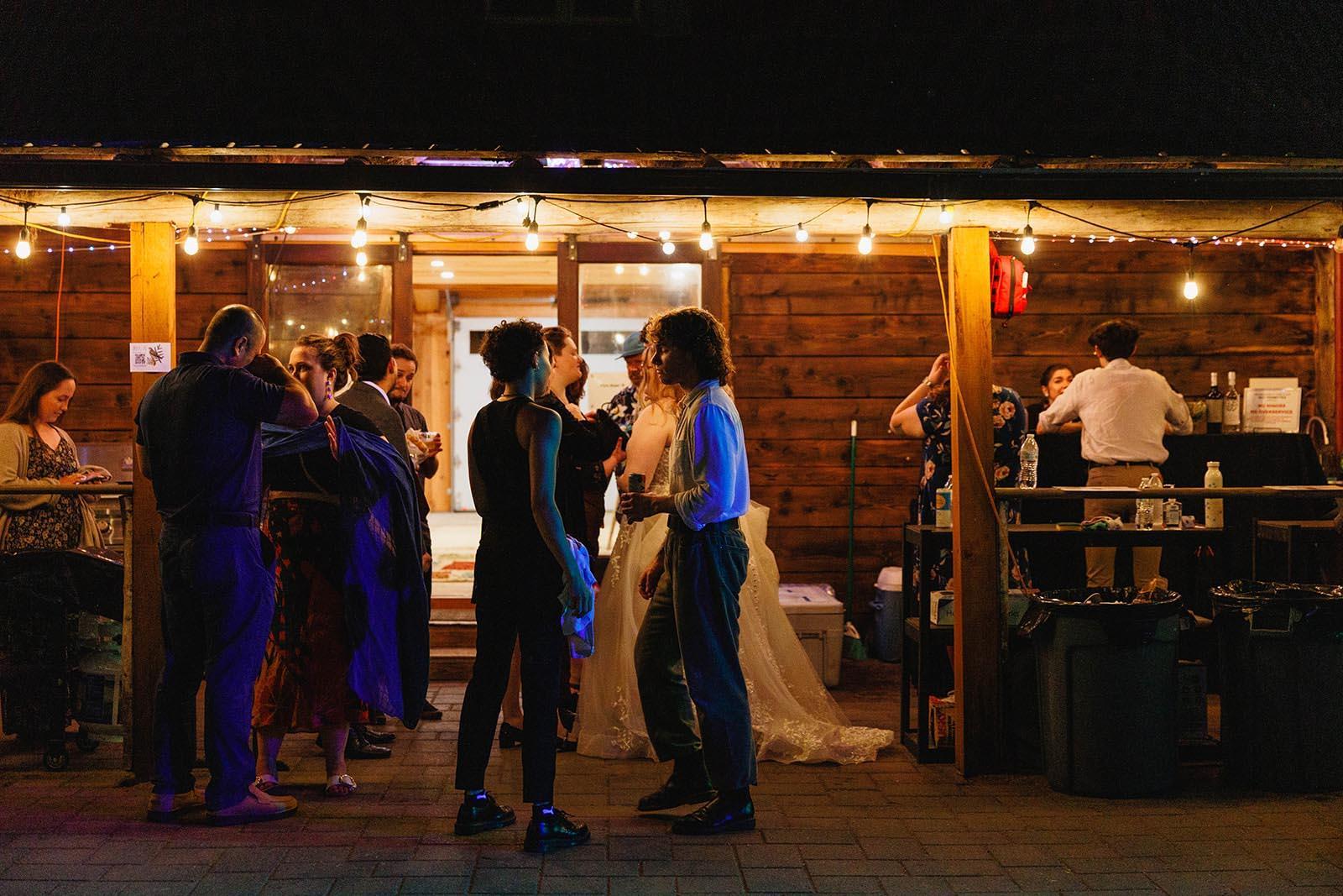 We have a beautiful wood finished barn included in the rental. An attached back patio is a ready made dancefloor and perfect area for cocktail hour. The patio also includes a communal cooking area with outdoor sink, garbage cans, two flat top grills, BBQ, and a bar area. The outdoor dance floor is lined by string lights to enjoy dancing into the night.