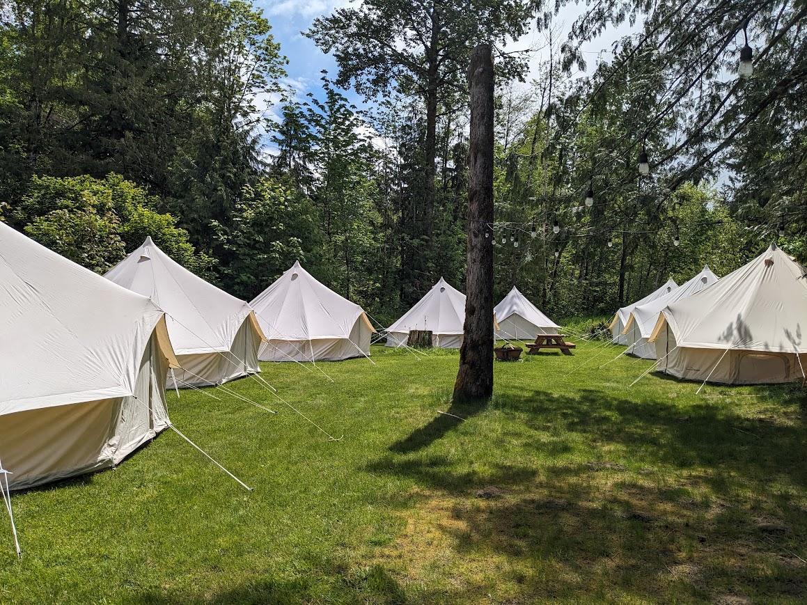 -9 fully furnished glamping tents 16.5 feet in diameter and 15' tall. -Each tent has a queen bed with bed frame, sheets, comforter, pillows, blanket, side tables, rugs, box fan, and luggage rack.