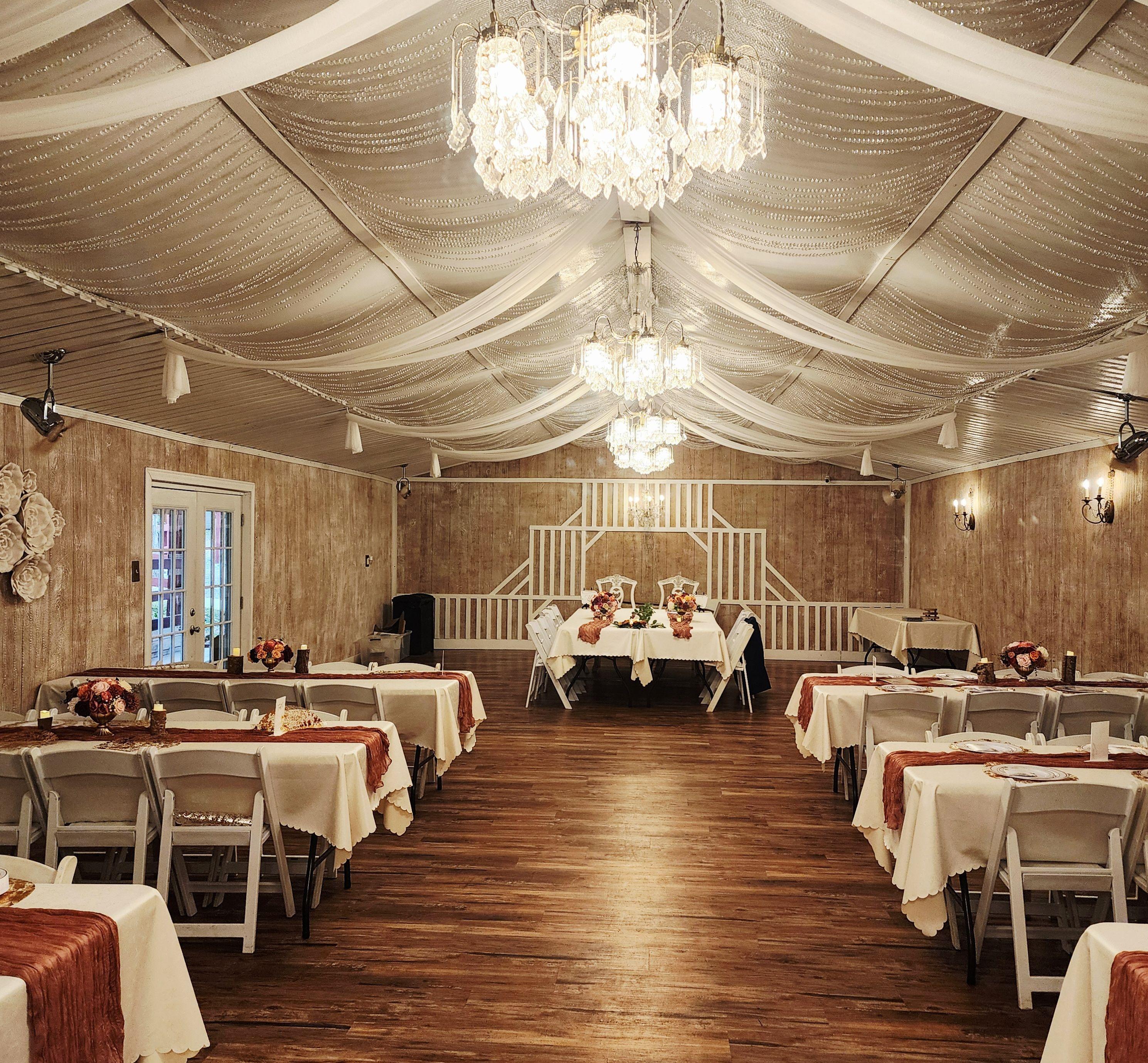 ● Seats up to 150 guests ● Chandeliers ● Heating ● Air conditioning ● Couples table ● Tablecloths ● Bluetooth speaker ● Full kitchen
