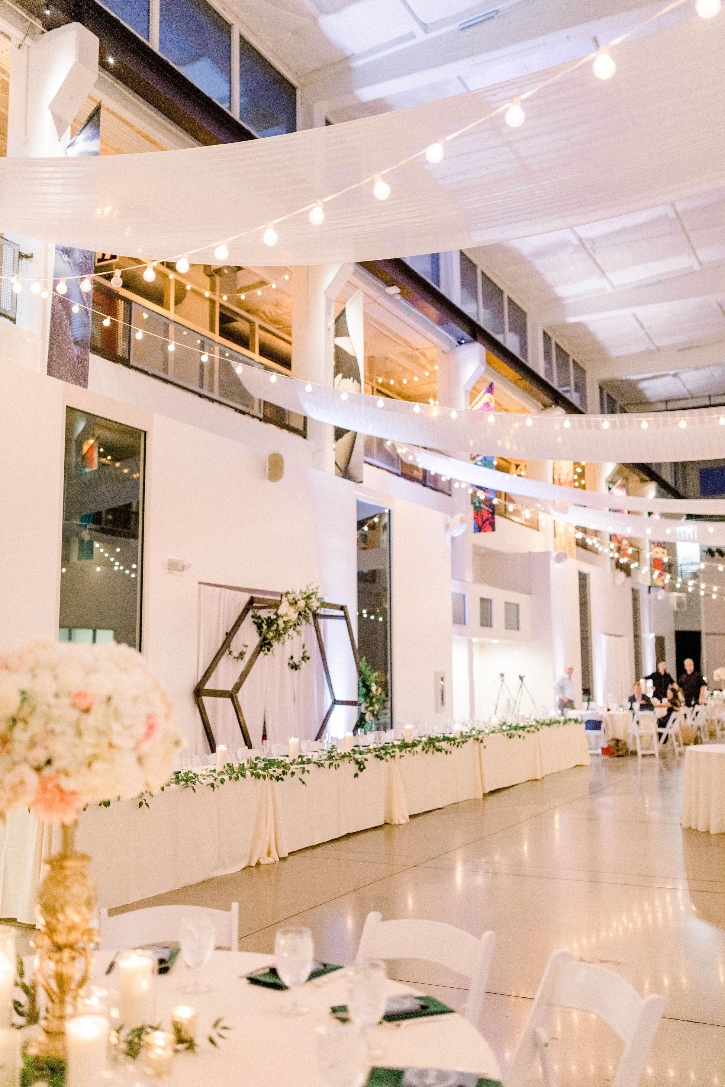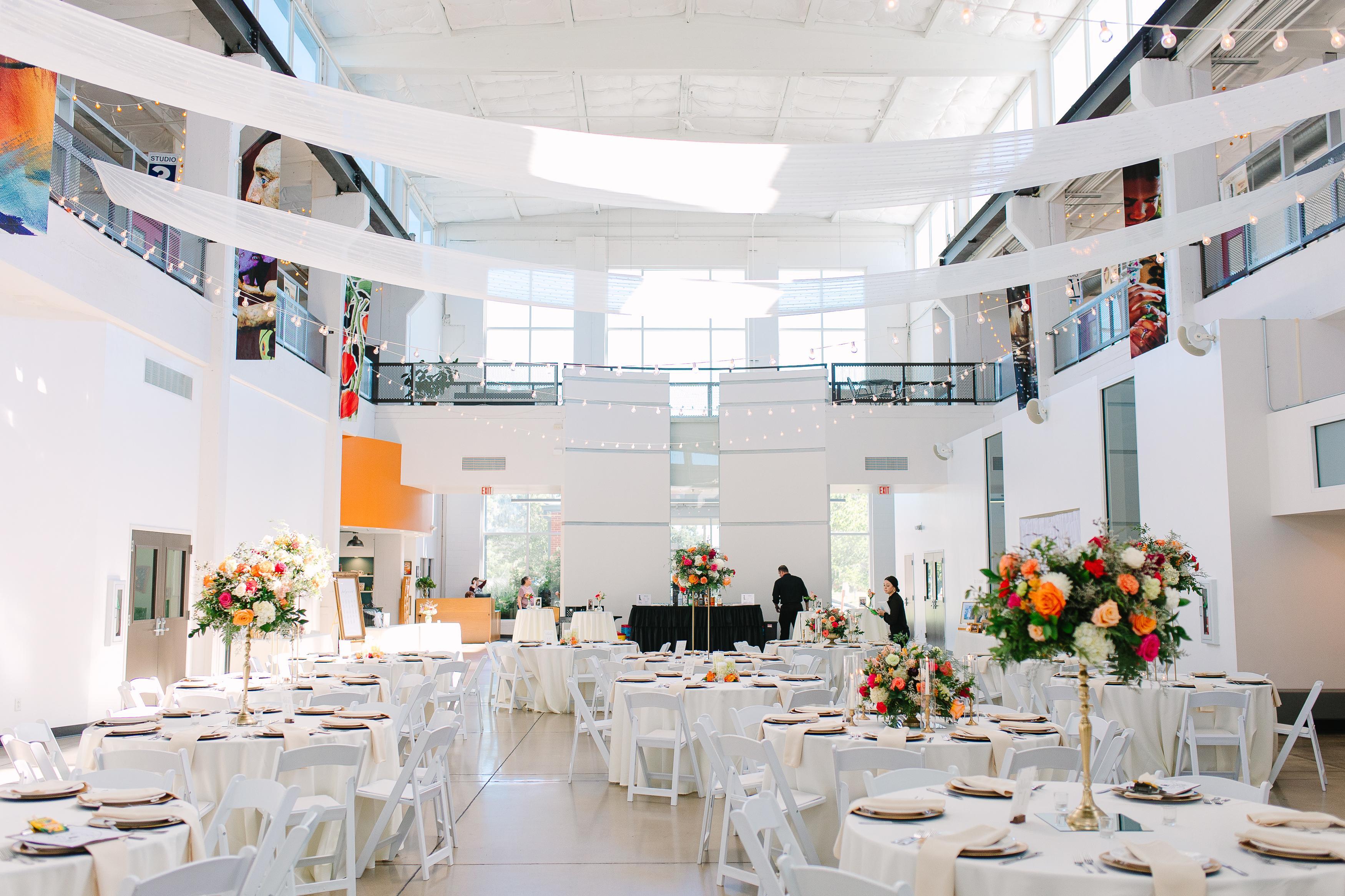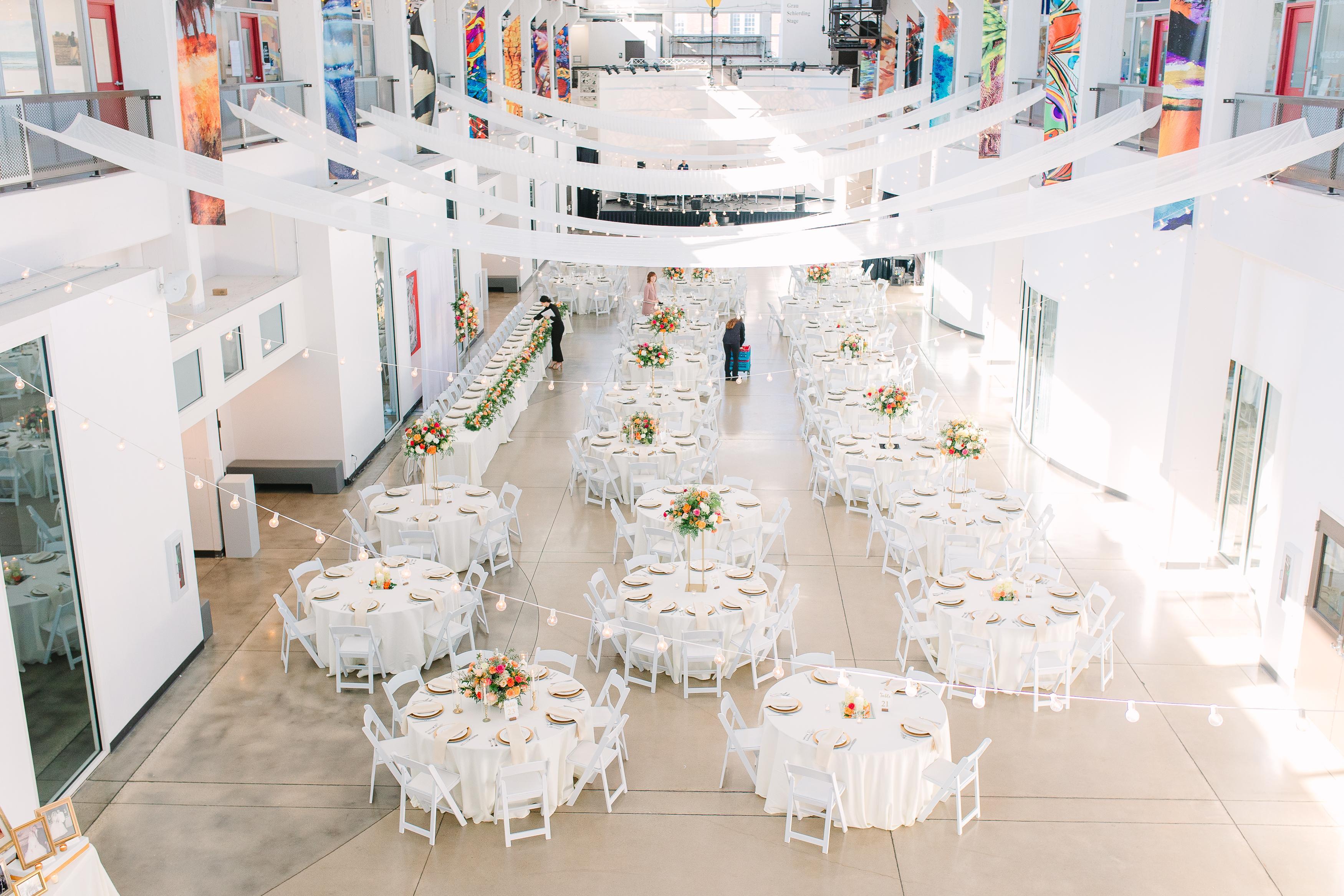 This space features 8000+ square feet with brushed concrete floors. Offering 75-foot ceilings, this is an ideal safe space for ceremonies, receptions, and parties.