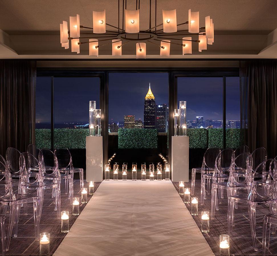 The Penthouse Ballroom, comfortably outfitted for ceremony or reception, offers spectacular 360 views of Atlanta from its perch on the 50th floor.