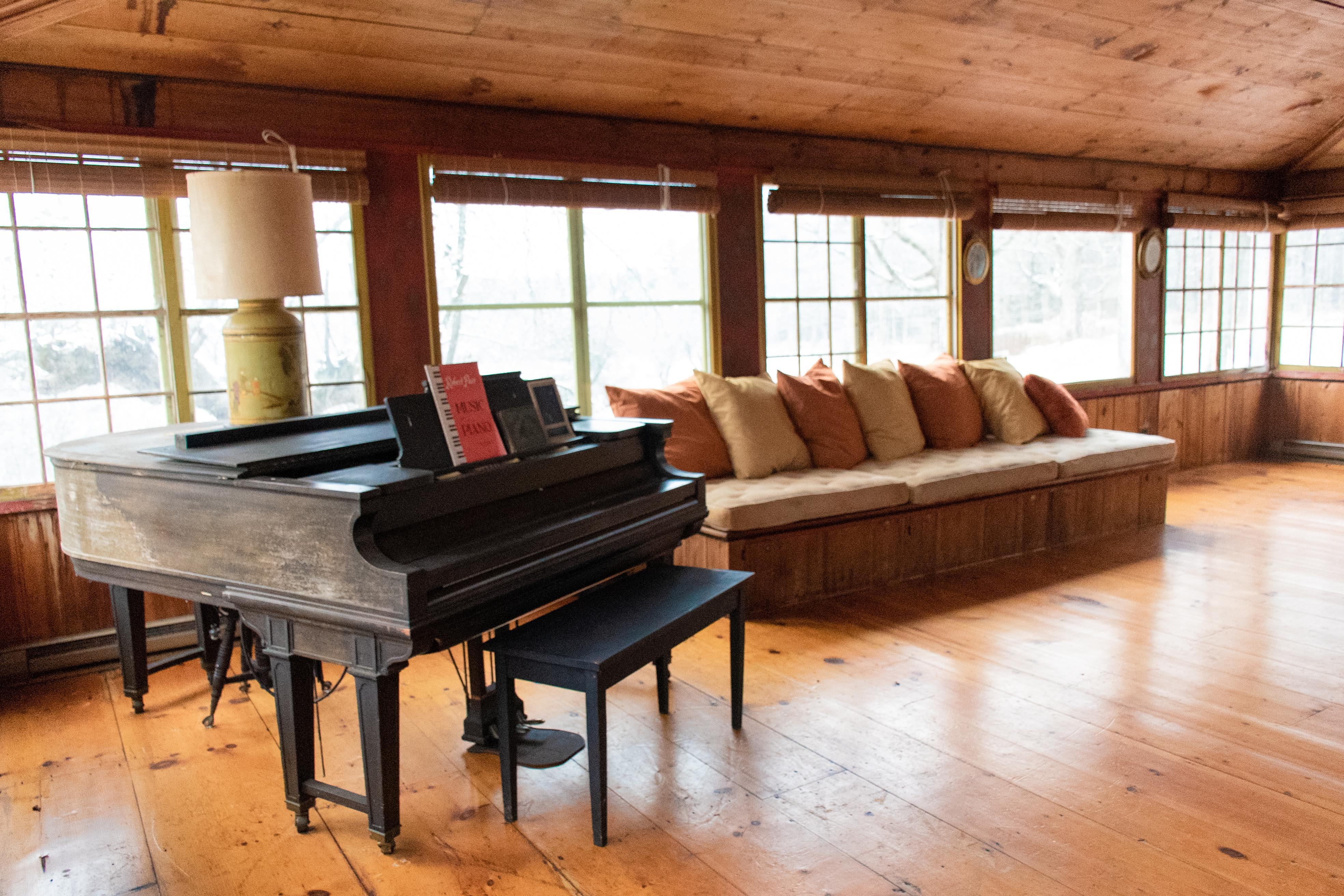 Fireplace, window seating, use of piano.