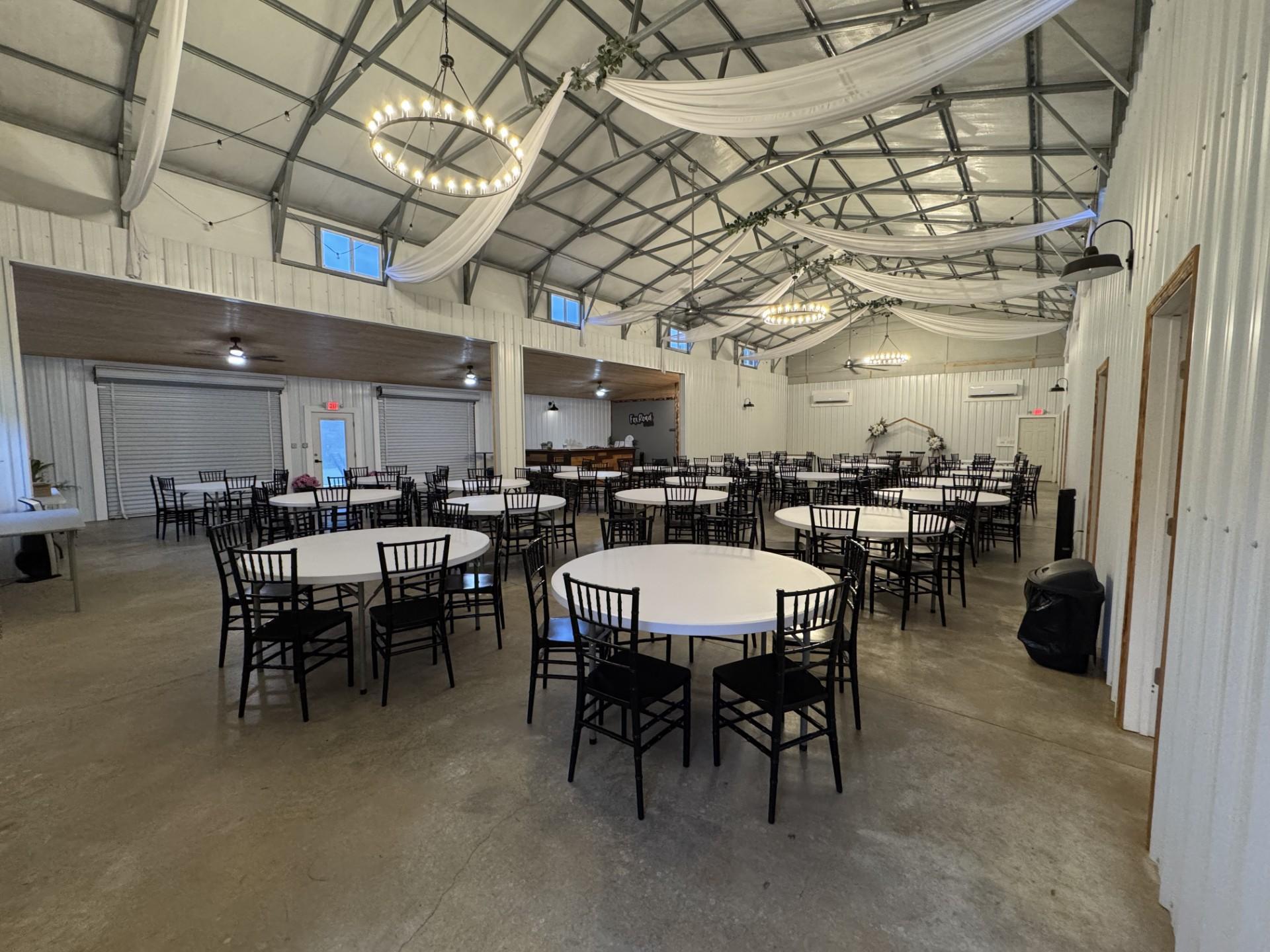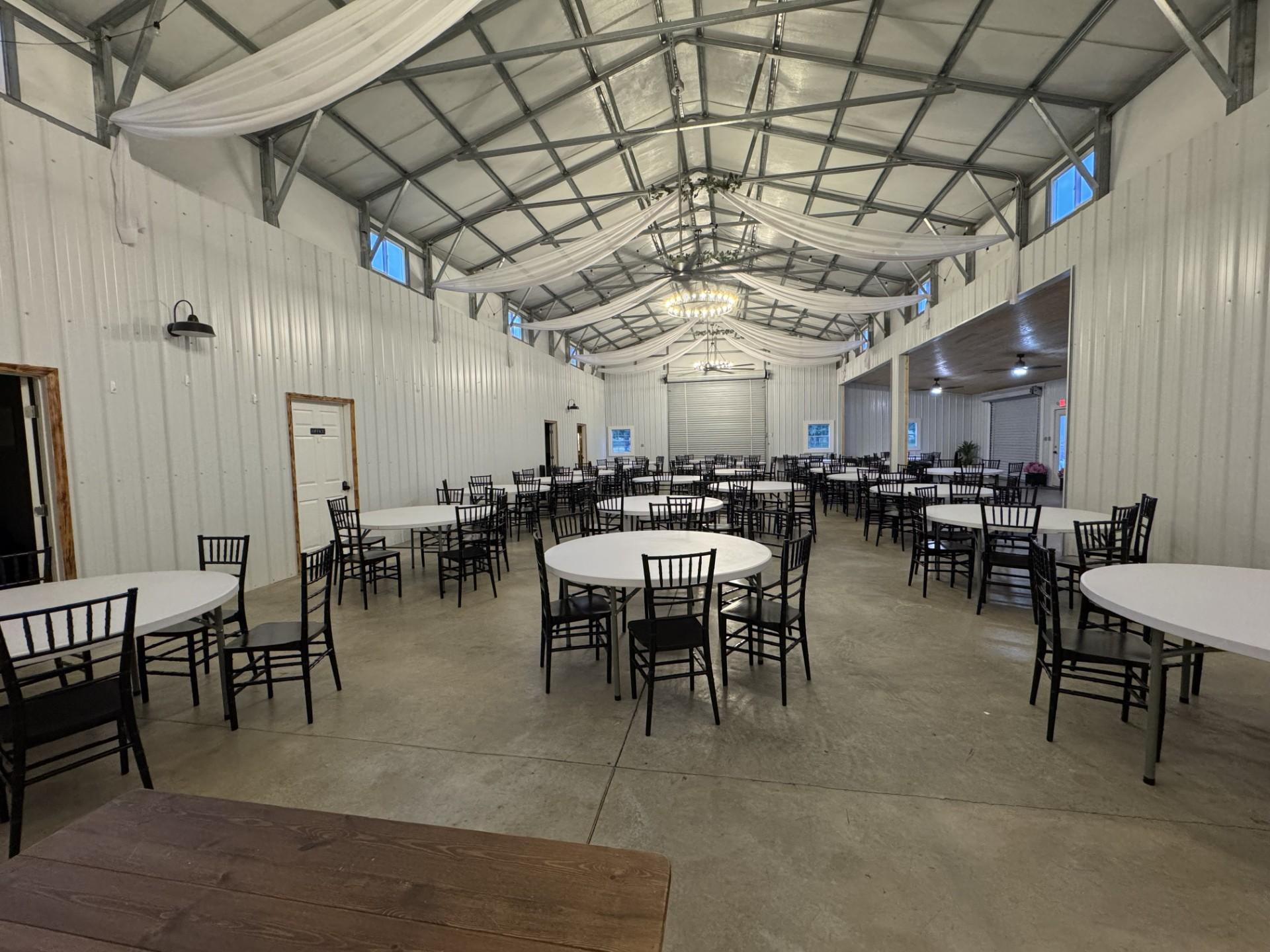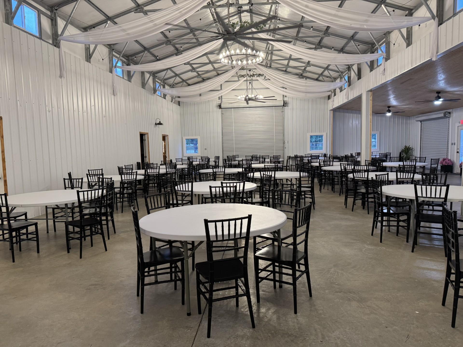 -5' round tables (25) -150 black chiavari chairs -sweetheart table with 2 chairs -dimmable string lighting and chandeliers -custom built bar -(2) unisex bathrooms