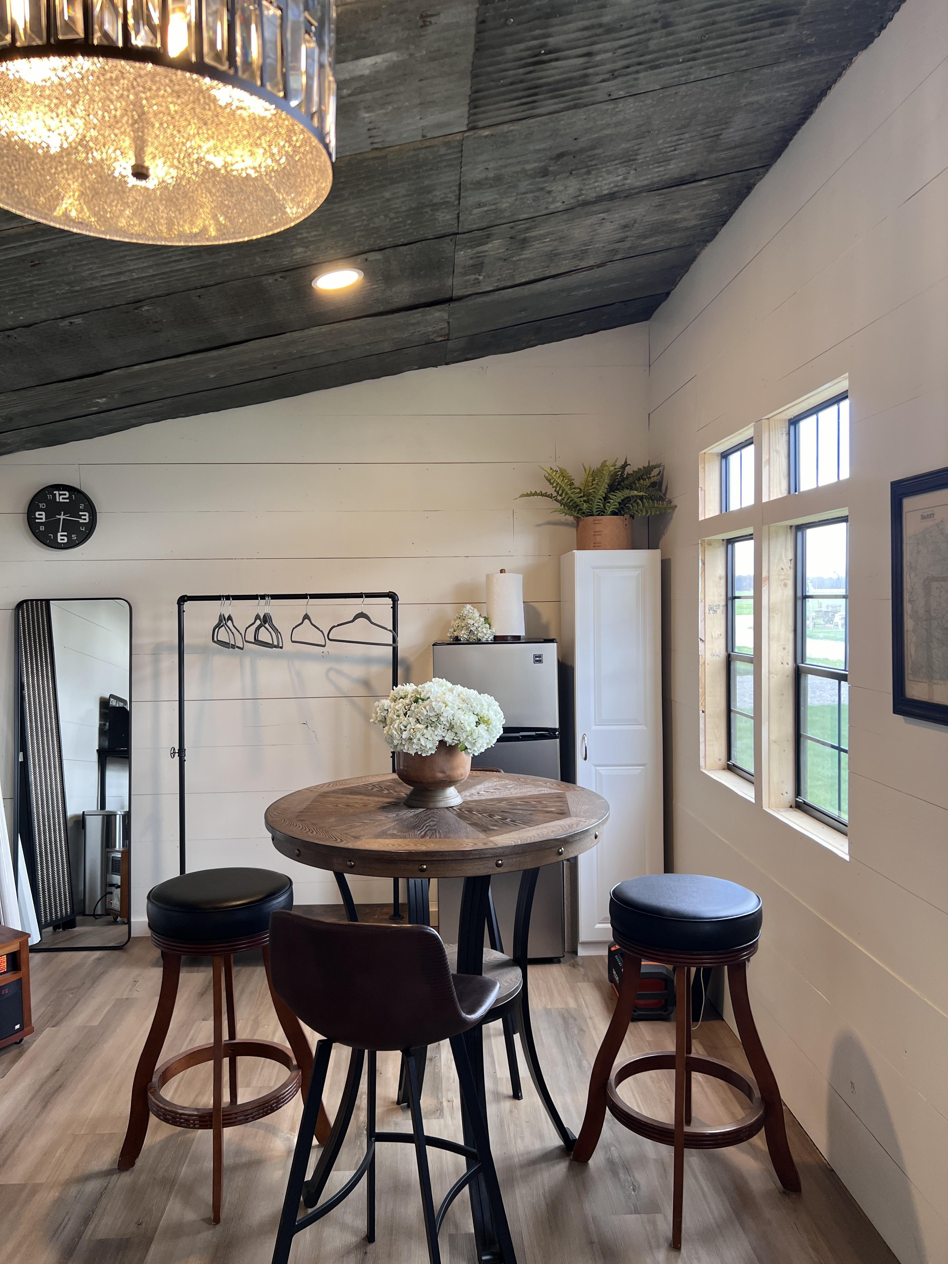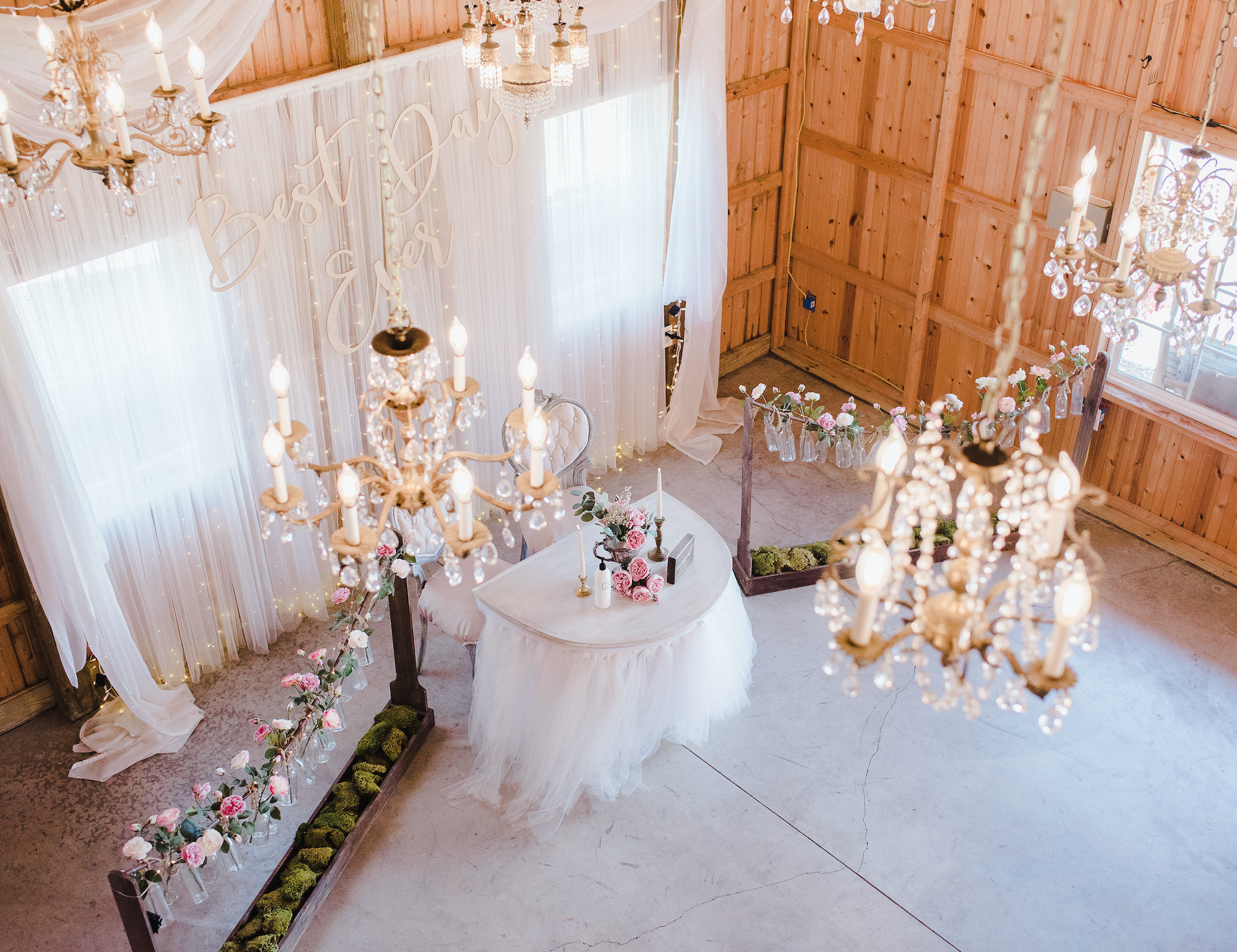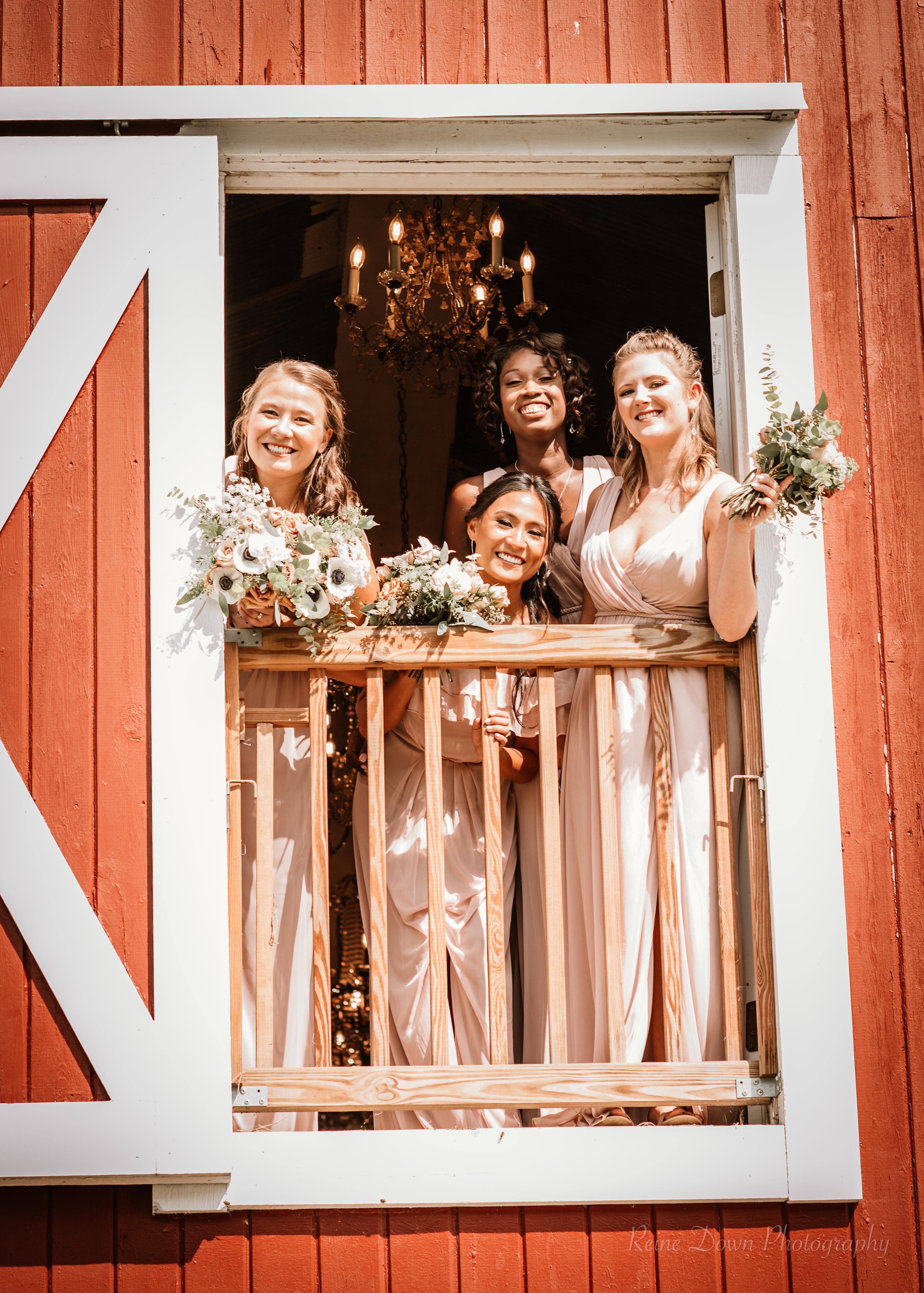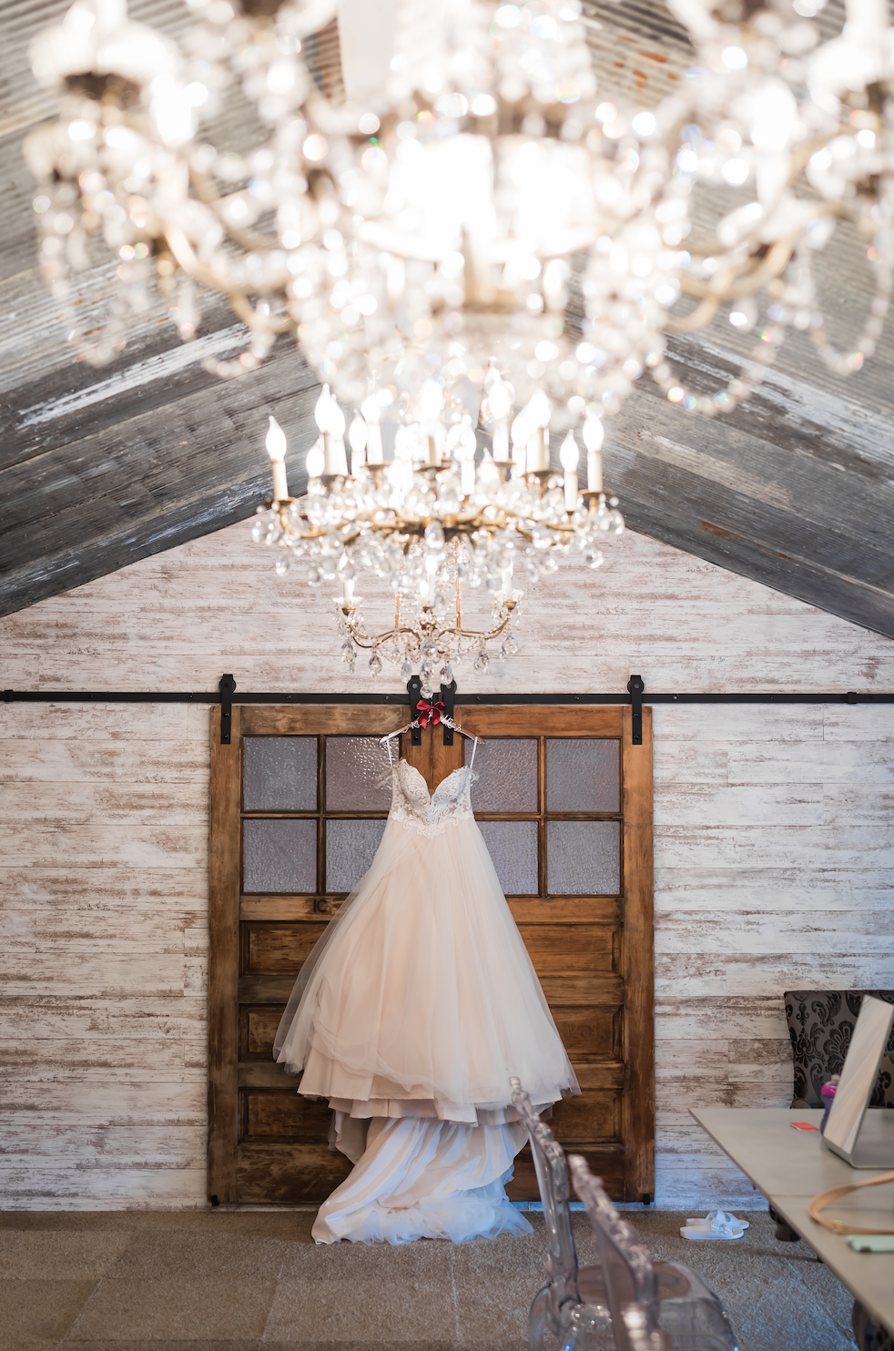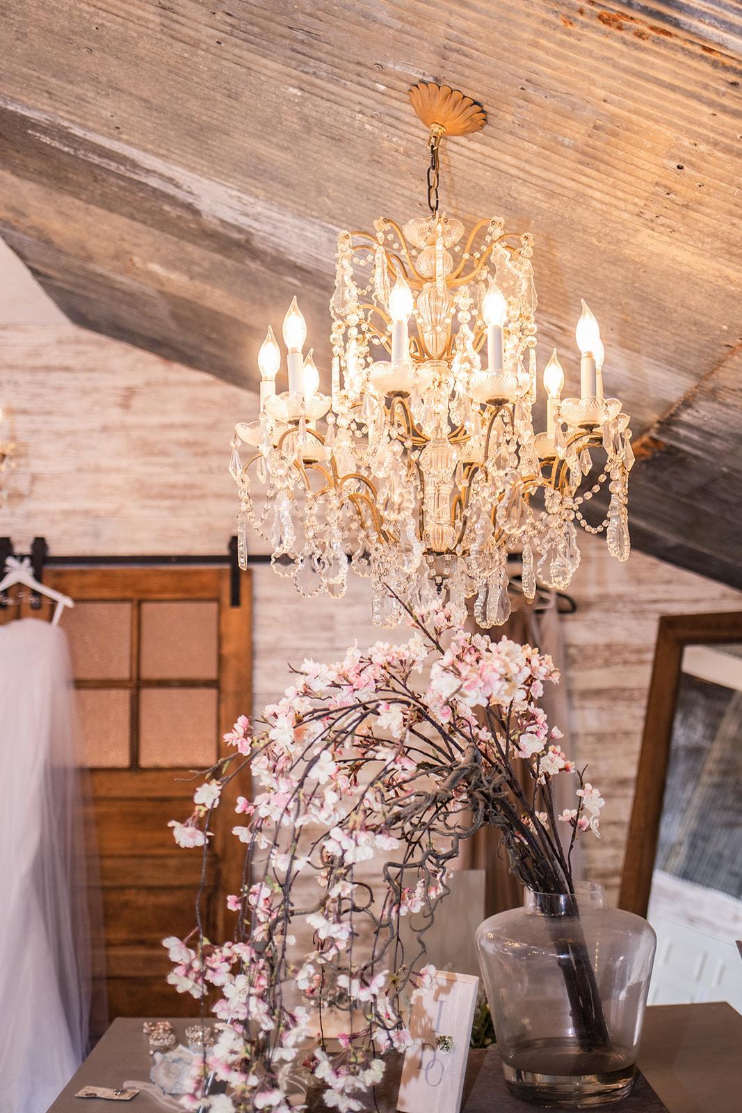the upstairs bridal suite loft is a beautiful space for you and your girls to get ready and to have photos taken. it features the most beautiful selected chandeliers in all the barn. it has plenty of room to get ready and to relax and chill before you walk down the aisle.